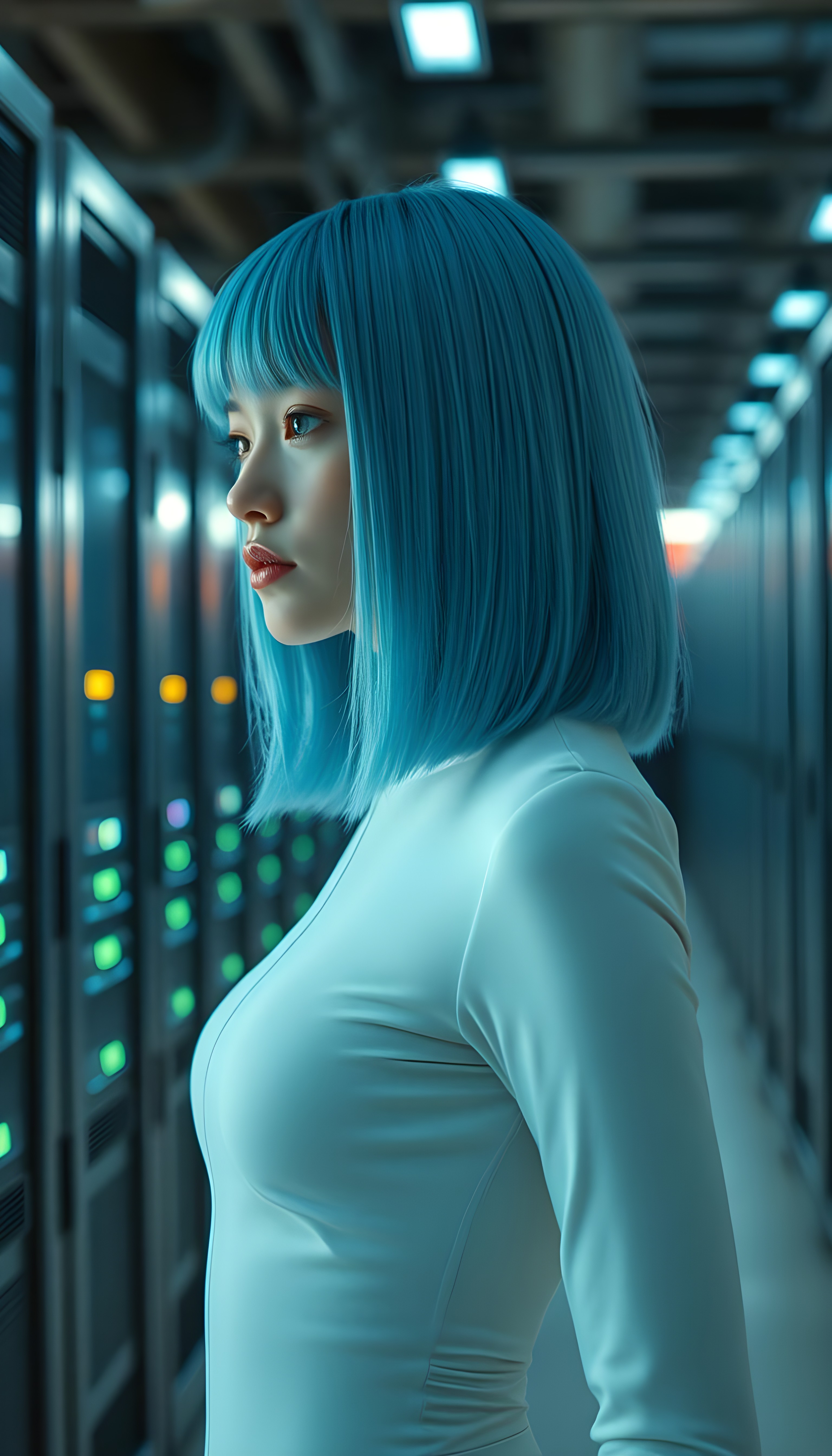 A young girl in a white, skin-tight, closed suit. The suit emphasizes her perfect feminine body. She has straight, silky neon blue hair that reaches to her shoulders, bangs and bob cut. In the background are many servers, lights.