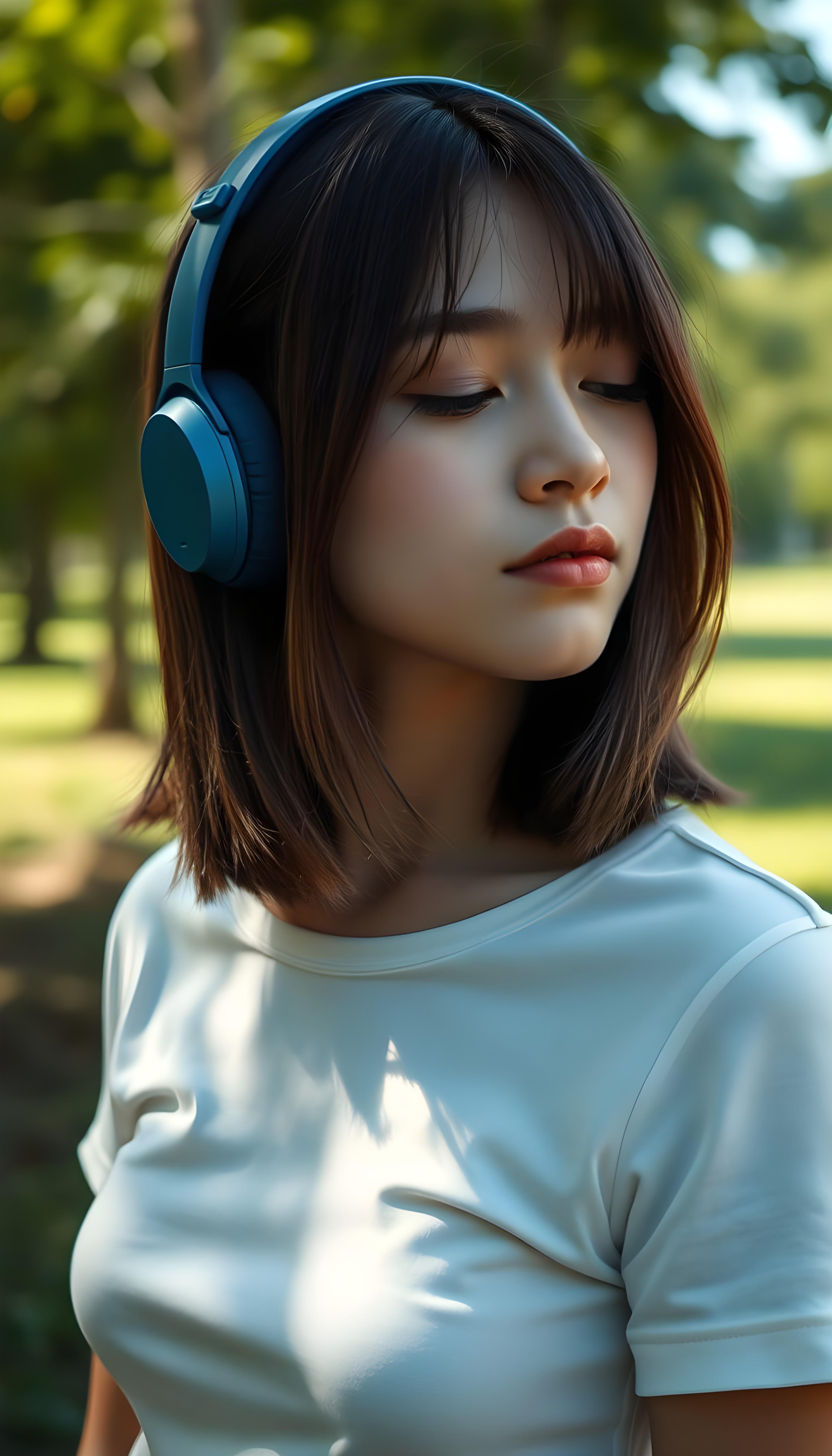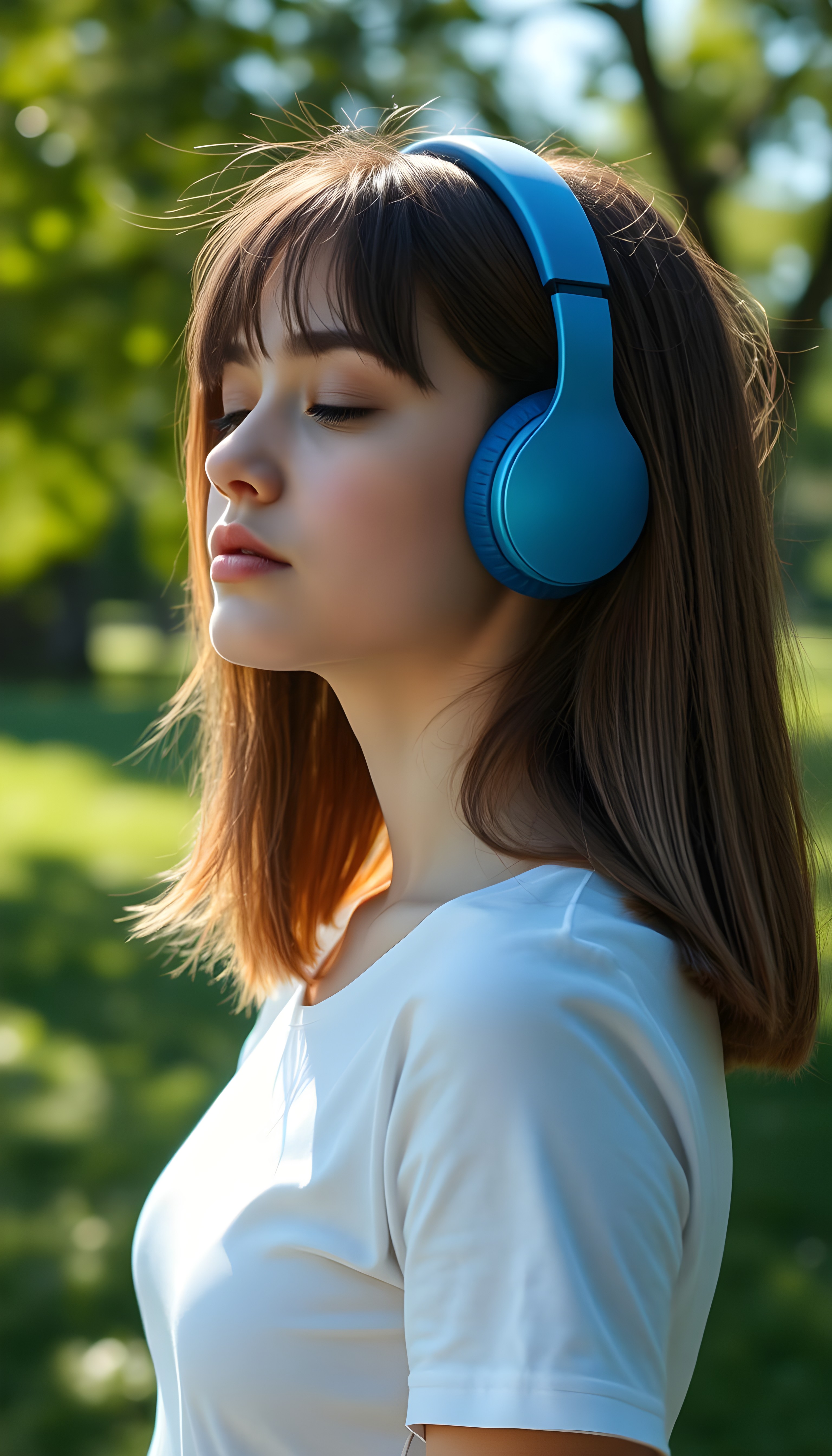 A young girl is standing in a green park. She is wearing a tight white T-shirt. She has large blue headphones on and is listening to music with her eyes slightly closed. The sun is shining on her flawless face. The image appears peaceful. Soft, straight hair falls down her back in exact the same length, blow out bob cut.