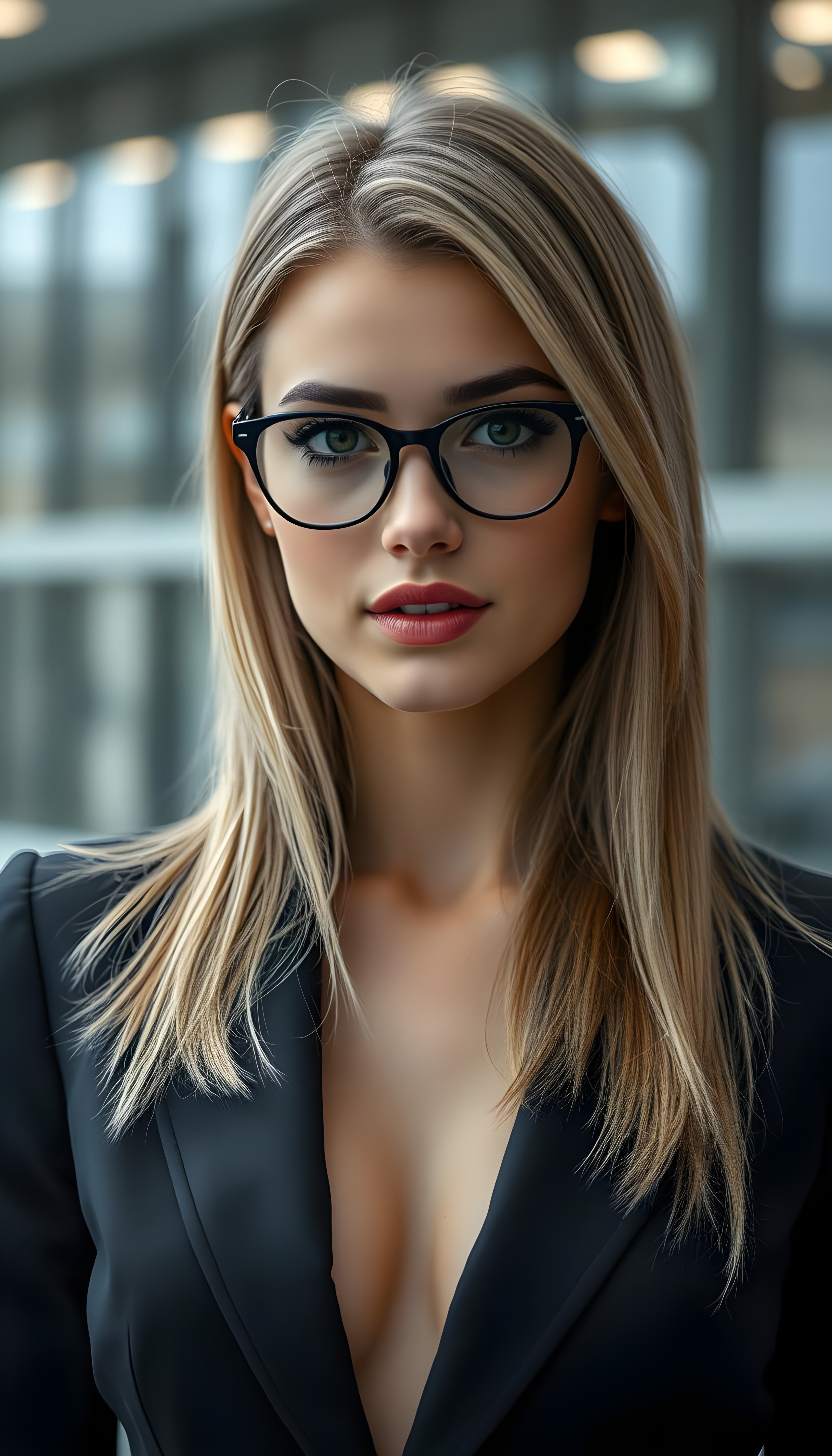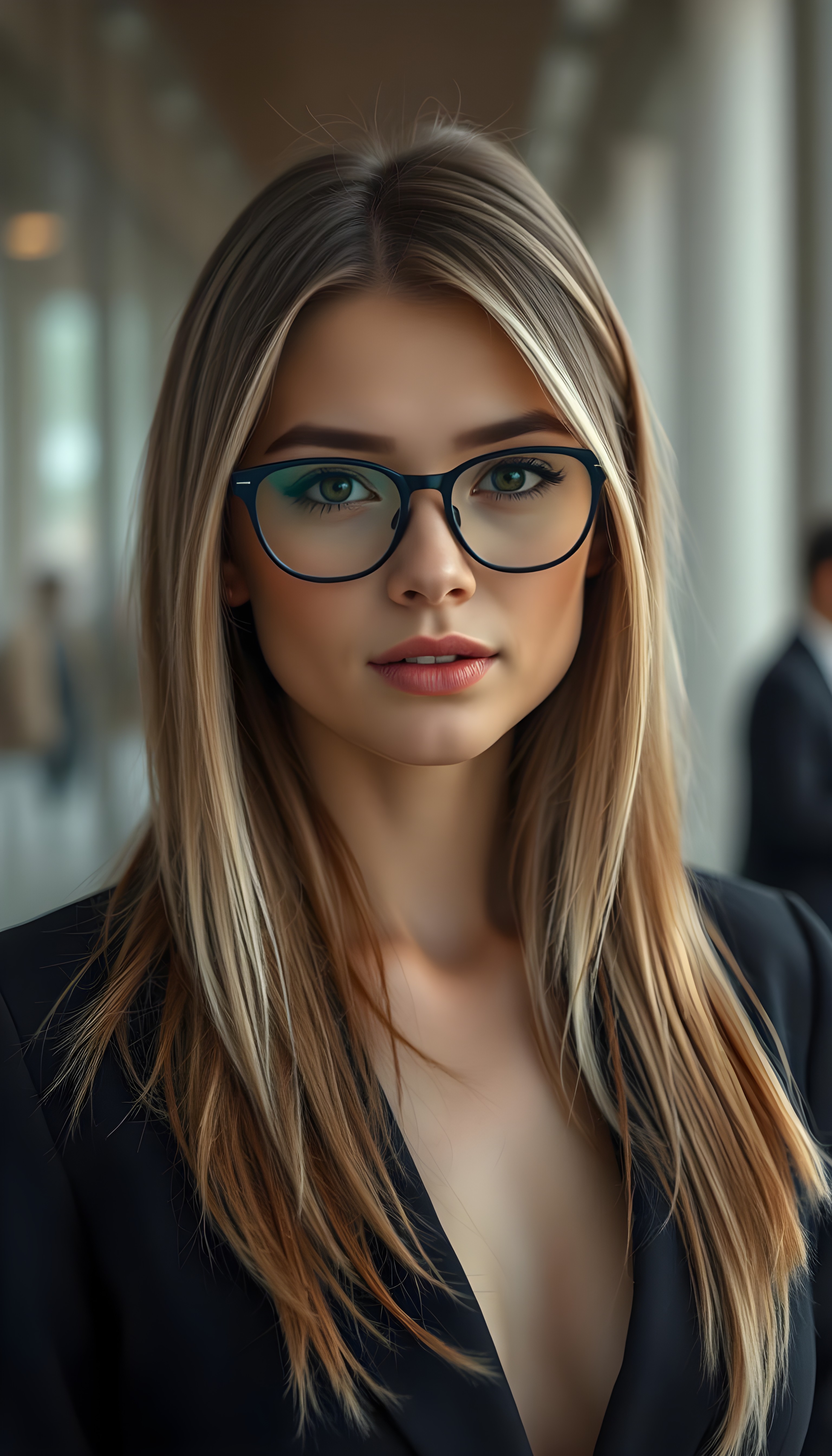 A young, pretty attorney with shoulder long straight golden blond hair and dark highlights, flawless skin, deep black, round, large, shiny eyes, full, plump lips, white teeth, a symmetrical, small nose, perfect, fine eyebrows, eyeliner, porcelain-colored skin, wearing a black, modern business suit. She looks seductively into the camera. She wears modern, deep blue glasses. Realistic, 4K, HDR. In the backdrop is a modern university, perfect female curved body, busty.