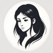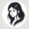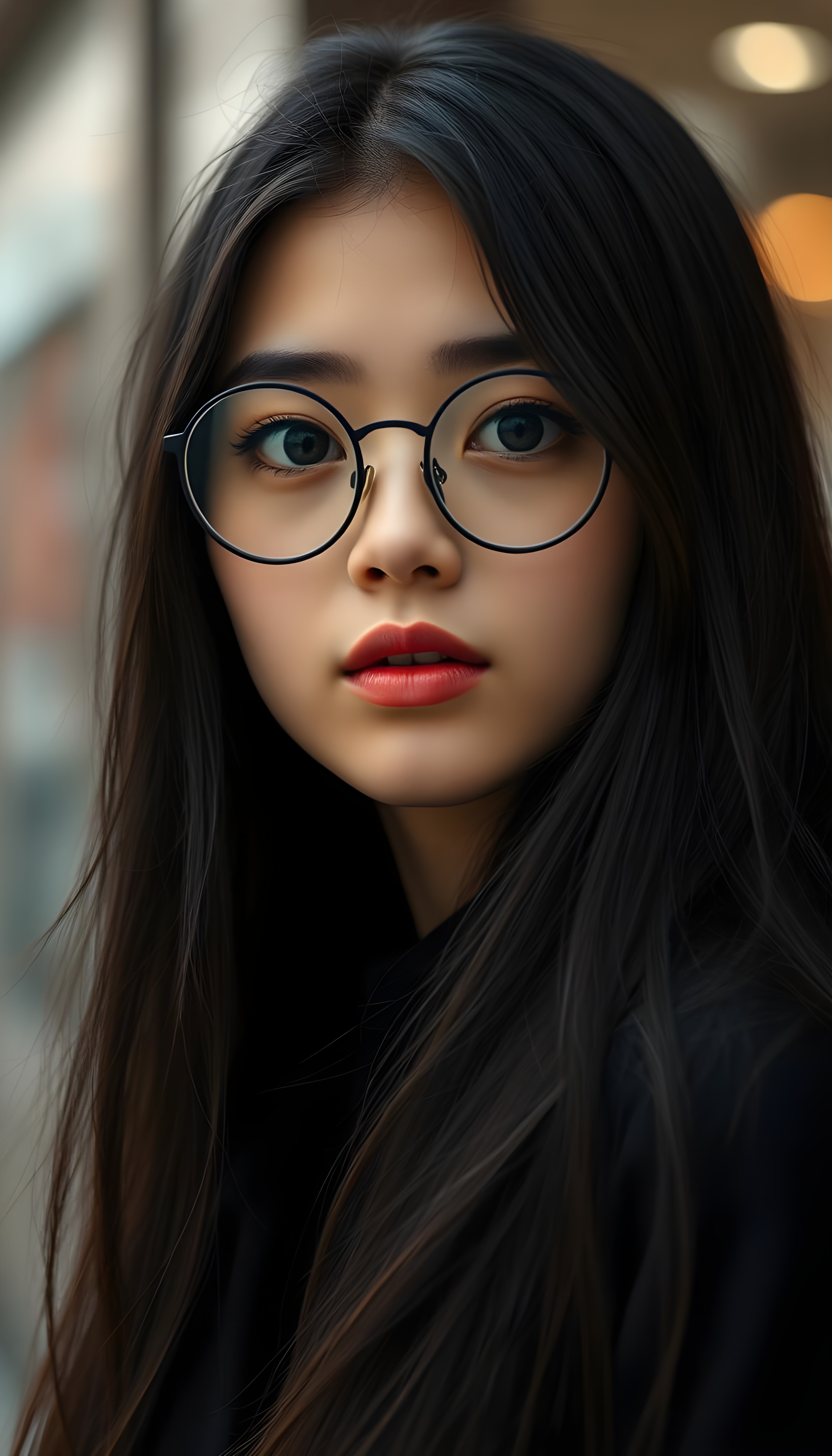 A young woman with long, fine black hair, full, plump lips, deep black, round, large eyes, black, detailed eyebrows, long eyelashes, wearing round, black glasses. Her round head is slightly tilted and gently framed by her hair.