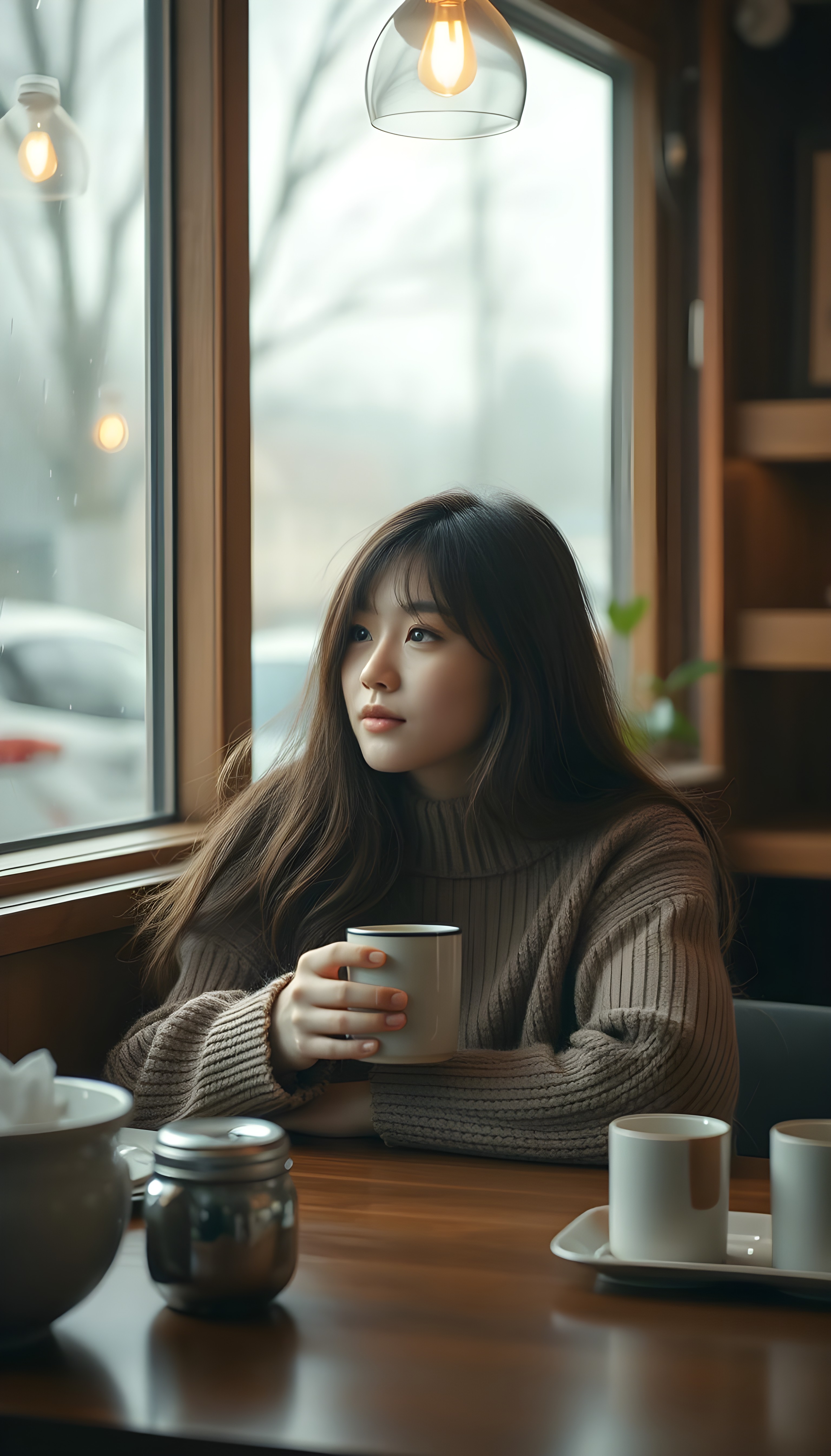 In a cozy café with a wooden interior, a girl sits at a table, drinking coffee from a mug and watching the rain through the window. She is wearing a fine, brown wool sweater, long, sof hair.