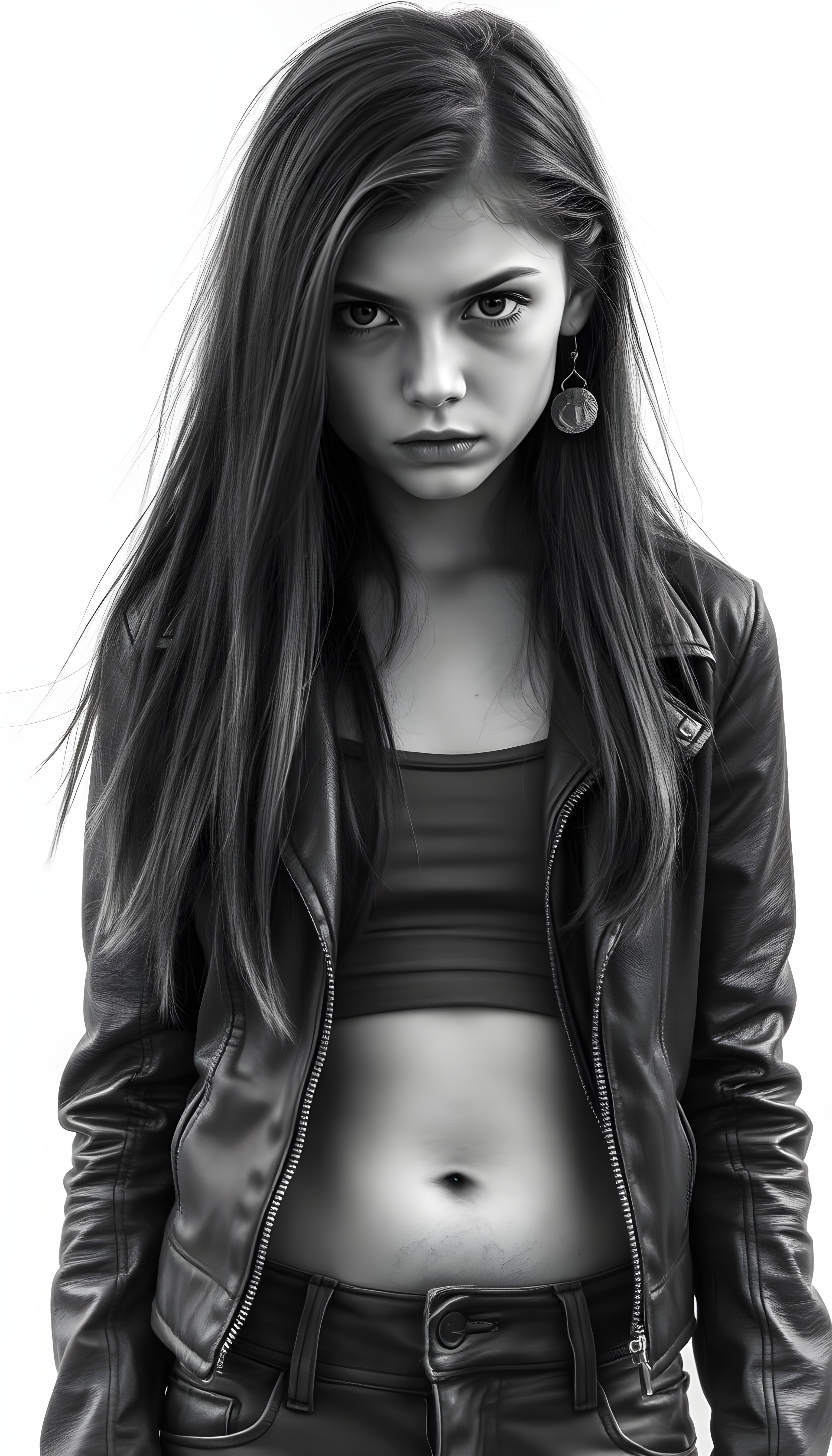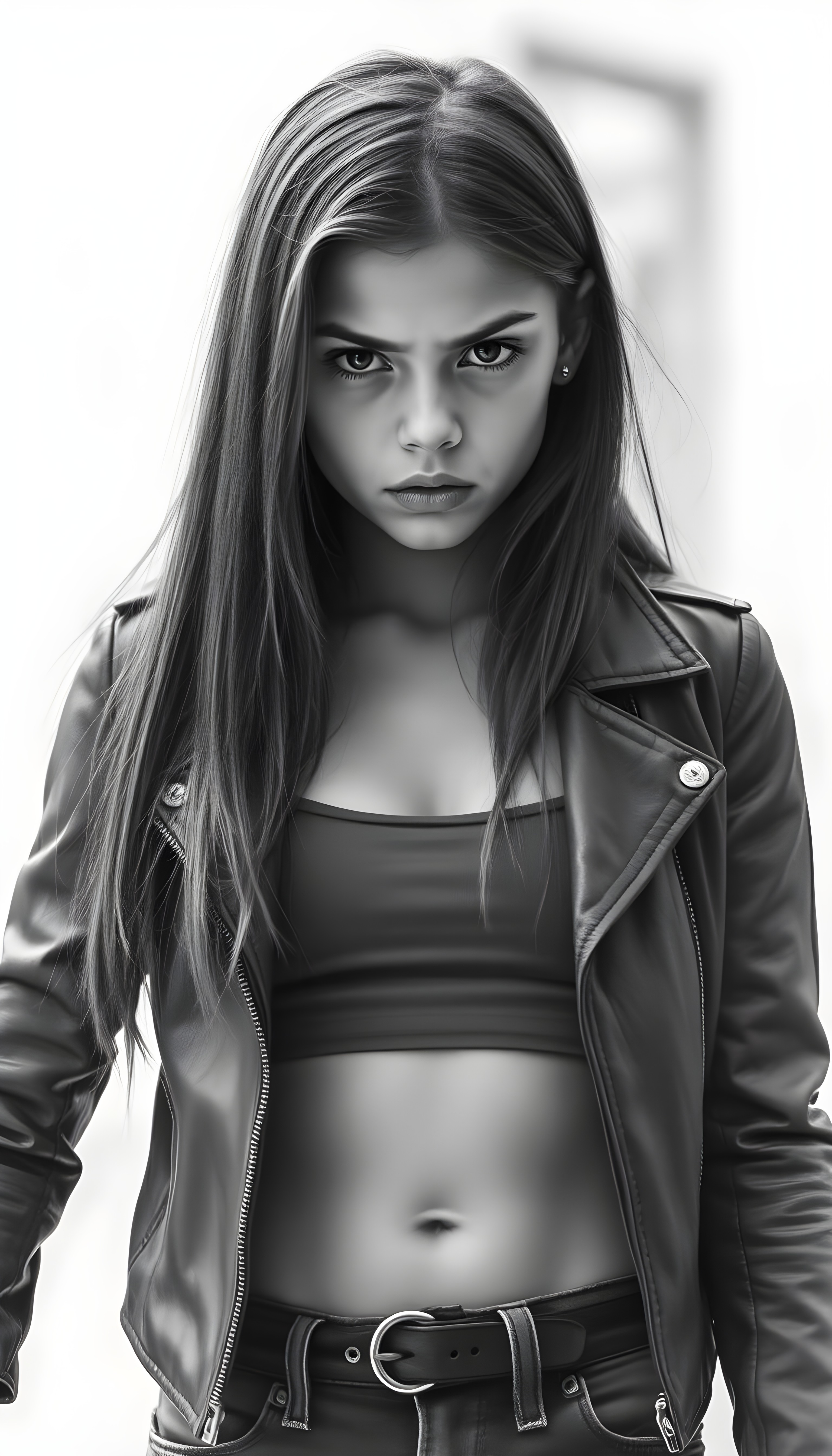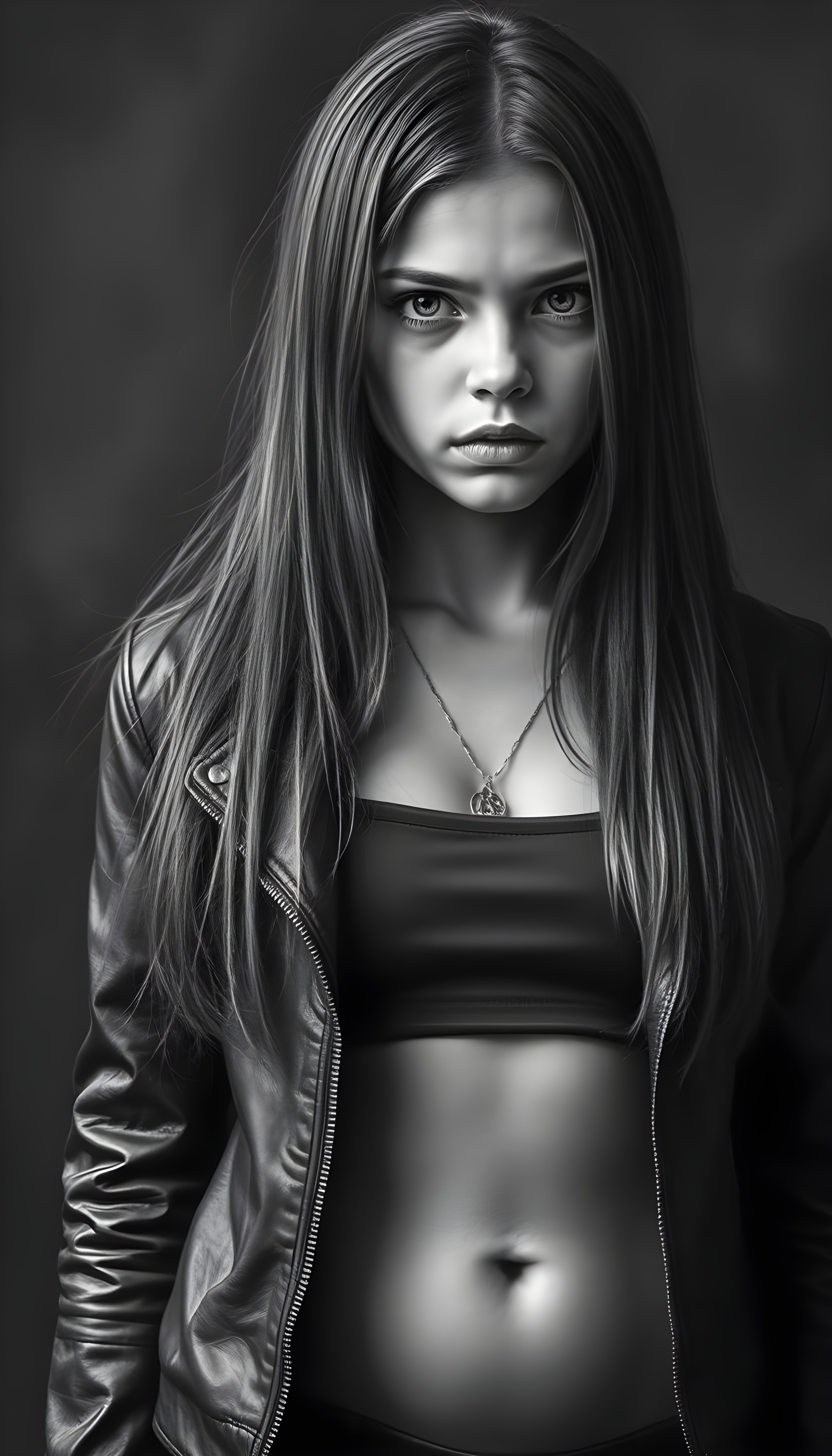 a black and white realistic hand drawing from a young girl, long straight hair, full lips, dark round eyes, She is wearing an open leather jacket with a short, tight tank top underneath, round belly button, she looks very angry