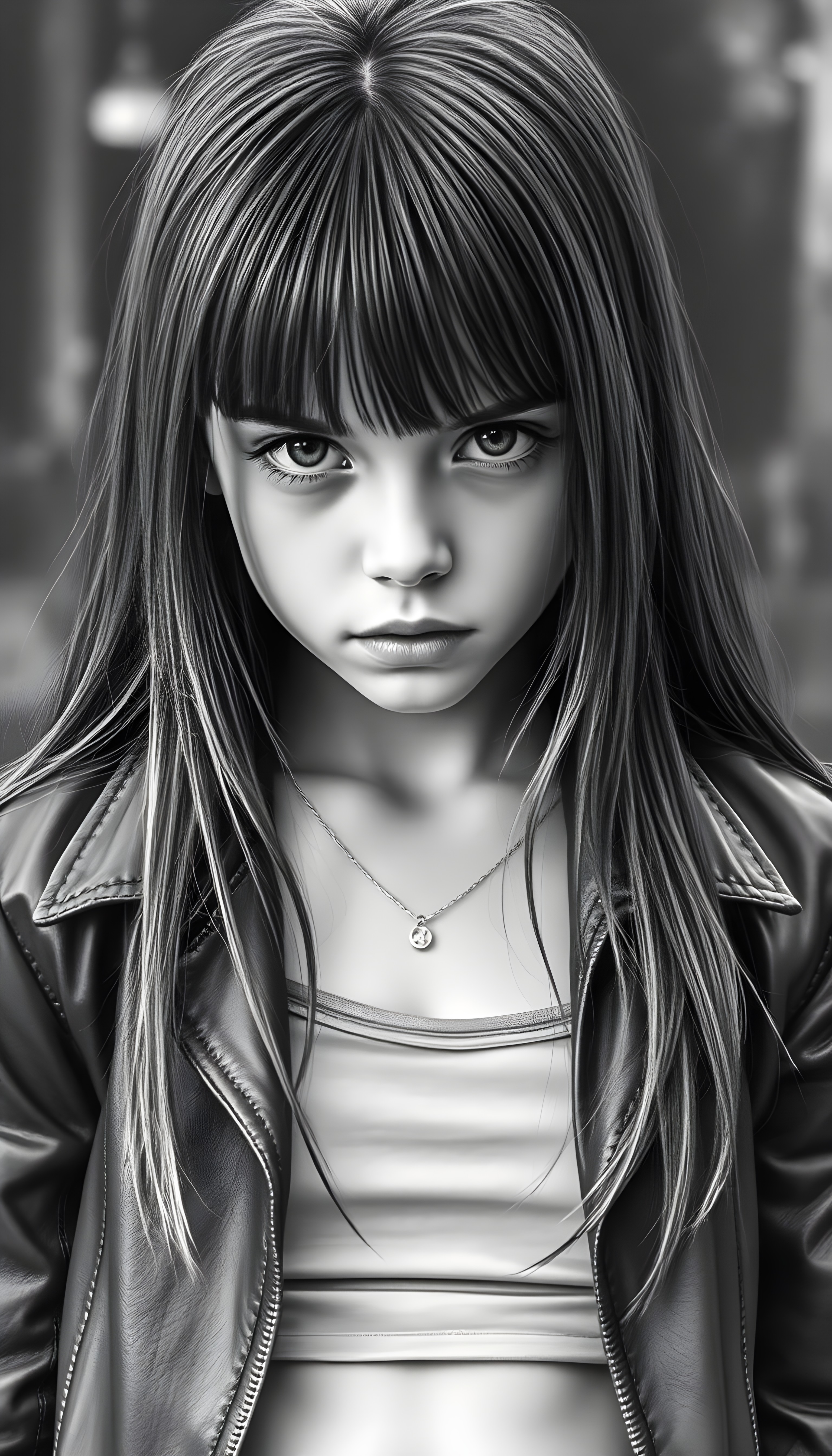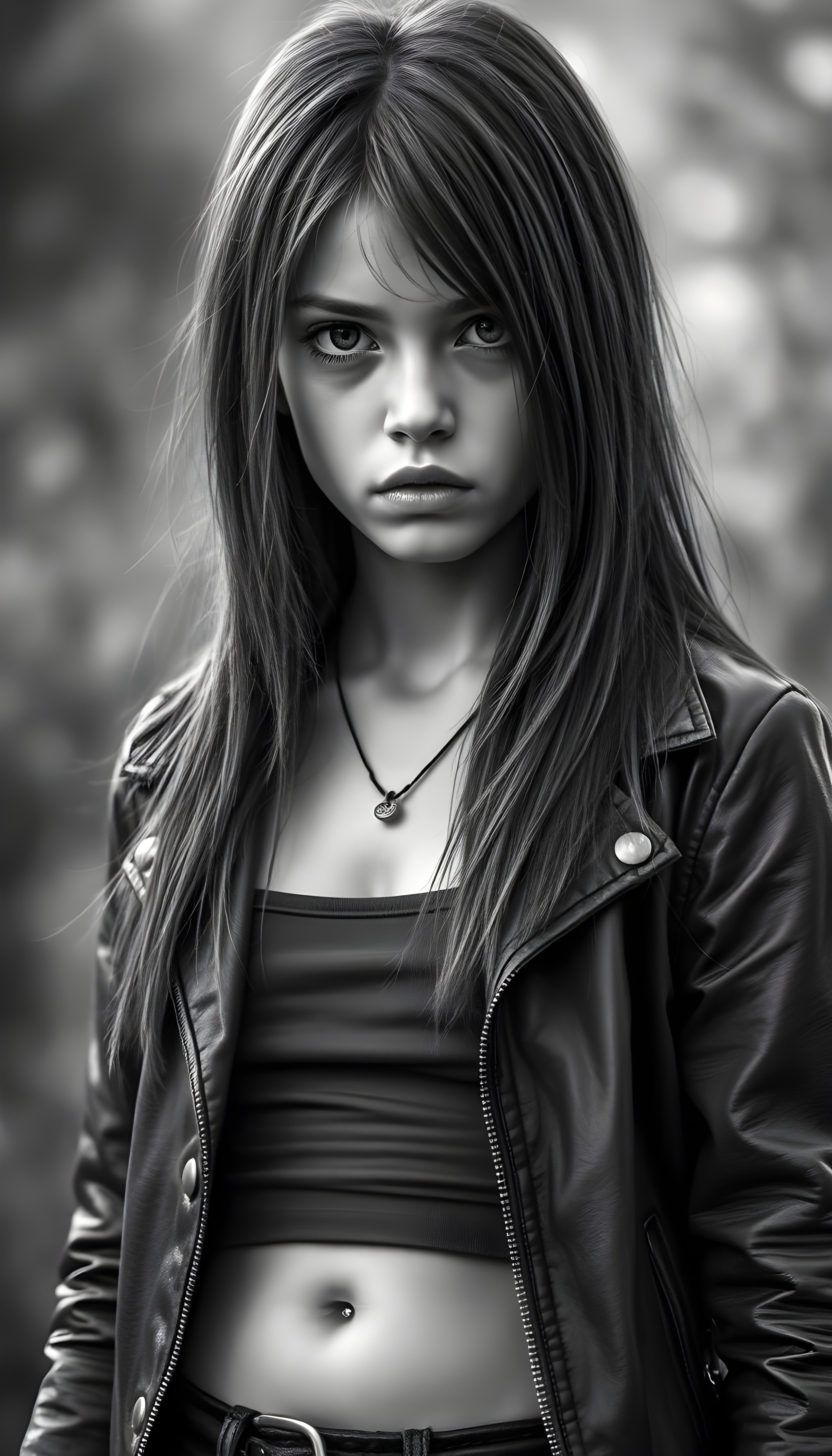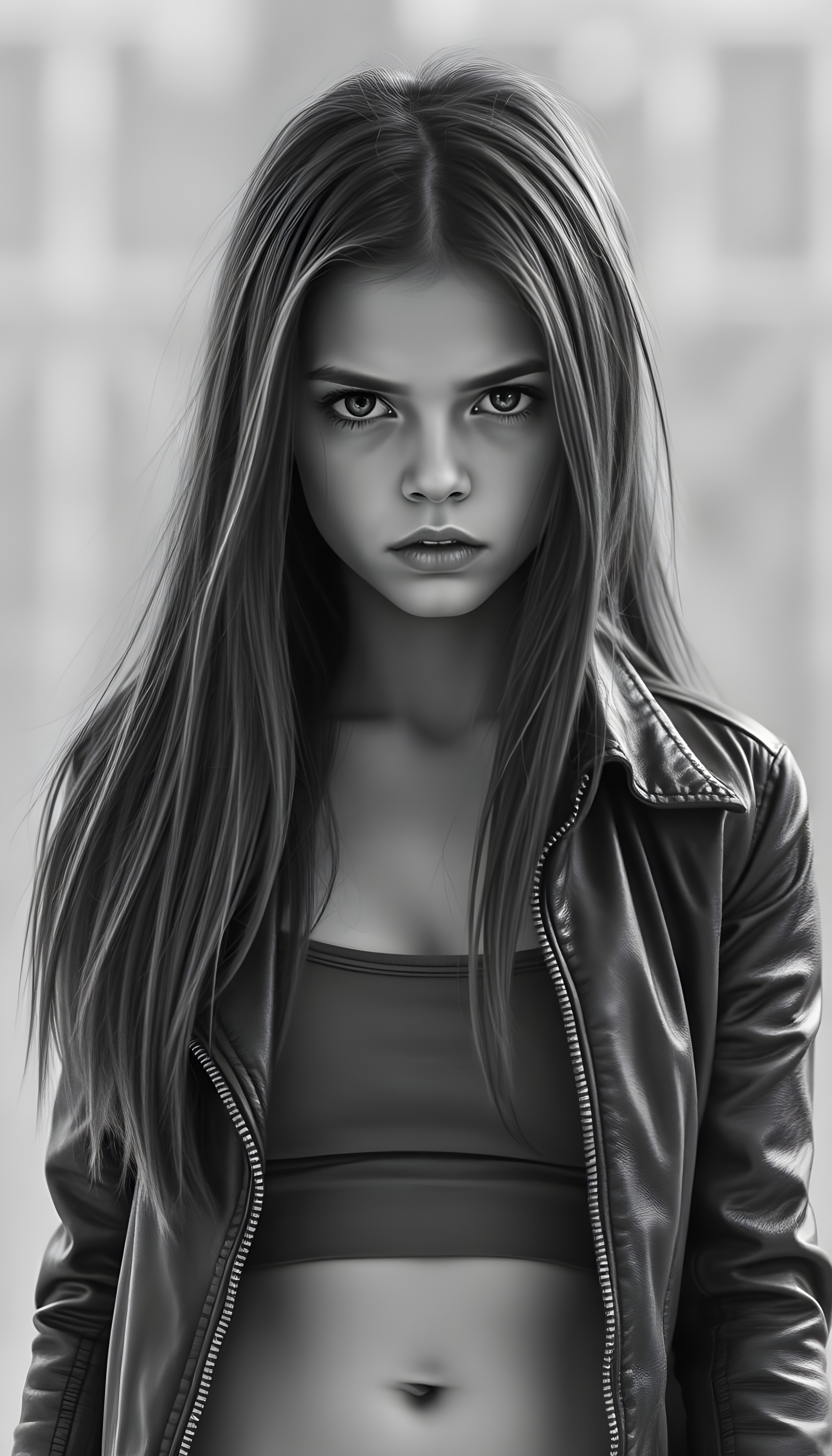 a black and white realistic hand drawing from a young girl, long straight hair, full lips, dark round eyes, She is wearing an open leather jacket with a short, tight tank top underneath, round belly button, she looks very angry