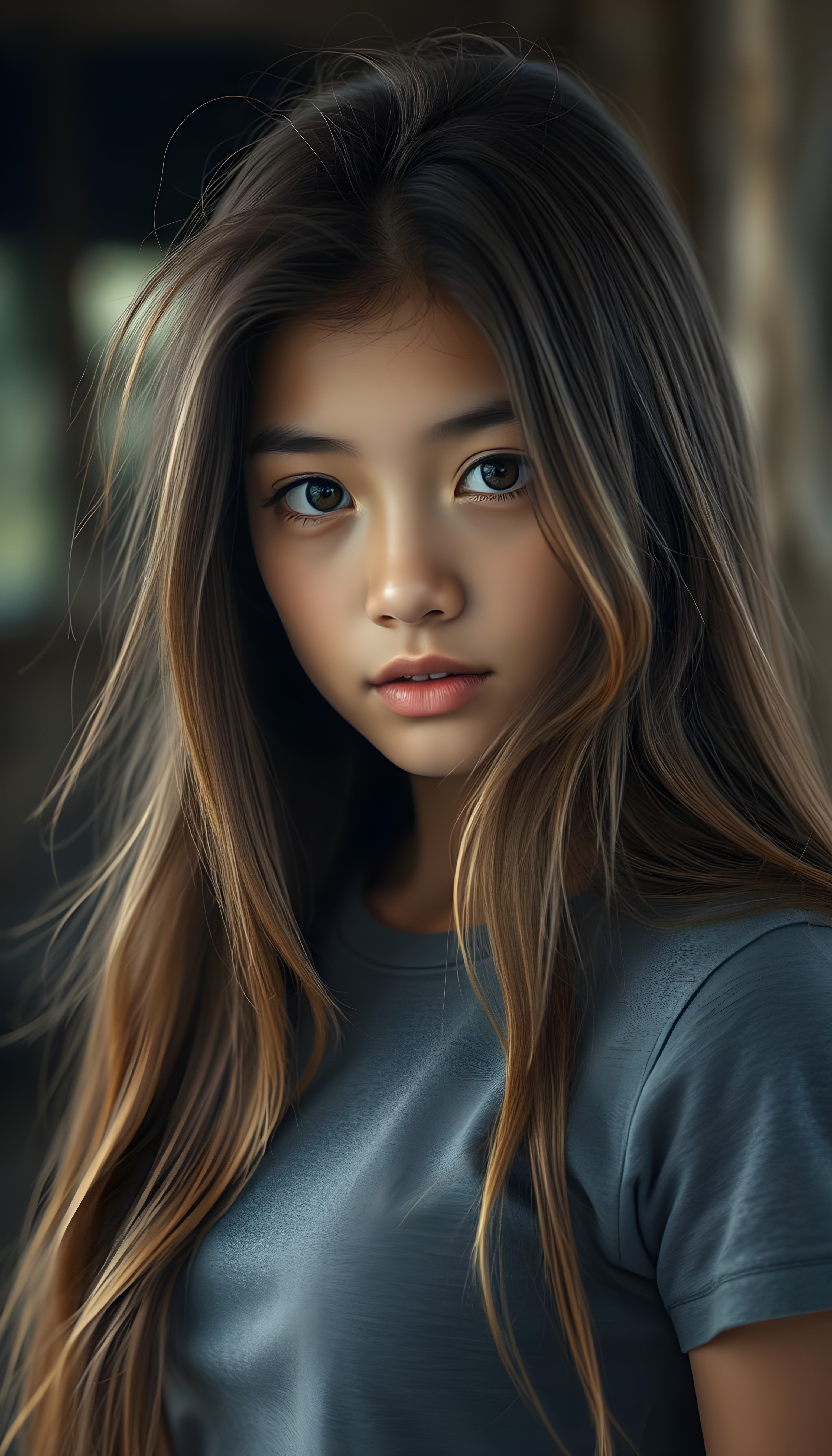 a (((young Indigenous teen girl))) with long, soft flowing, (((straight hair and light brown highlights))), and (((deeply dark round eyes))), her gaze directed towards the viewer, her features exuding an air of (((stunning beauty))) and (((unfading grace))), she wears a grey short, skin tight t-shirt