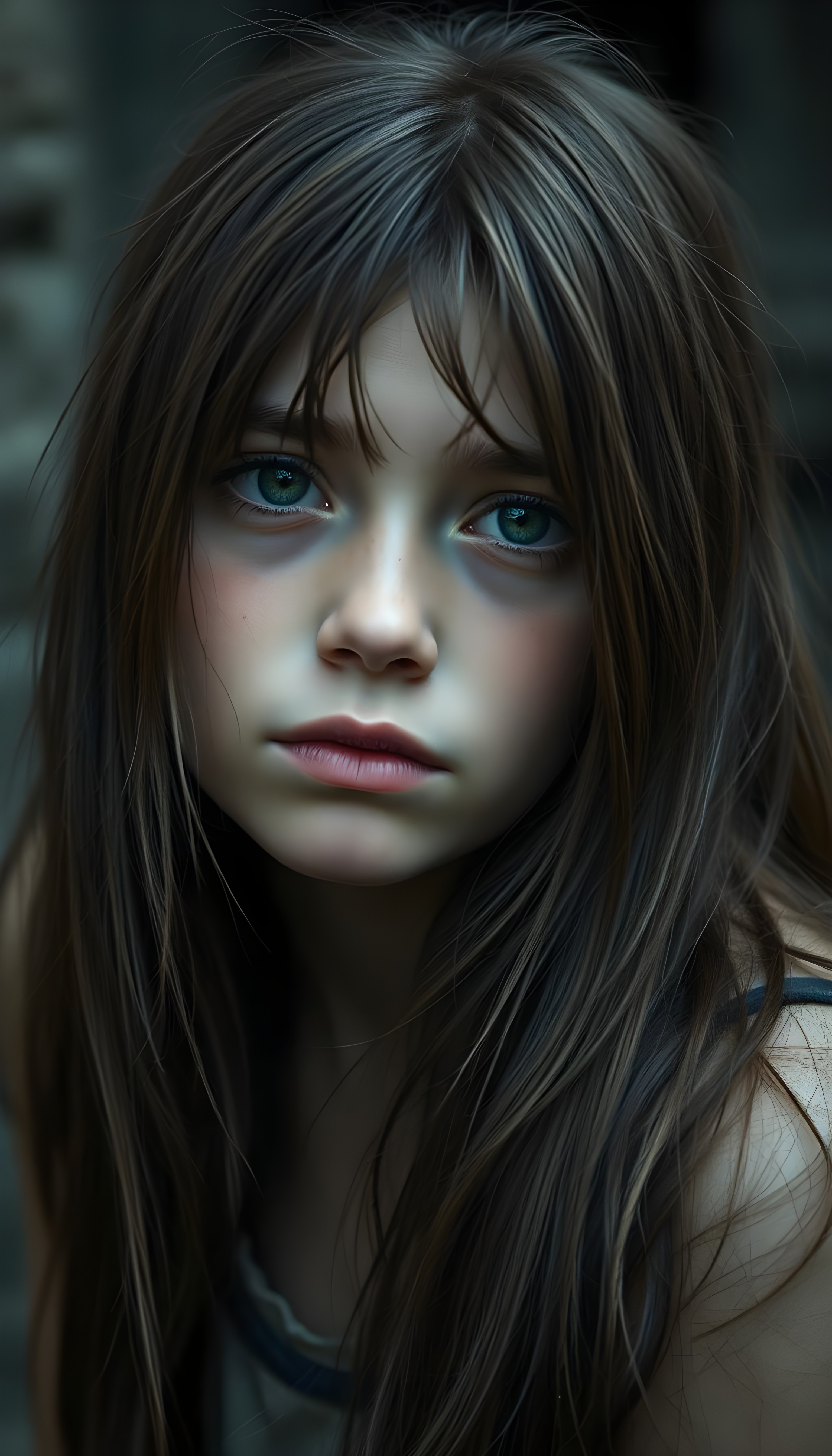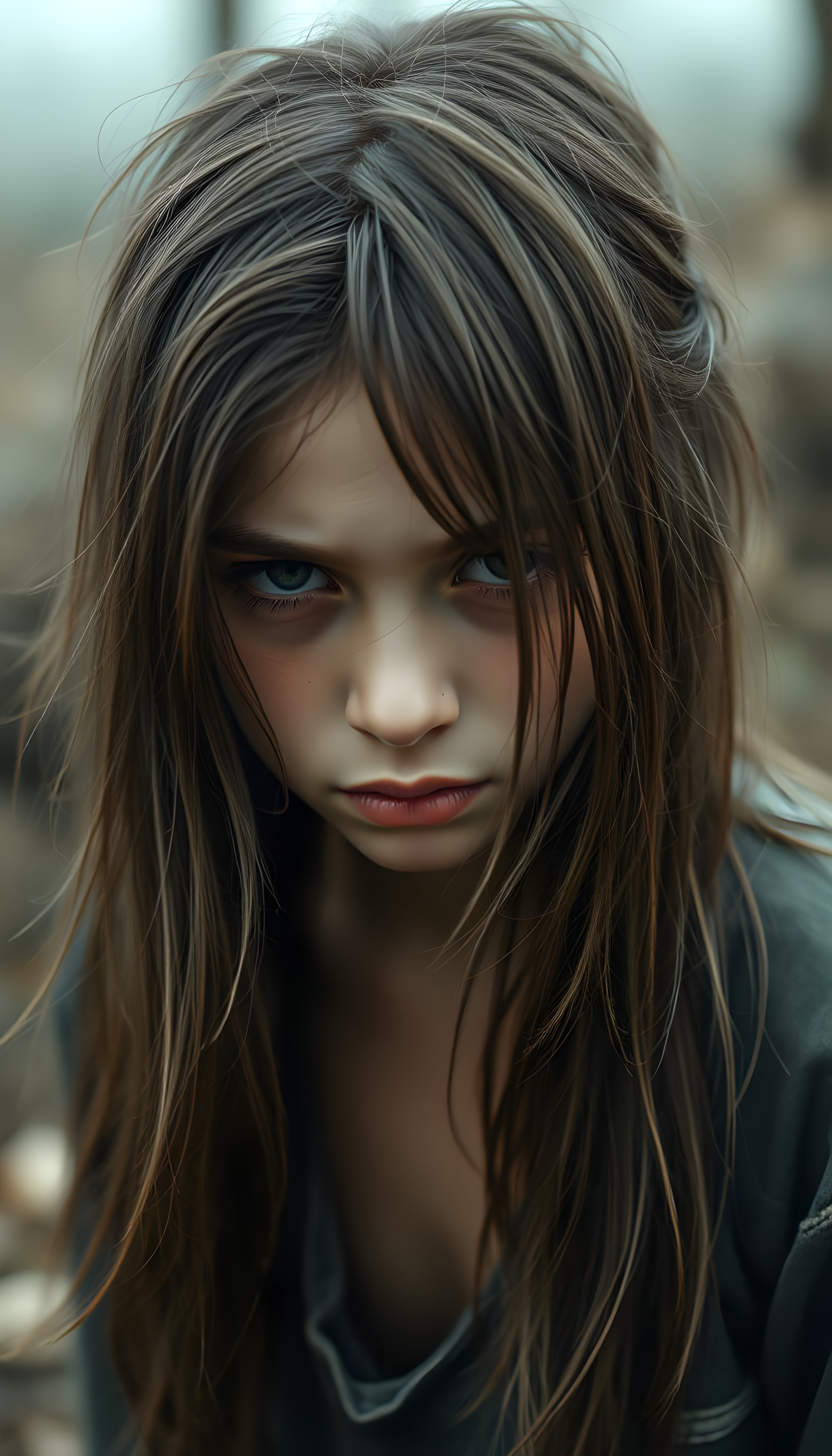 a young teen girl. She is poor and scantily tattered dressed. She is alone. Her long straight slightly wavy hazelnut brown hair is disheveled and dirty. She looks sadly into the camera. ((realistic, detailed photo))