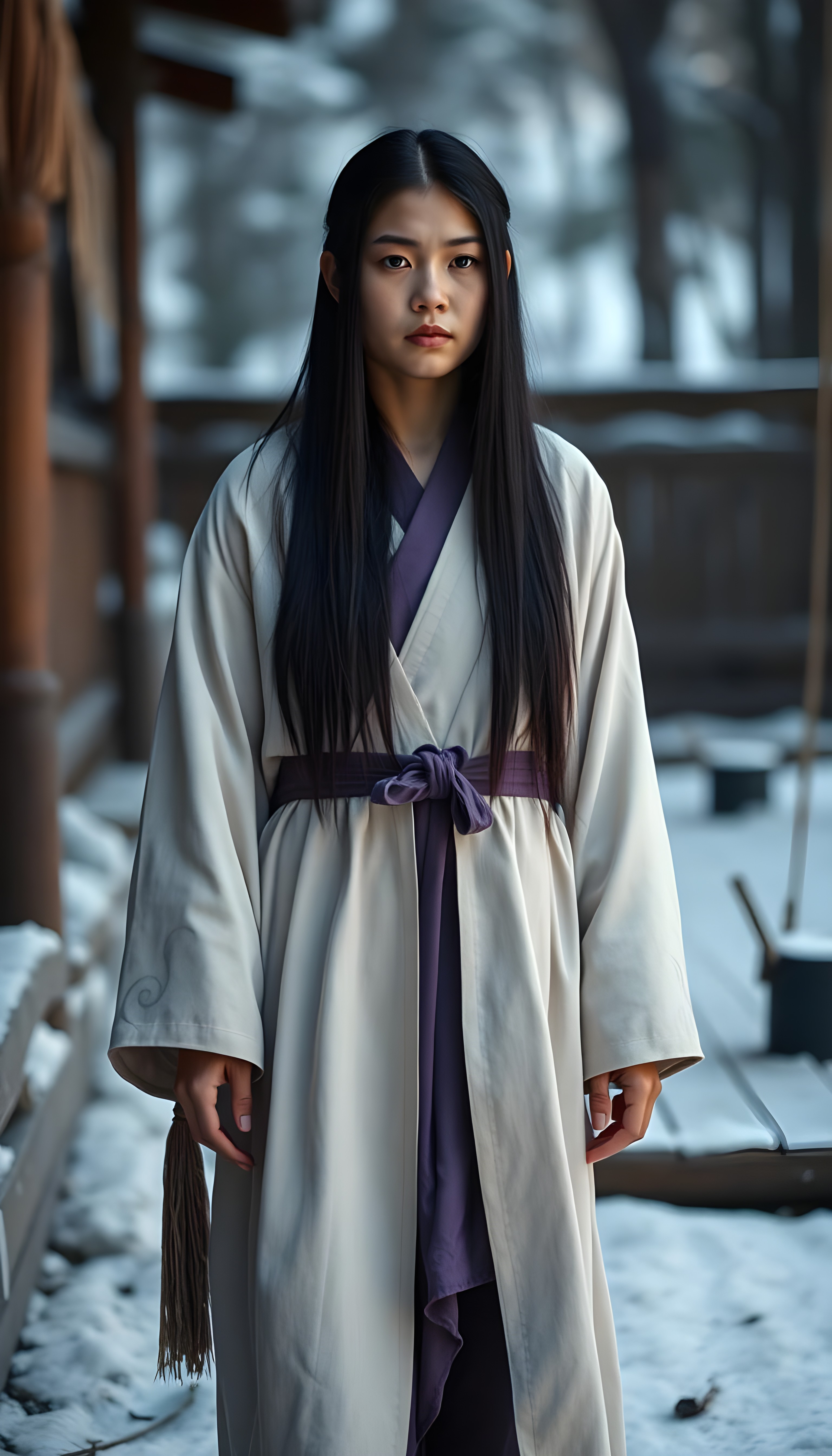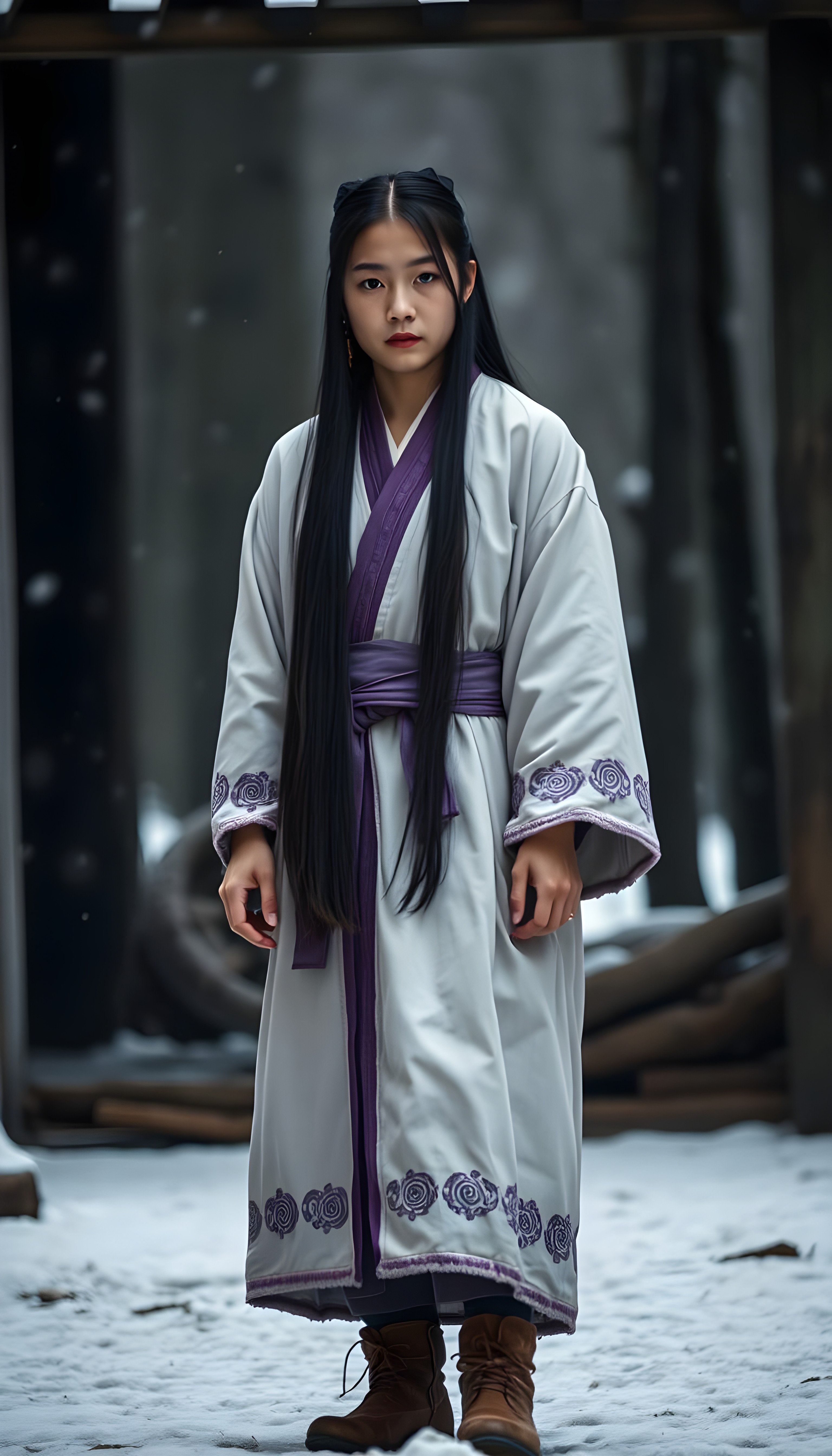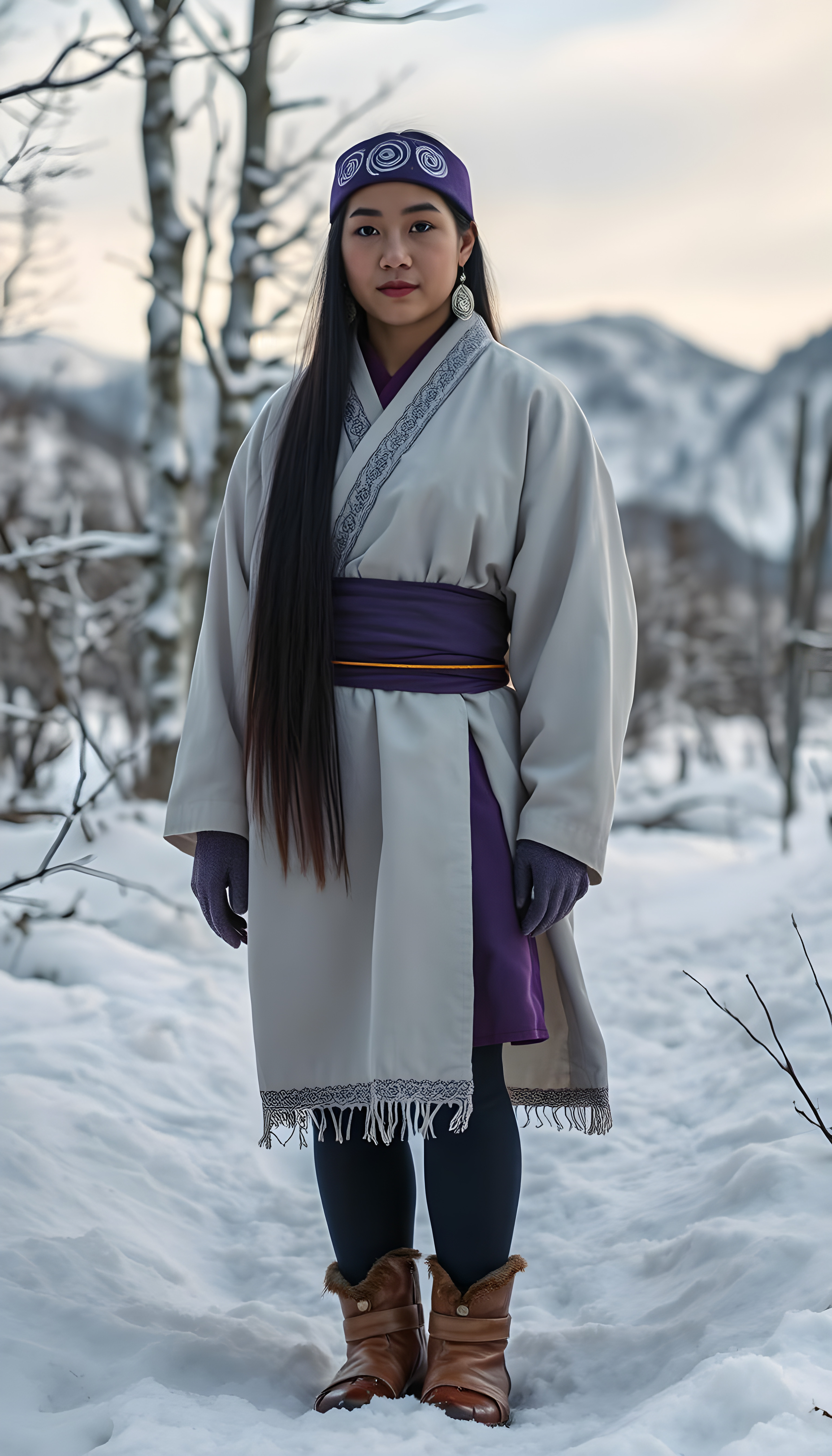 Asirpa wears a white Ainu robe made from bark called attus, complete with traditional swirling motif at the edges of the cloth over a purple band. Underneath she wears a purple kimono, which is tucked at the back. Asirpa wears dark leggings and deerskin boots called yukker. In cold weather Asirpa puts on a wolf fur mantle to cover herself in the wild. Long, straight black shiny hair falls down like a watherfall.
