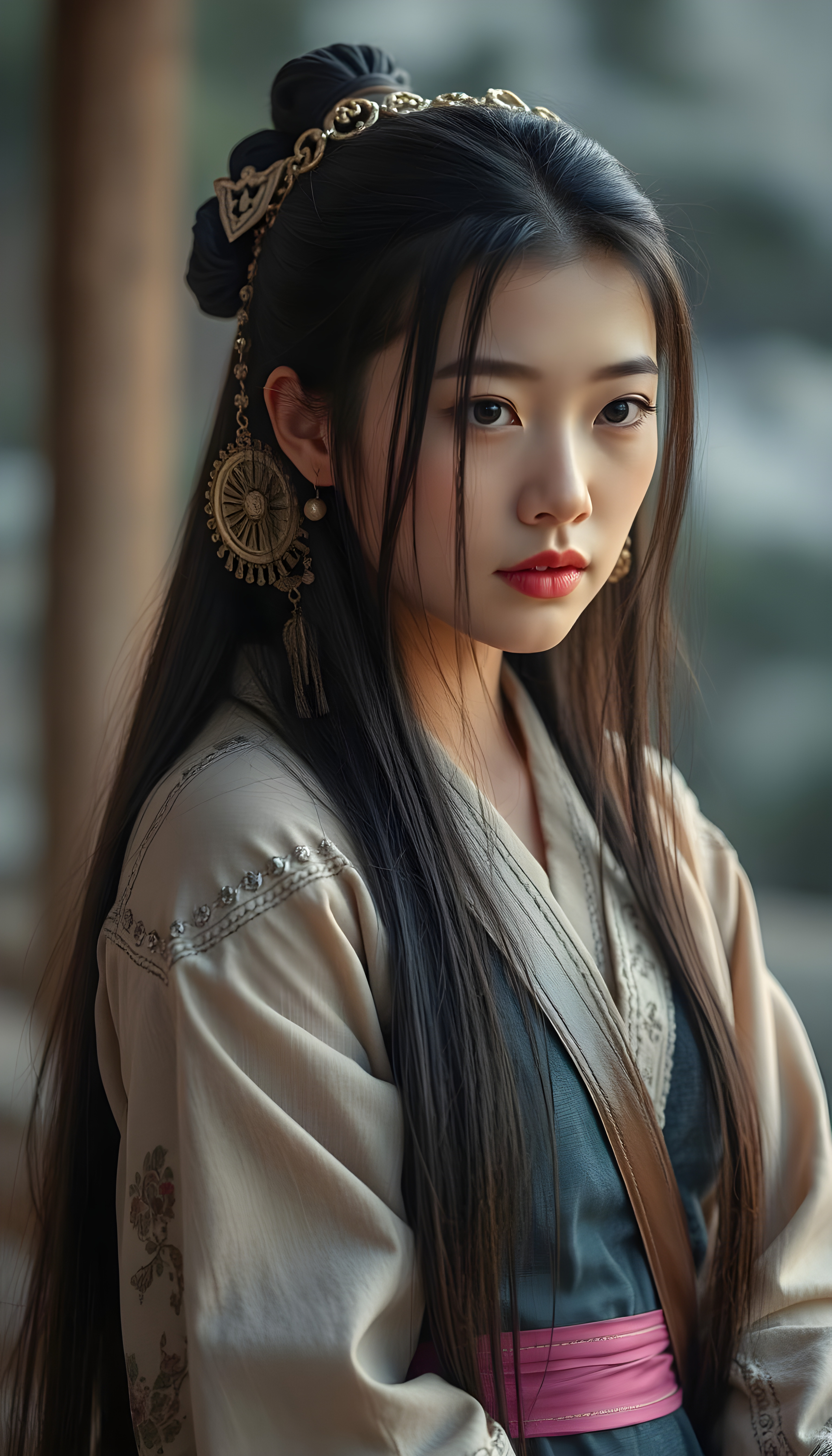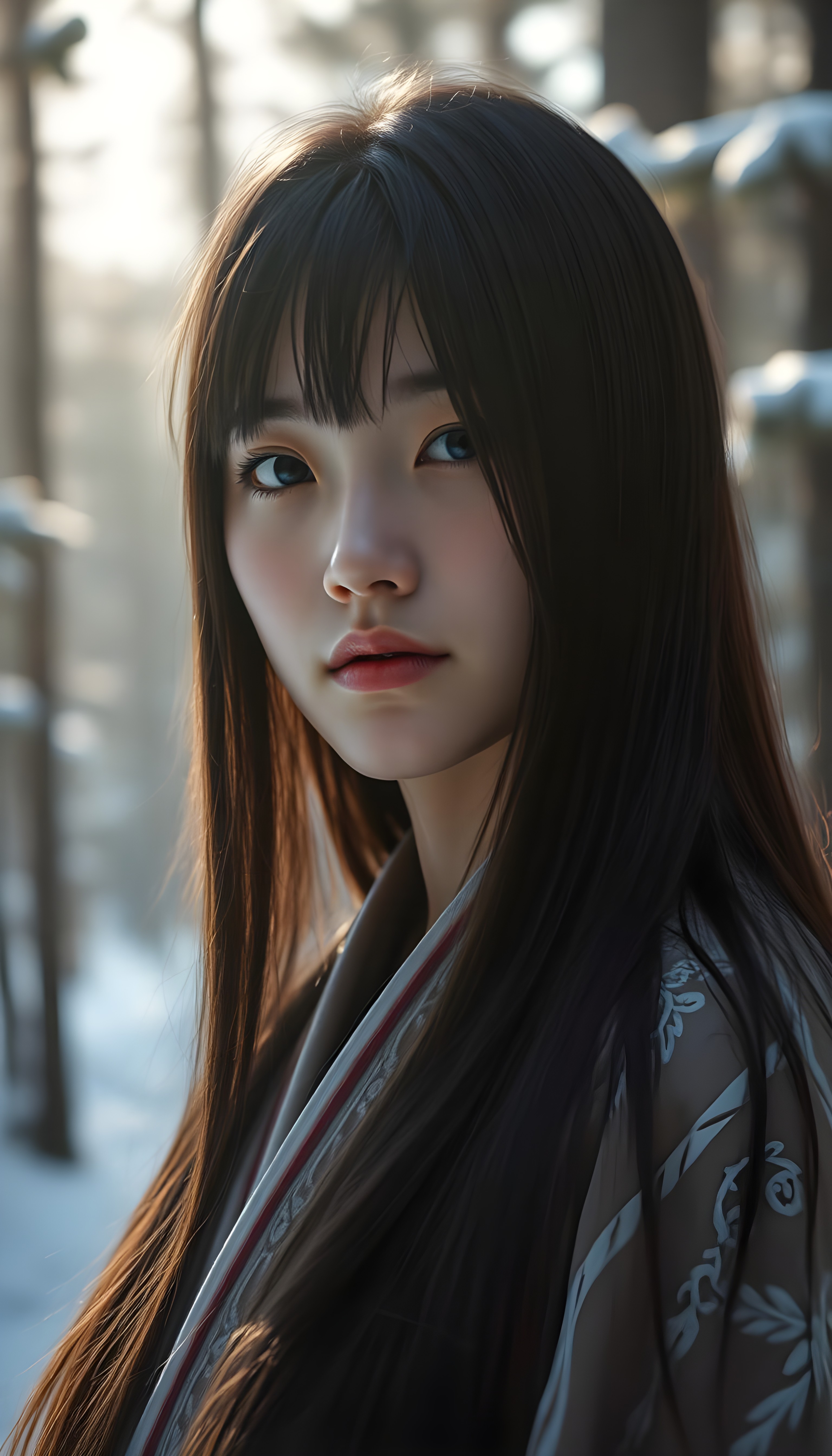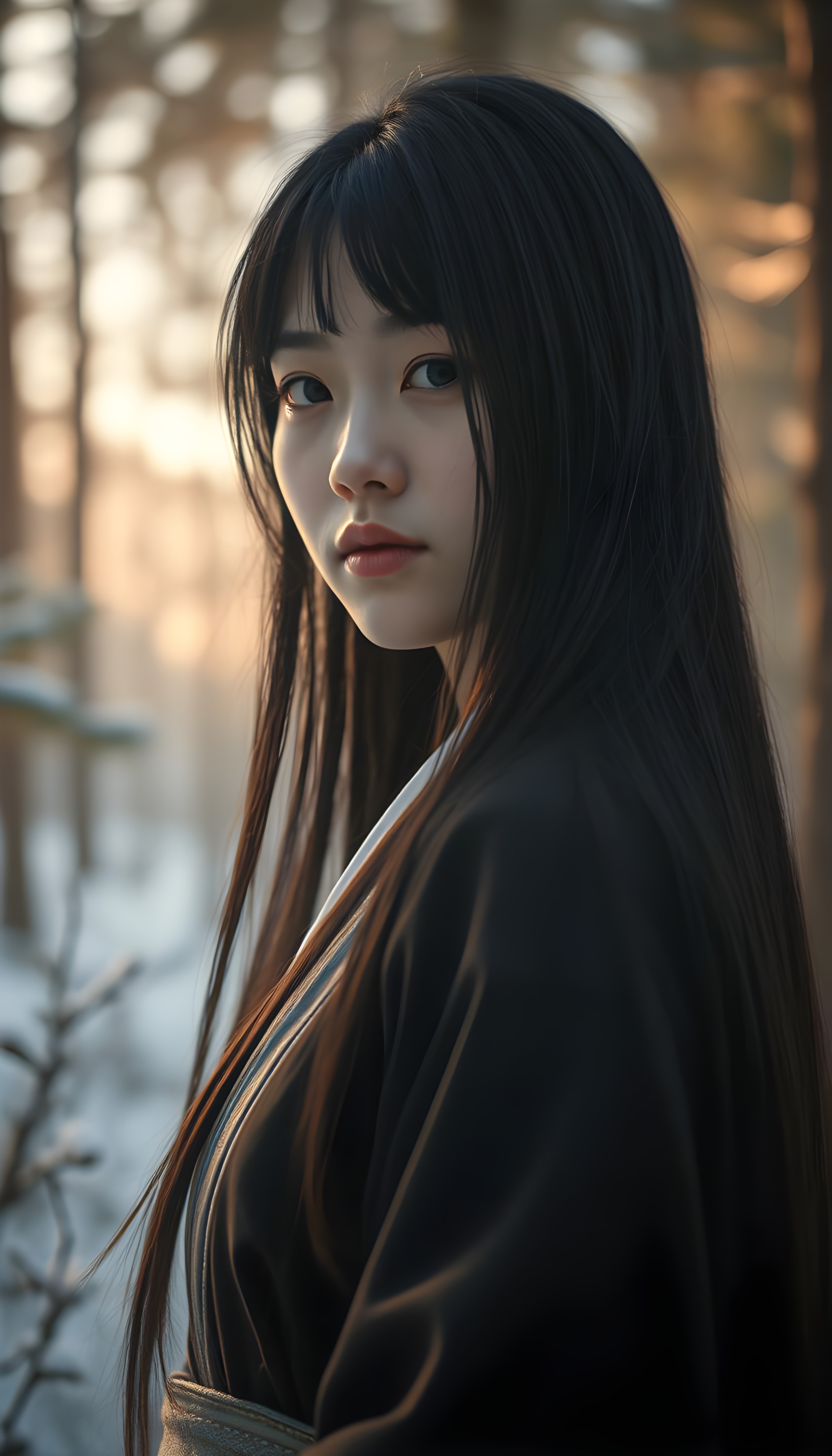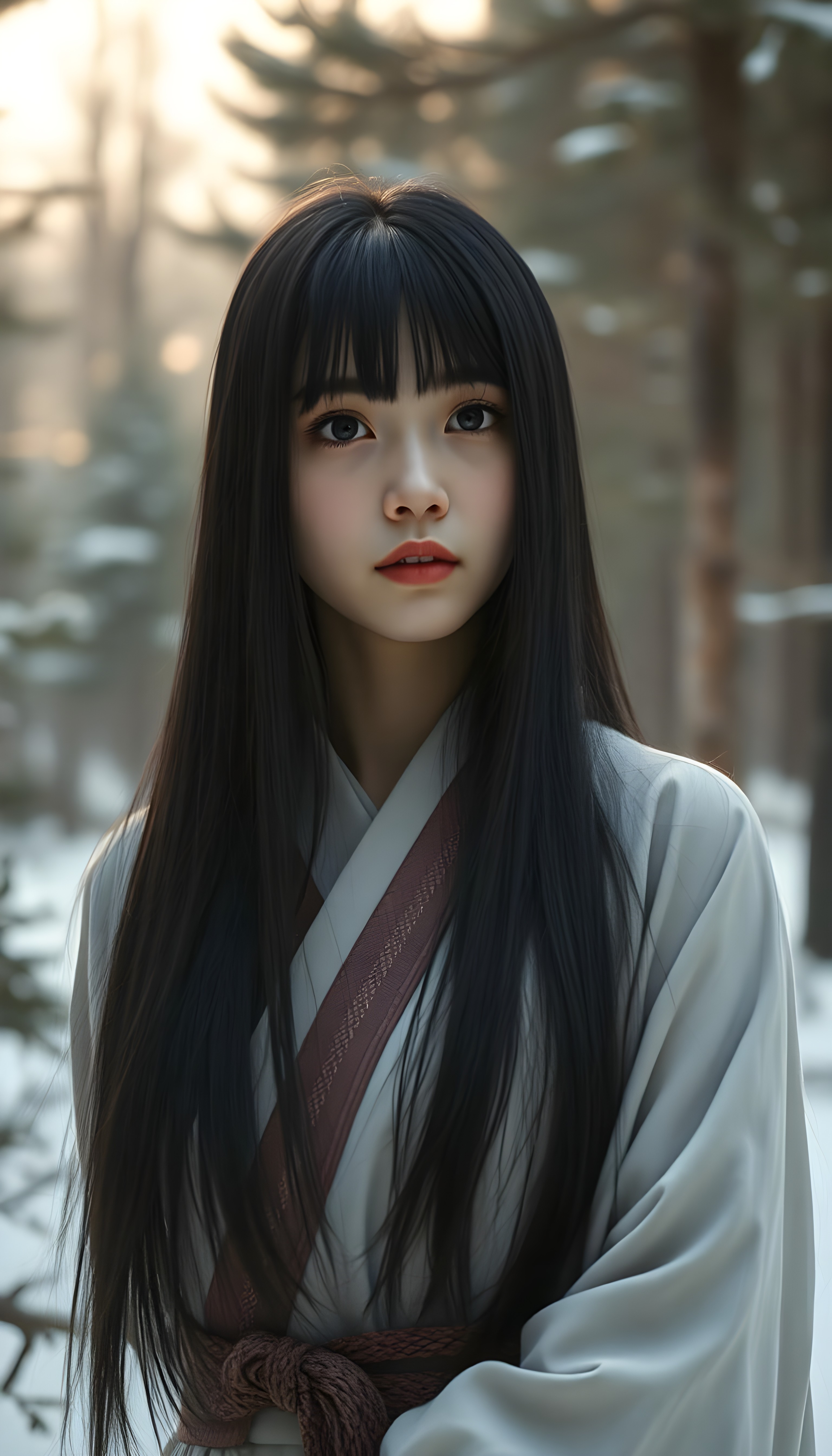 Asirpa wears a white Ainu robe made from bark called attus, complete with traditional swirling motif at the edges of the cloth over a purple band. Underneath she wears a purple kimono, which is tucked at the back. Asirpa wears dark leggings and deerskin boots called yukker. In cold weather Asirpa puts on a wolf fur mantle to cover herself in the wild. Long, straight black shiny hair falls down like a watherfall.