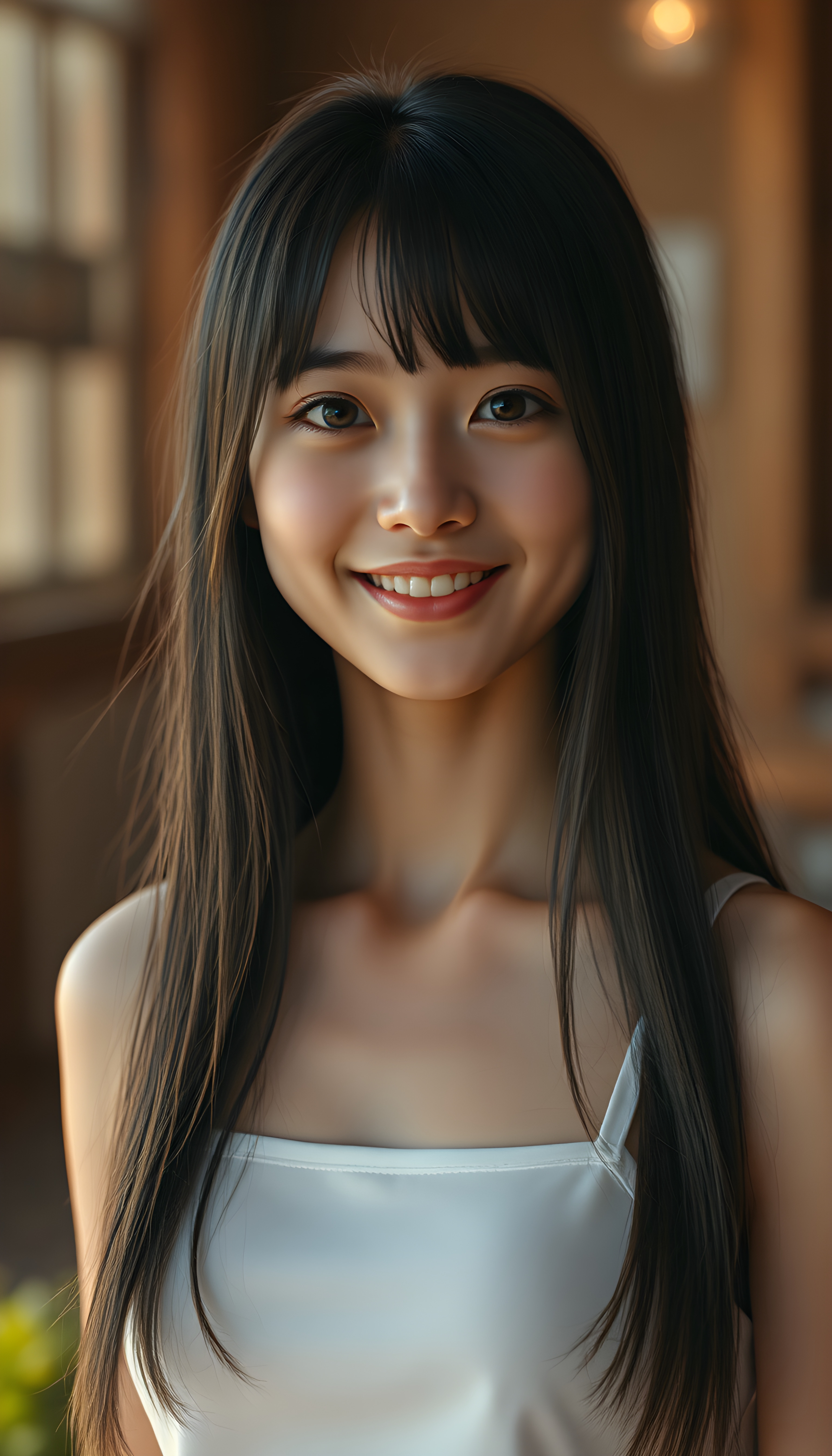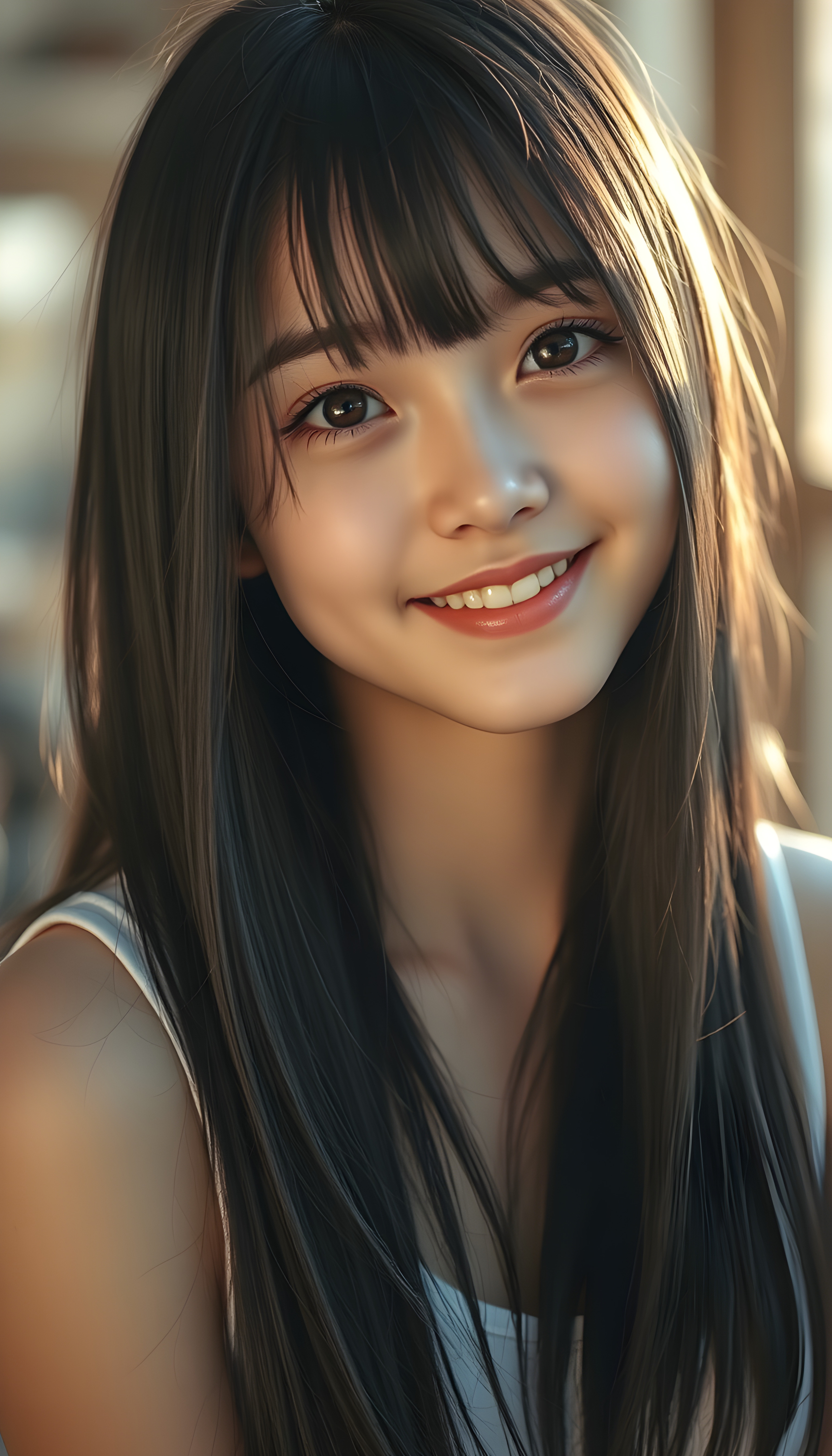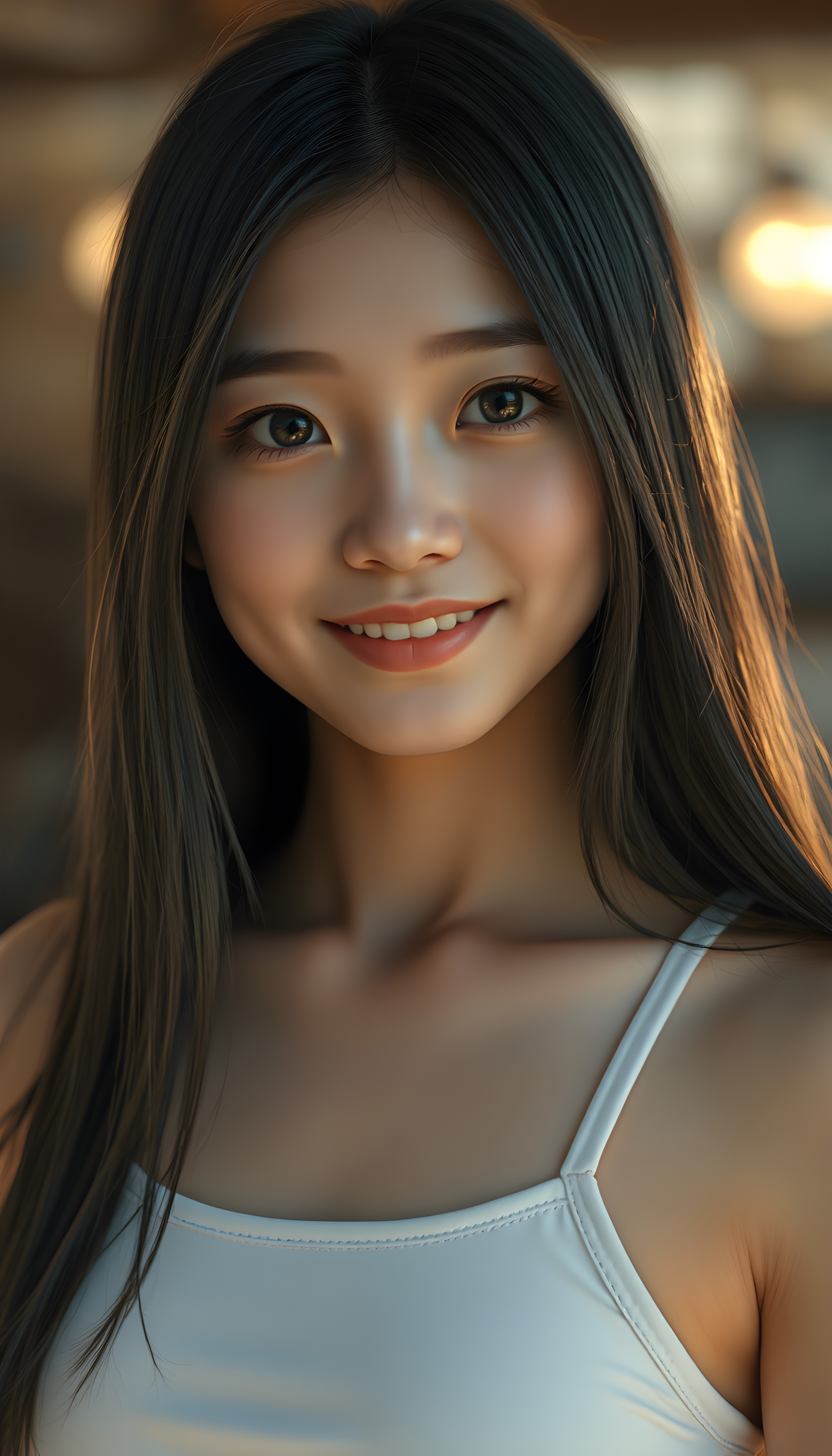 A realistic 3D photo from a cute teen girl with long, soft black straight hair and white straps, her hair falls gently over her body, the same length on both sides, round bright, detailed eyes, wearing a white cropped tank top. Her skin has a pale, almost translucent quality, and she smiles warm at the camera, the scene is bathed in warm, golden light, creating a whimsical and serene atmosphere, round face, full plump lips, white teeth, perfect makeup