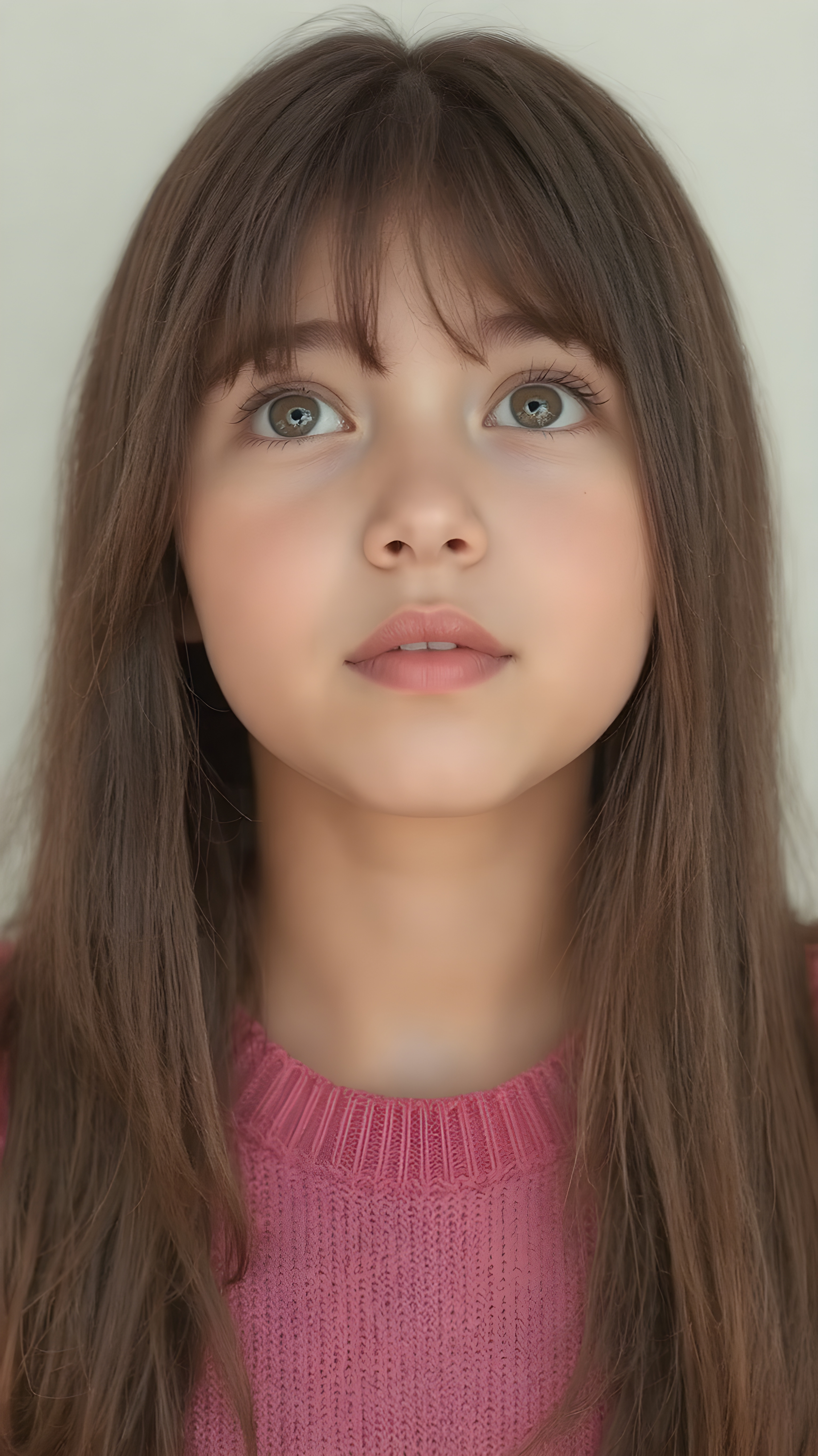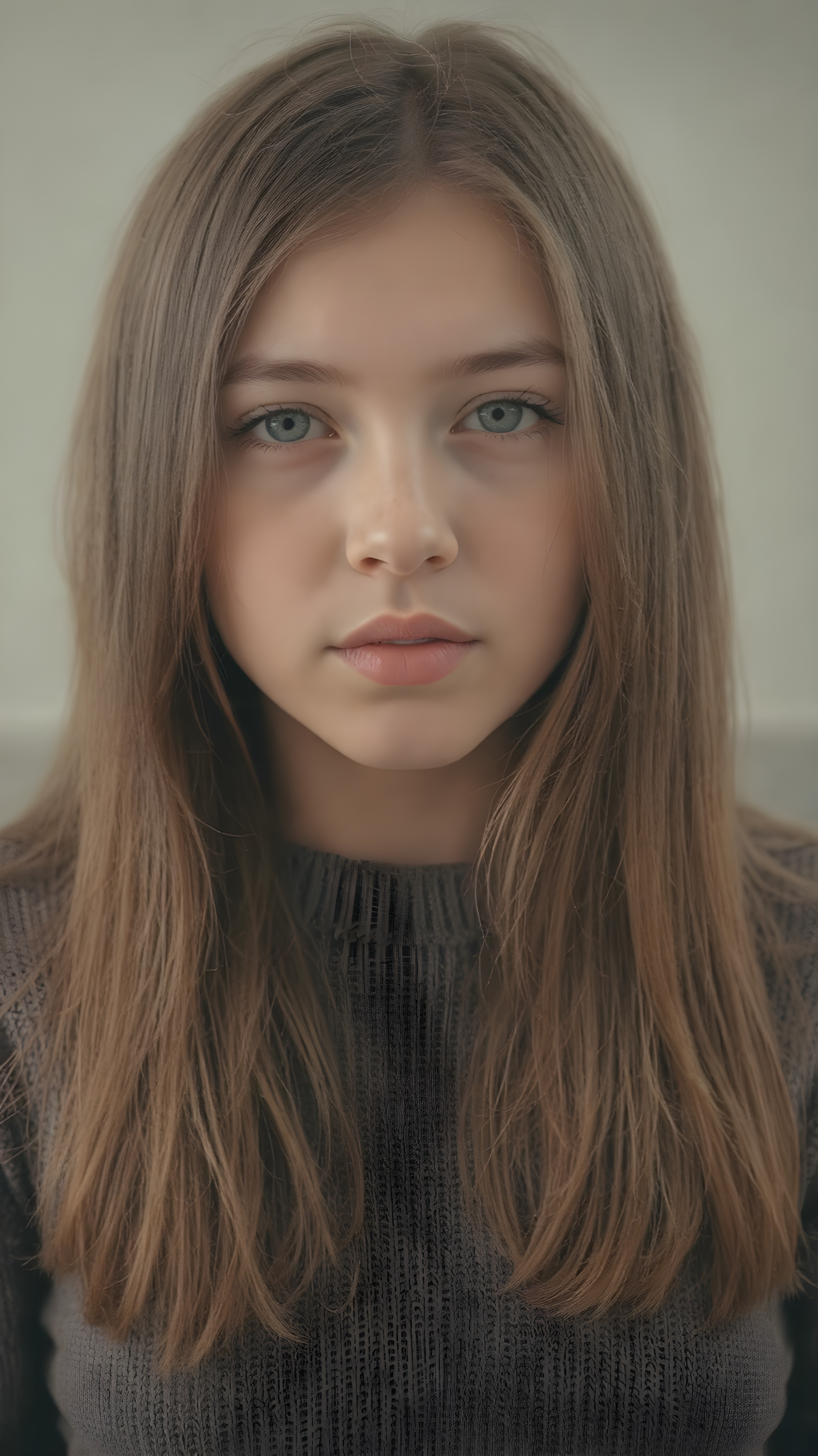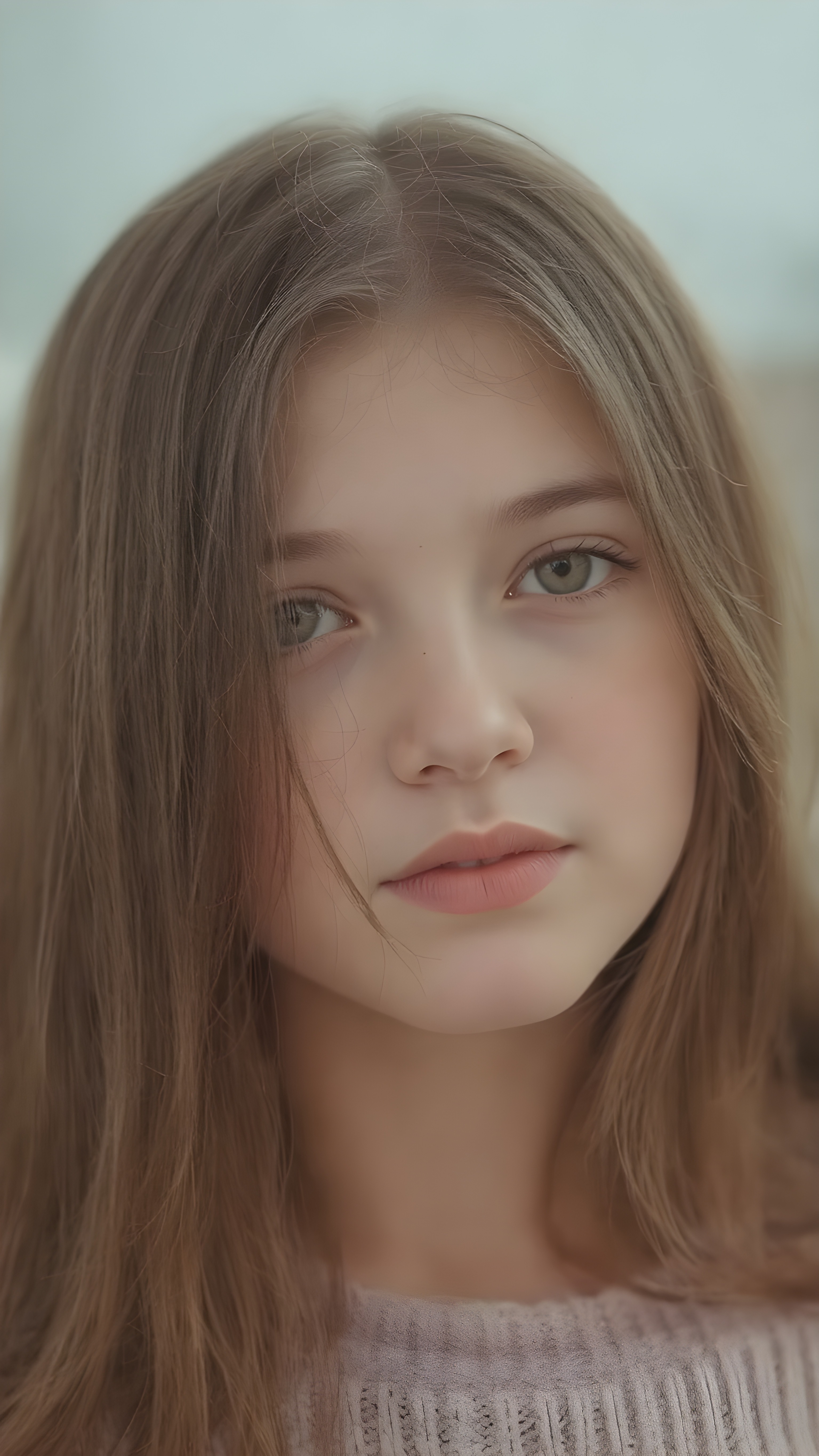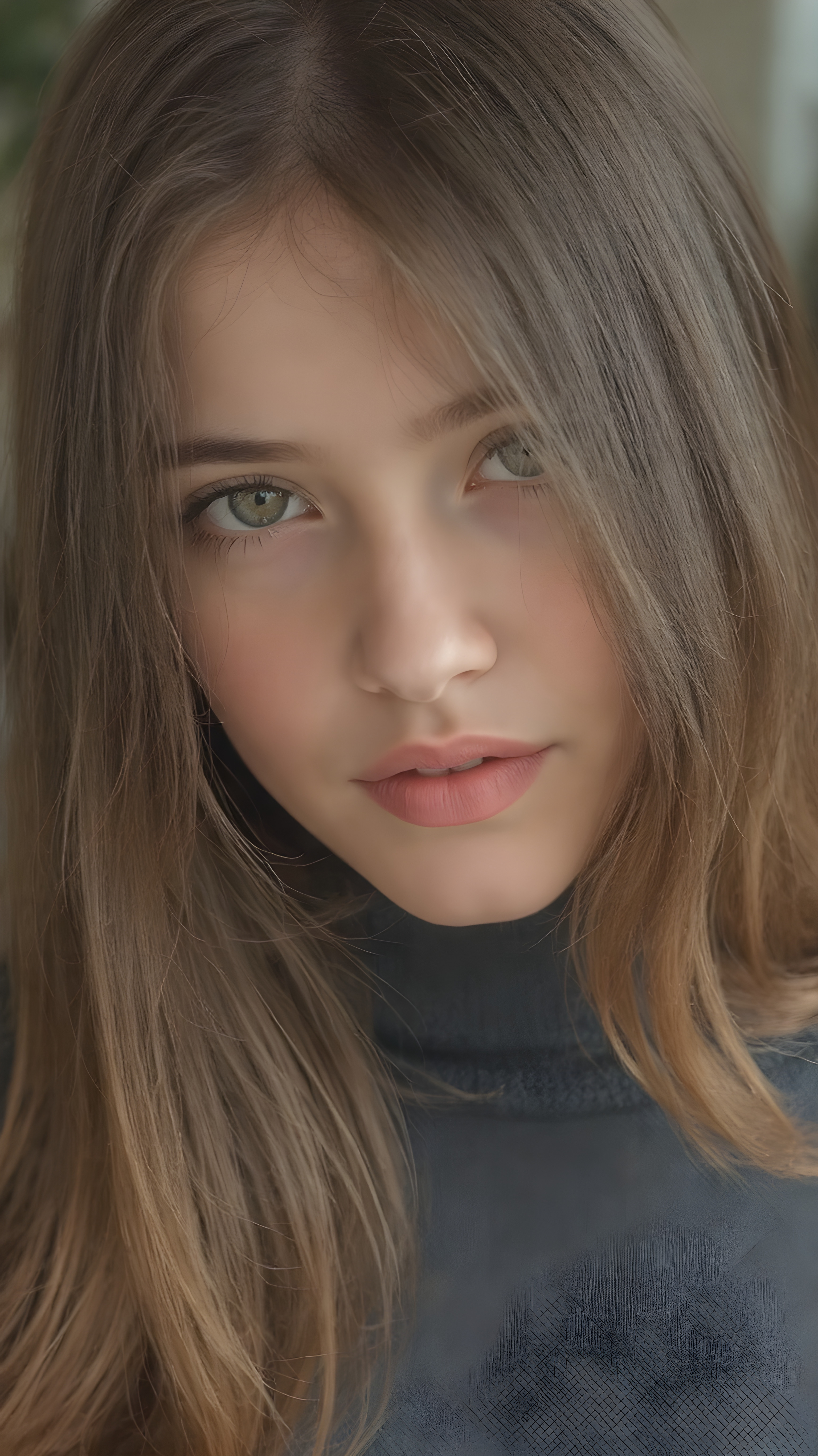 sophisticated and high-quality photography that captures the essence of a beautiful 15-year-old girl. Her thick, silky-smooth hair reaches down to her shoulders and is cut straight. The hair is visible from the sides, framing her face. She has a round face, which is emphasized by her tight, thin and plump lips. Her skin is white, smooth and beautifully visible on her cheeks. The girl is dressed in a tight, thin and translucent sweater, which emphasizes her wonderful body and beautiful legs. ((The picture is taken with a Nikon AF-S DX NIKKOR 35mm f/1.8G Lens)), which captures the details of her face and hair.)) ((The picture appears to be slightly overexposed, with a warm and inviting light that brings out her natural skin and the intricate details of her face and hair.