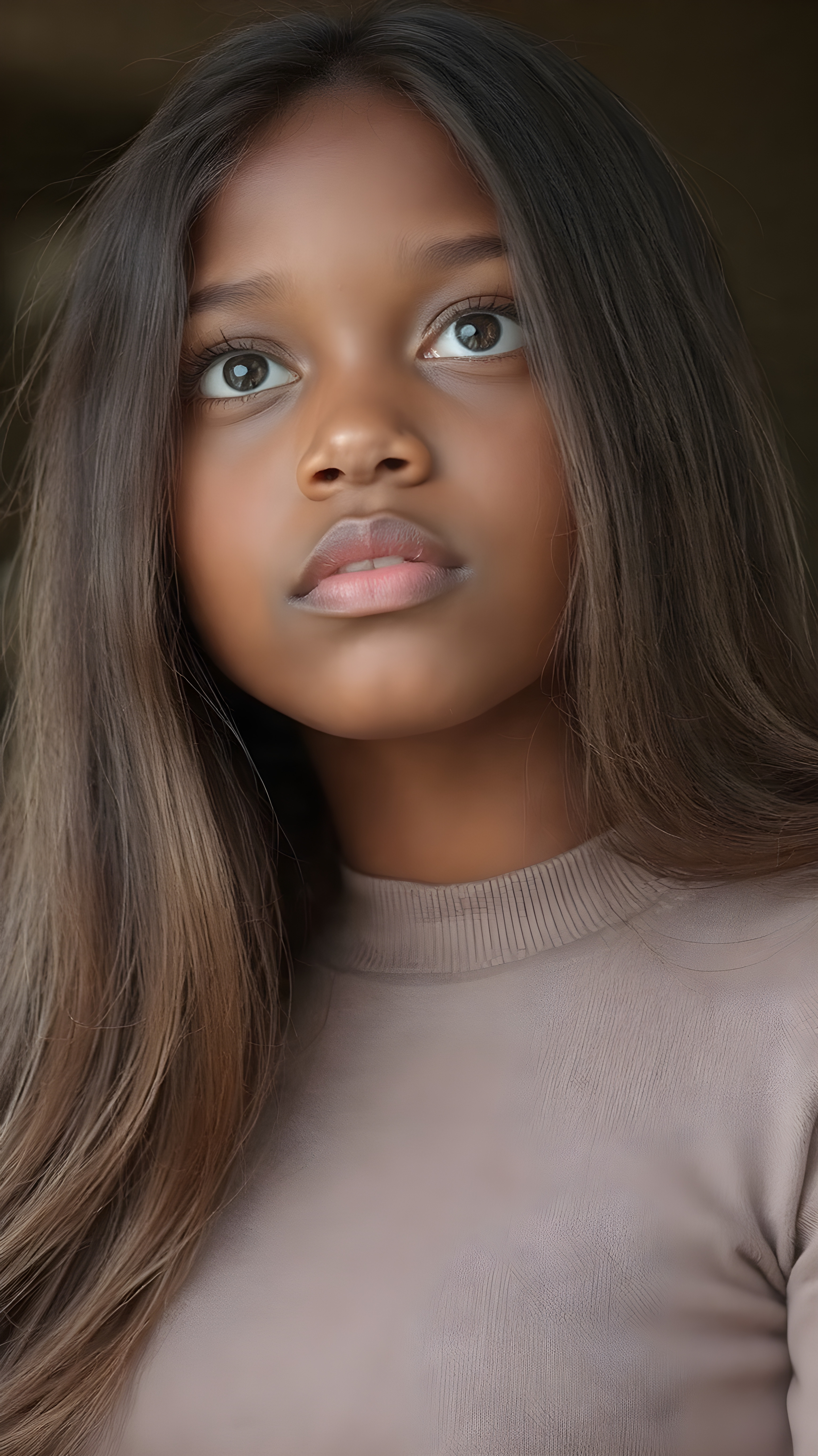 sophisticated and high-quality photography that captures the essence of a beautiful obsidian 16-year-old girl. Her thick, silky-smooth hair reaches down to her shoulders and is cut straight. The hair is visible from the sides, framing her face as she gazes up with amazement. She has a round face, which is emphasized by her tight, thin and plump lips. Her skin is white, smooth and beautifully visible on her cheeks. The girl is dressed in a tight, thin and translucent sweater, which emphasizes her wonderful body and beautiful legs. ((The picture is taken with a Nikon AF-S DX NIKKOR 35mm f/1.8G Lens)), which captures the details of her face and hair.)) ((The picture appears to be slightly overexposed, with a warm and inviting light that brings out her natural brown skin and the intricate details of her face and hair.