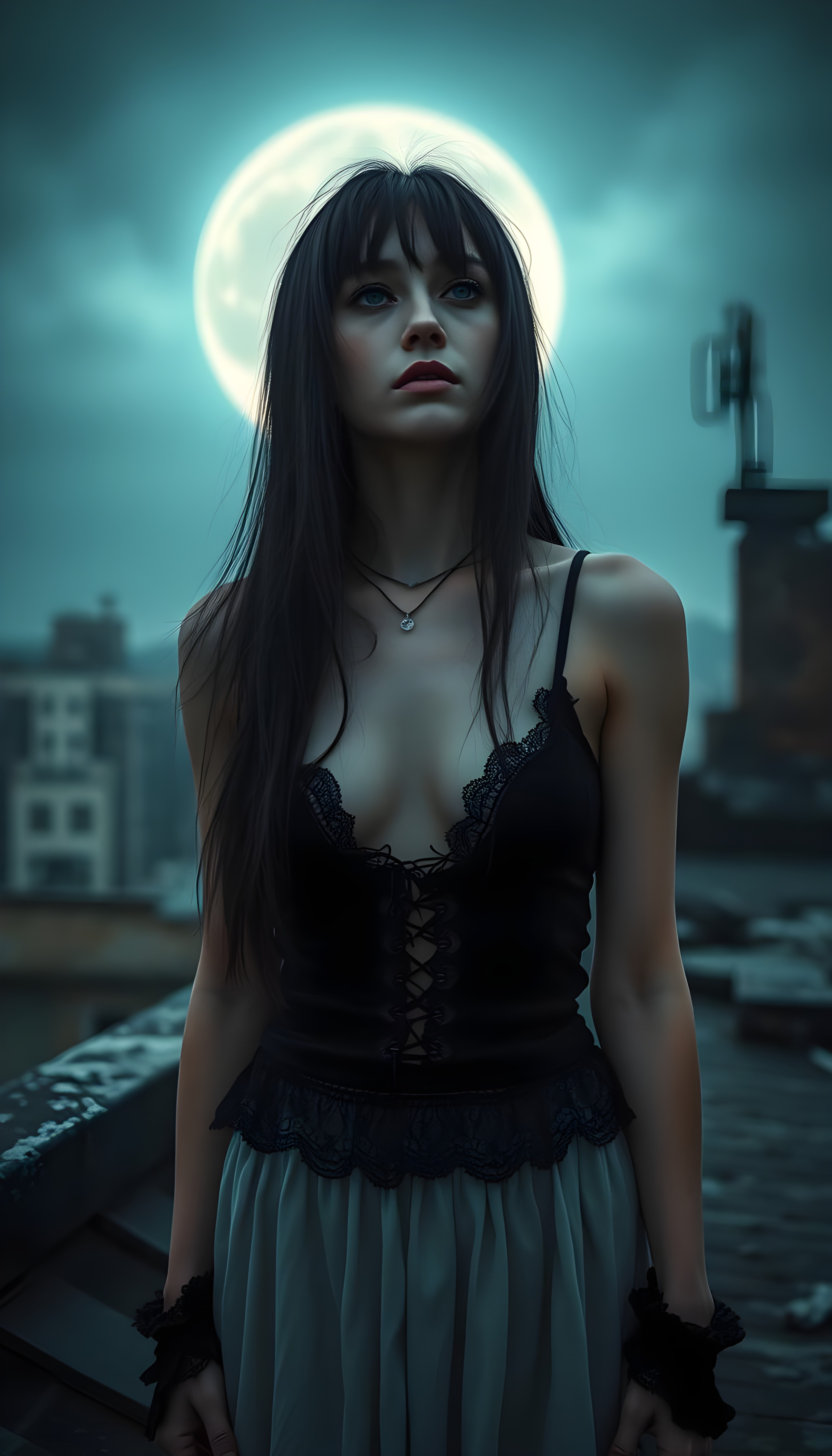 A melancholic pale gothic girl with a somber expression stands on a weathered rooftop, gazing at the luminous full moon. She wears a tattered black cropped tank top, revealing her midriff, and her long, straight black hair cascades down her back. The scene is bathed in a soft, ethereal blue and silver glow, highlighting the delicate details of her Gothic attire. The moon casts an enchanting light, creating a surreal atmosphere with a touch of mystery and solitude. The girl’s pale skin contrasts beautifully with the dark, moody background, and the intricate lace and ruffles of her outfit add a touch of elegance and depth to the composition.