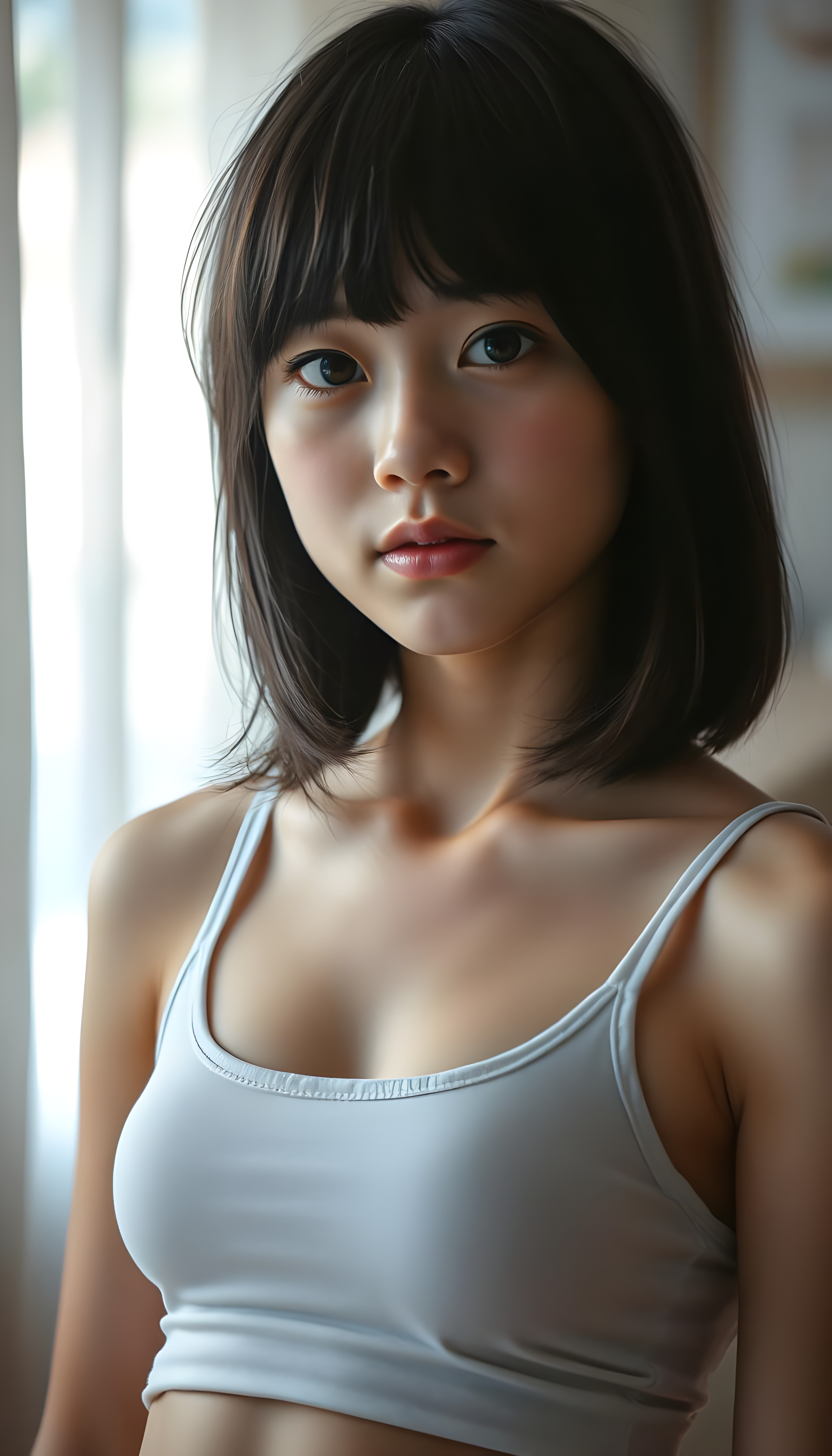 A young, cute woman. She has long, straight chestnut brown hair. Her face is round and flawlessly beautiful. Her dark eyes with large black pupils look cute and peaceful. She has pink, kissable lips and a small nose. She wears a colorful, rainbow-colored, very fine sweater. Her hair falls gently over her forehead. All this against a white, plain backdrop. The focus is on her face. Her mouth is slightly open, white teeth.