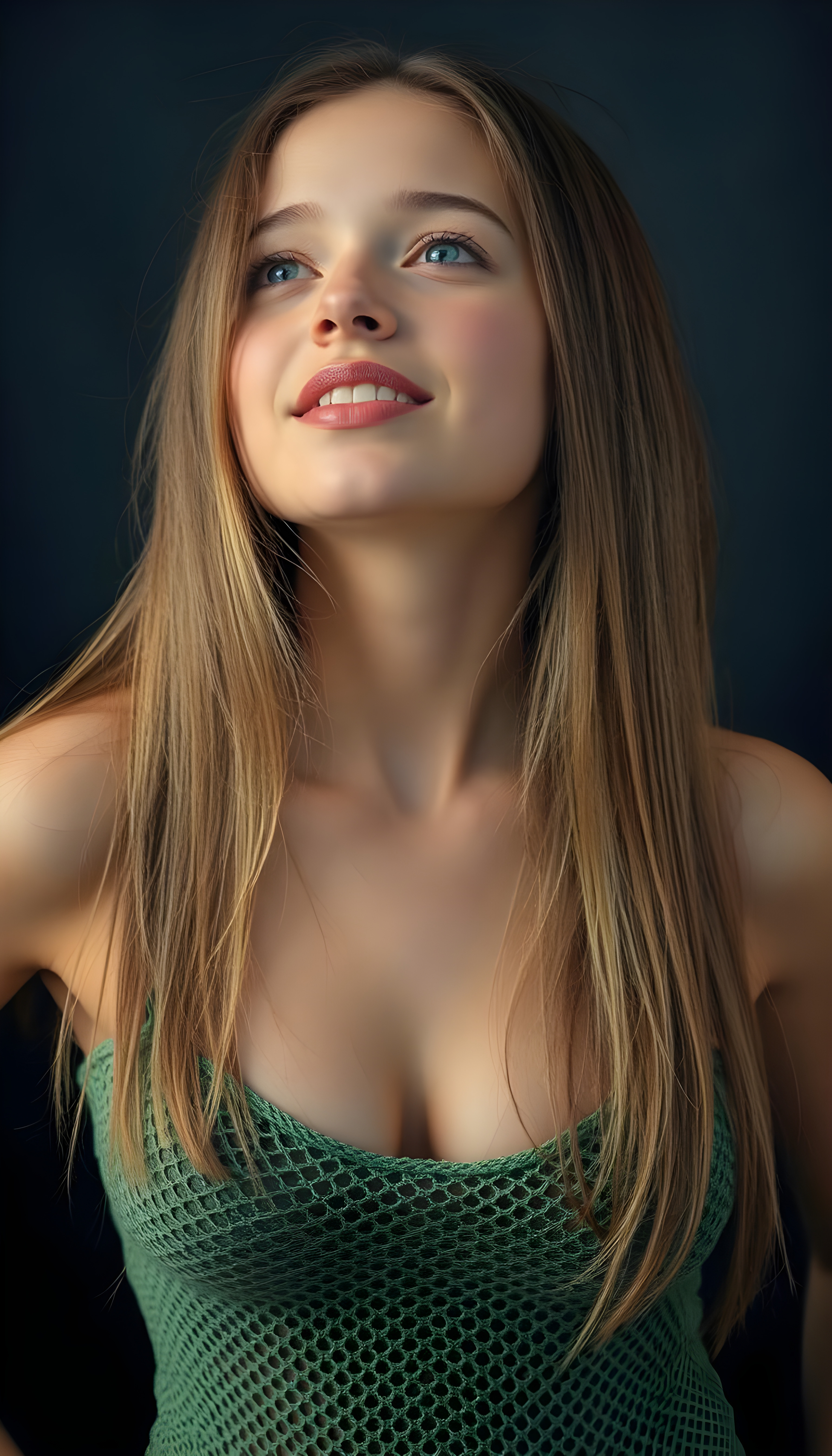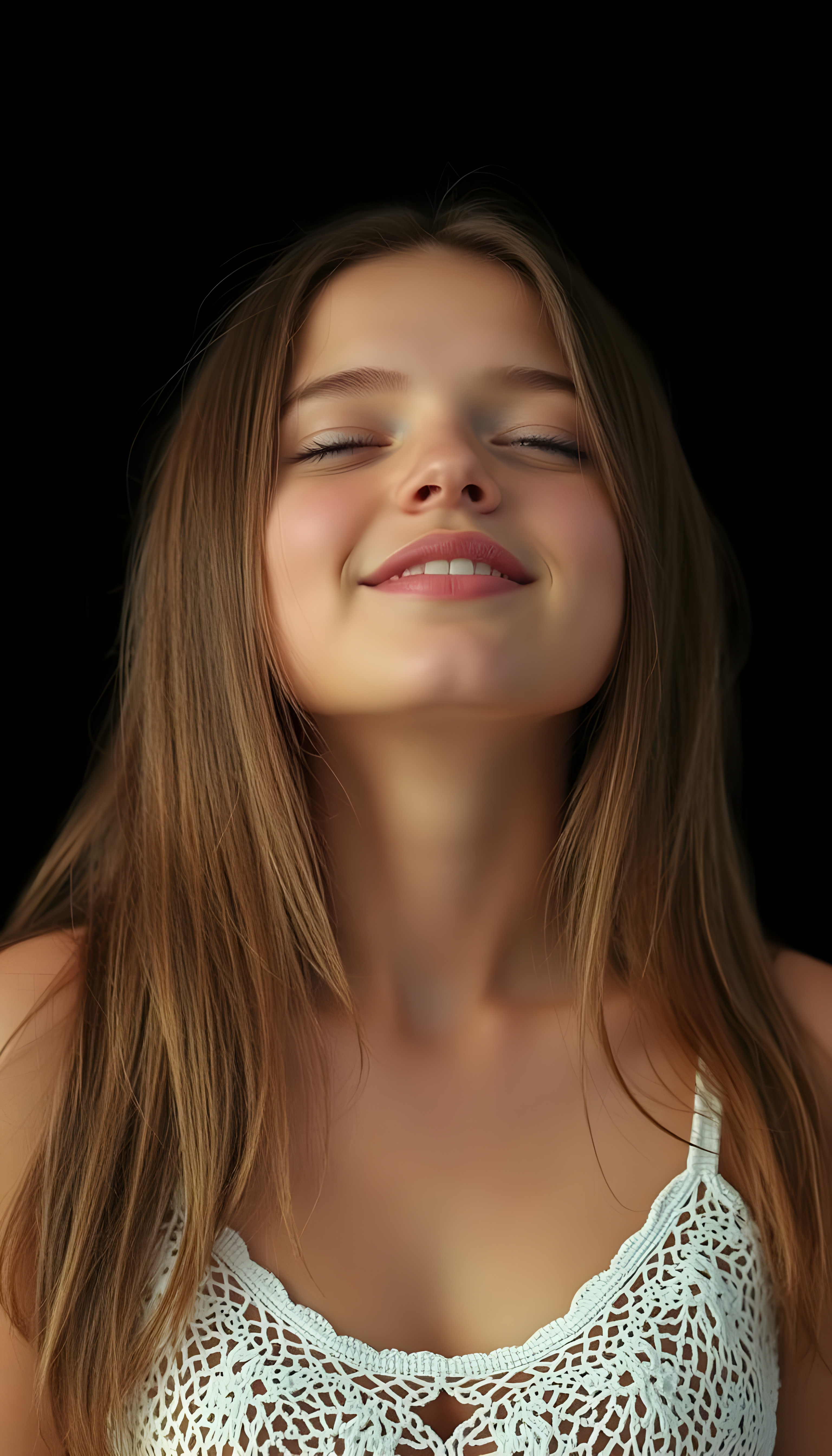 A beautiful photo of a young busty girl with long, straight, soft hazelnut brown hair. She is looking up with her eyes closed, her mouth slightly open, and she has soft, full lips. White teeth. The image is very peaceful. The girl has a perfectly feminine figure and is wearing a COLOR crocheted tank top with a low neckline, all against a black backdrop