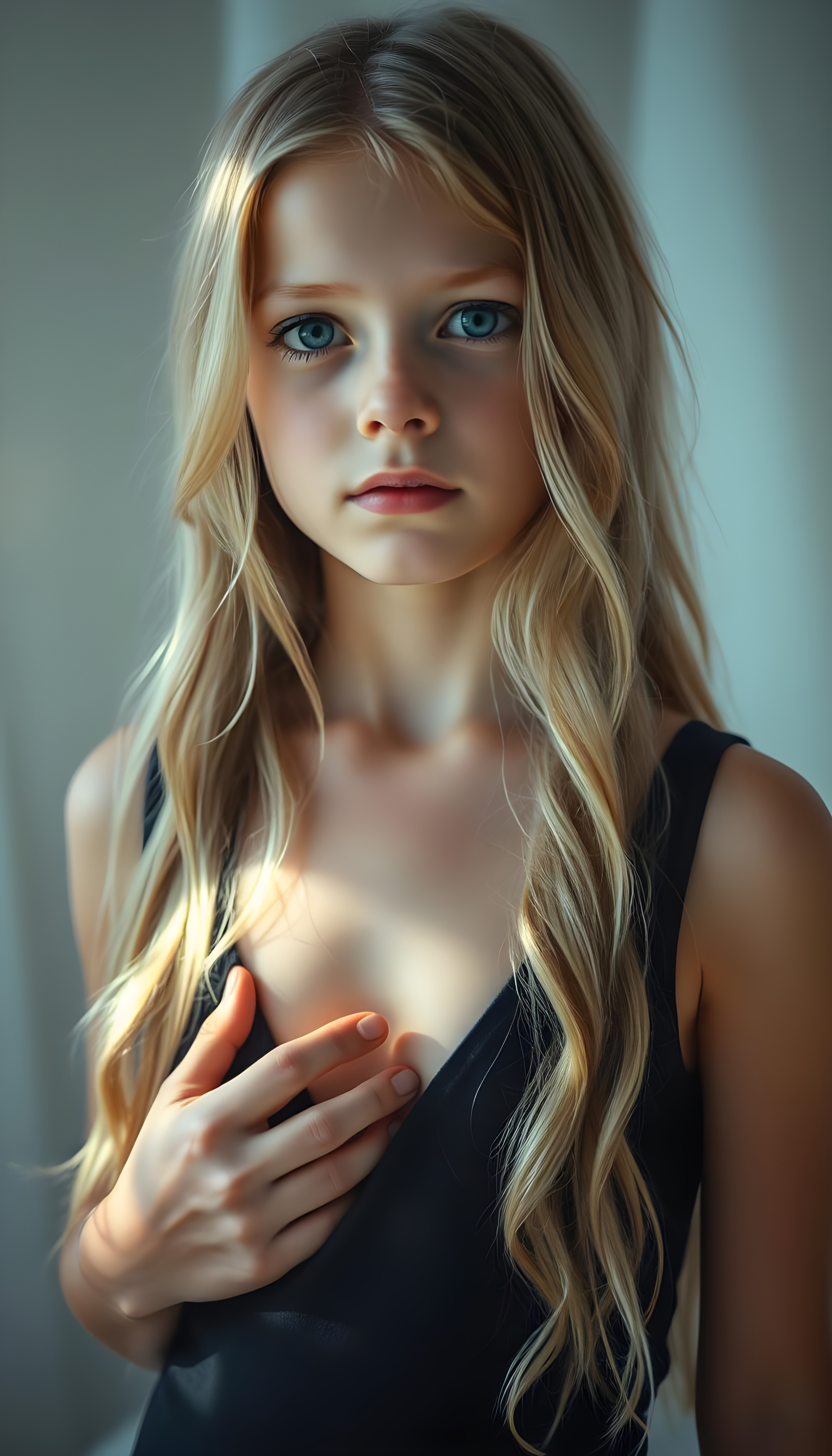 A magical, ethereal portrait of a young girl with long, wavy blonde hair and soft, delicate features. She wears a deep V-neck black tank top, revealing a hint of her chest. The background is a hazy, dreamy white, filled with soft, diffused light that creates a mystical atmosphere. Her eyes sparkle with an otherworldly glow, and her skin has a faint, iridescent sheen. She stands gracefully, one hand lightly touching her chest, exuding an aura of innocence and enchantment. The colors are rich and vibrant, with a mix of pastel and bold hues that blend seamlessly, enhancing the surreal and captivating mood of the scene.