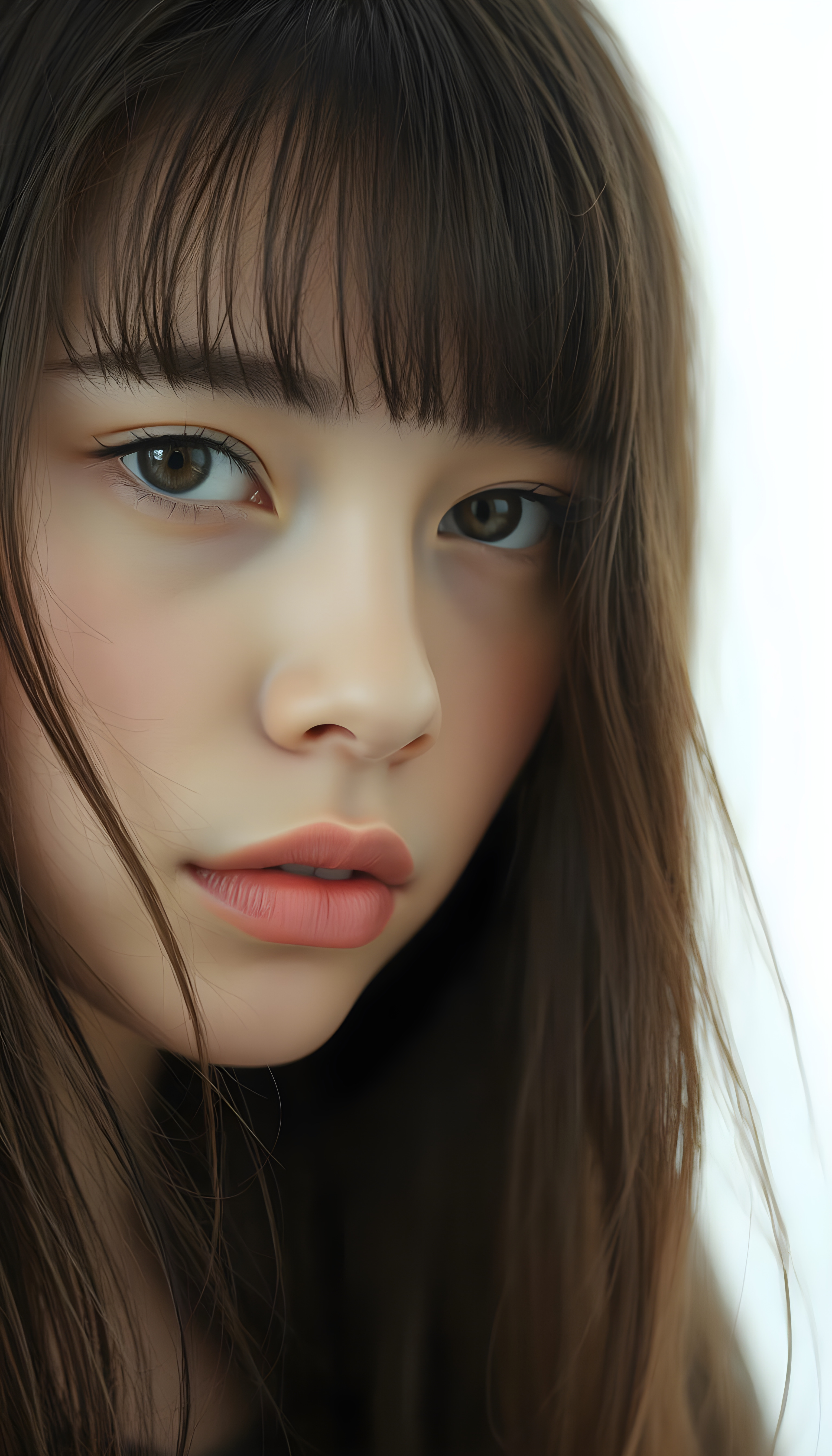 A stunning, highly detailed portrait of a beautiful young teenage girl with long, flowing obsidian hair and stylish bangs. Her lips are full and inviting, and her face is perfect and detailed. She gazes directly into the camera, her expression enigmatic and captivating. The image is a close-up, emphasizing her delicate features and the texture of her hair. The background is a pristine white, highlighting her natural beauty. The lighting is soft and flattering, casting gentle shadows that accentuate her facial structure. The overall composition is dynamic, with a slight side angle that adds depth and intrigue to the image.