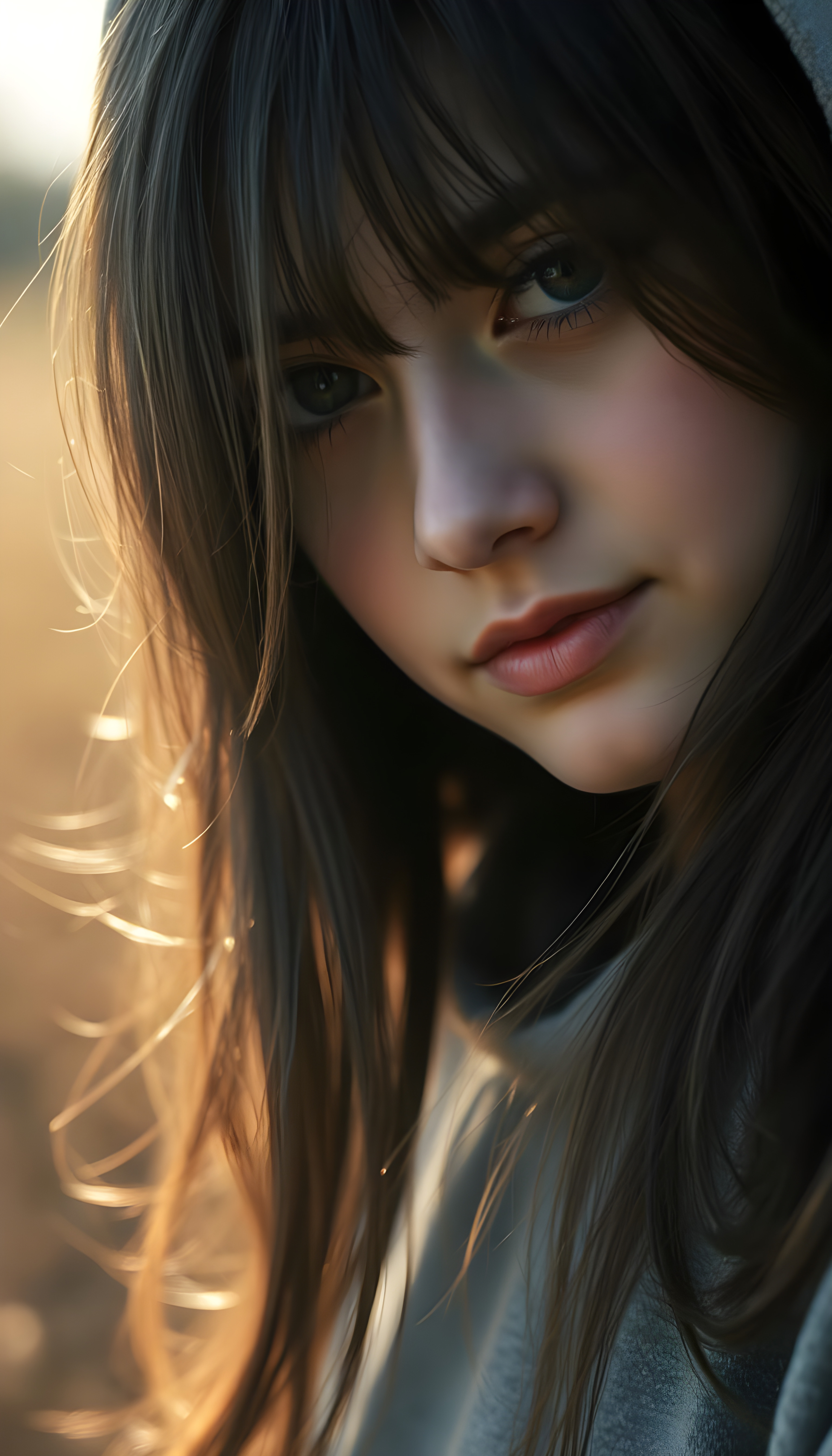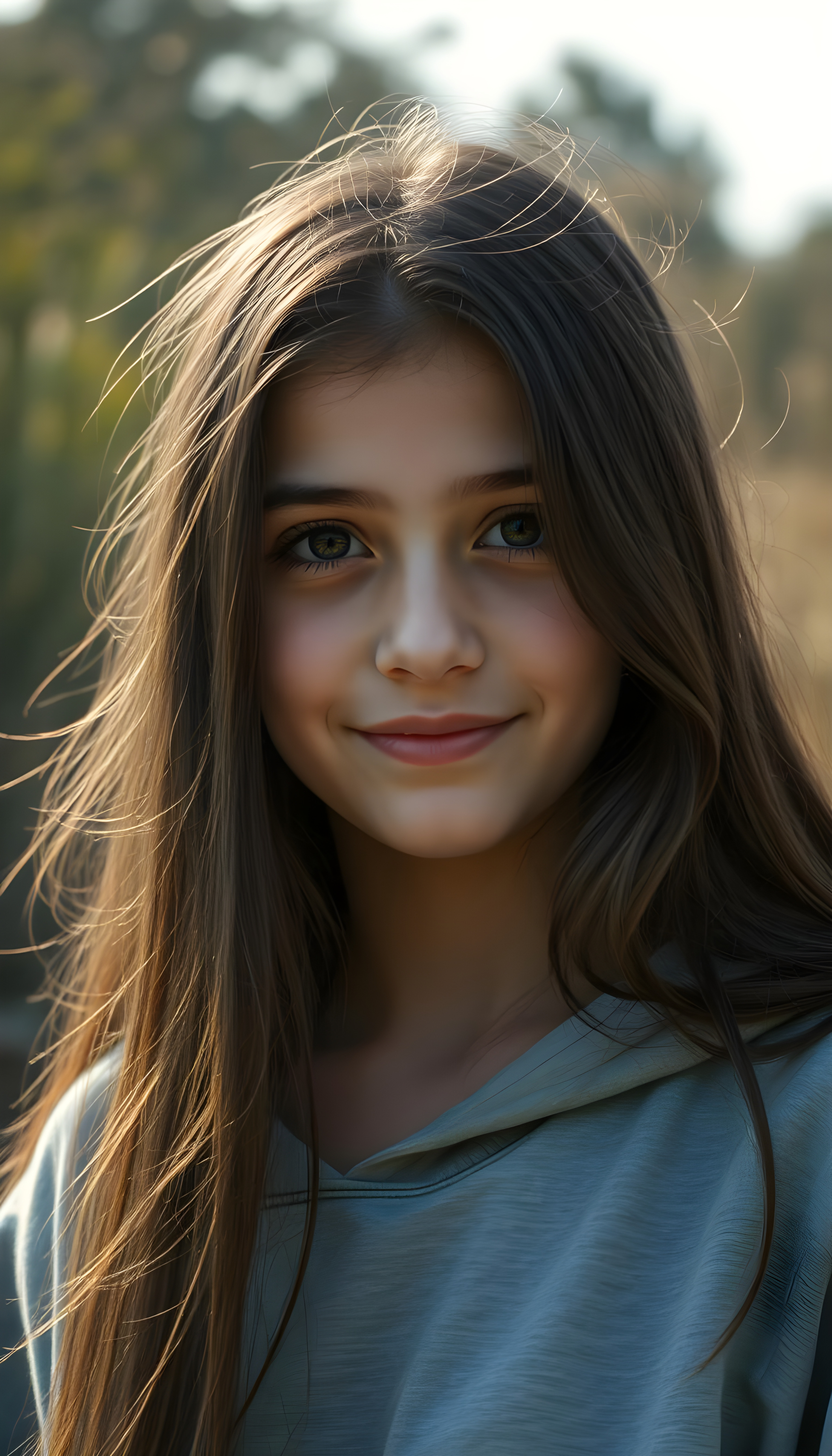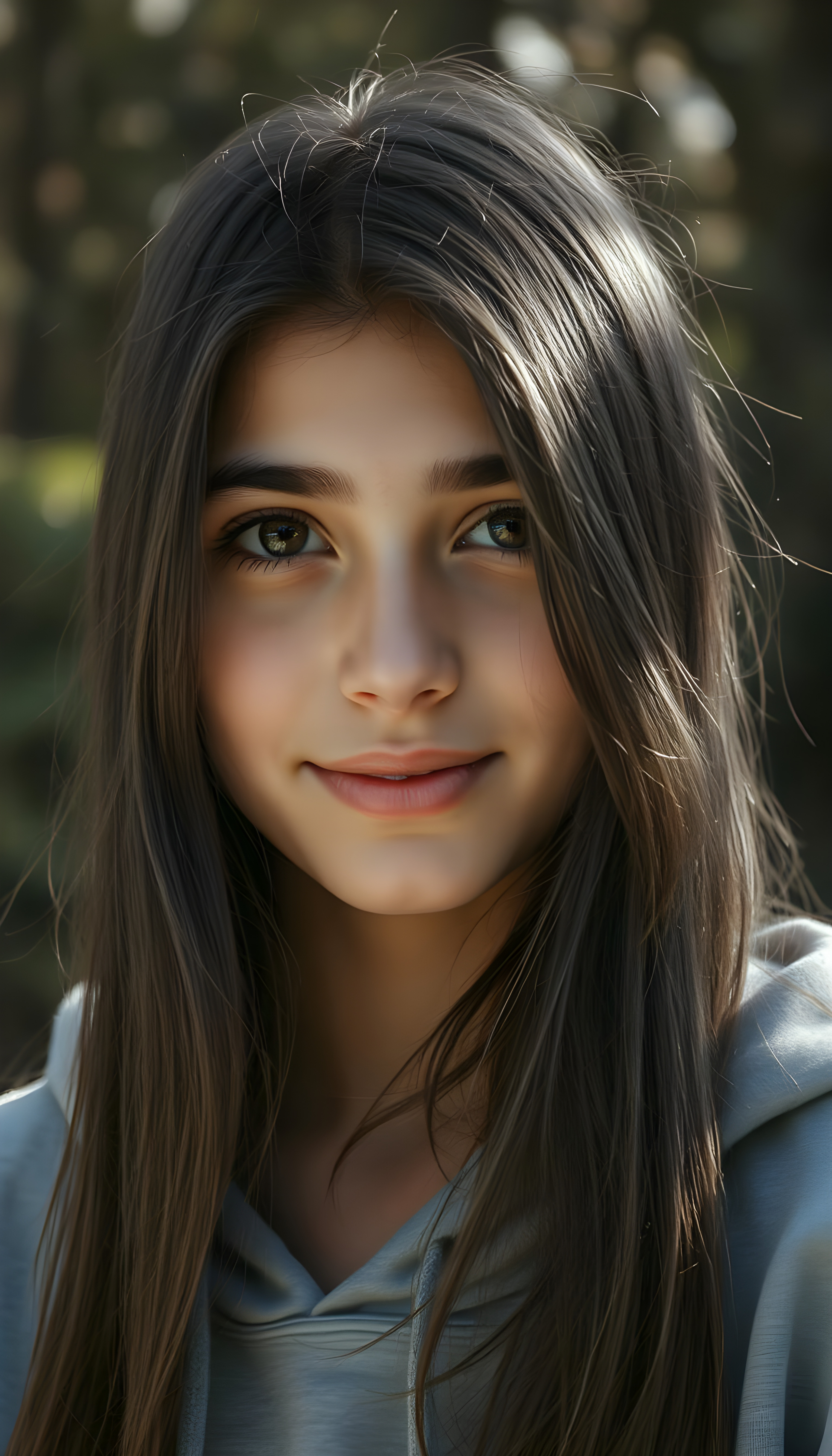 a super detailed and realistic photo of a young beautiful cute Persian teen girl, sunlight falls on her face, she has long (((dark straight wavy soft hair))) and dark eyes, ((angelic round face)), ((realistic, detailed portrait)), perfect shadow, she wears a grey hoodie, smile, all against a backdrop in the nature