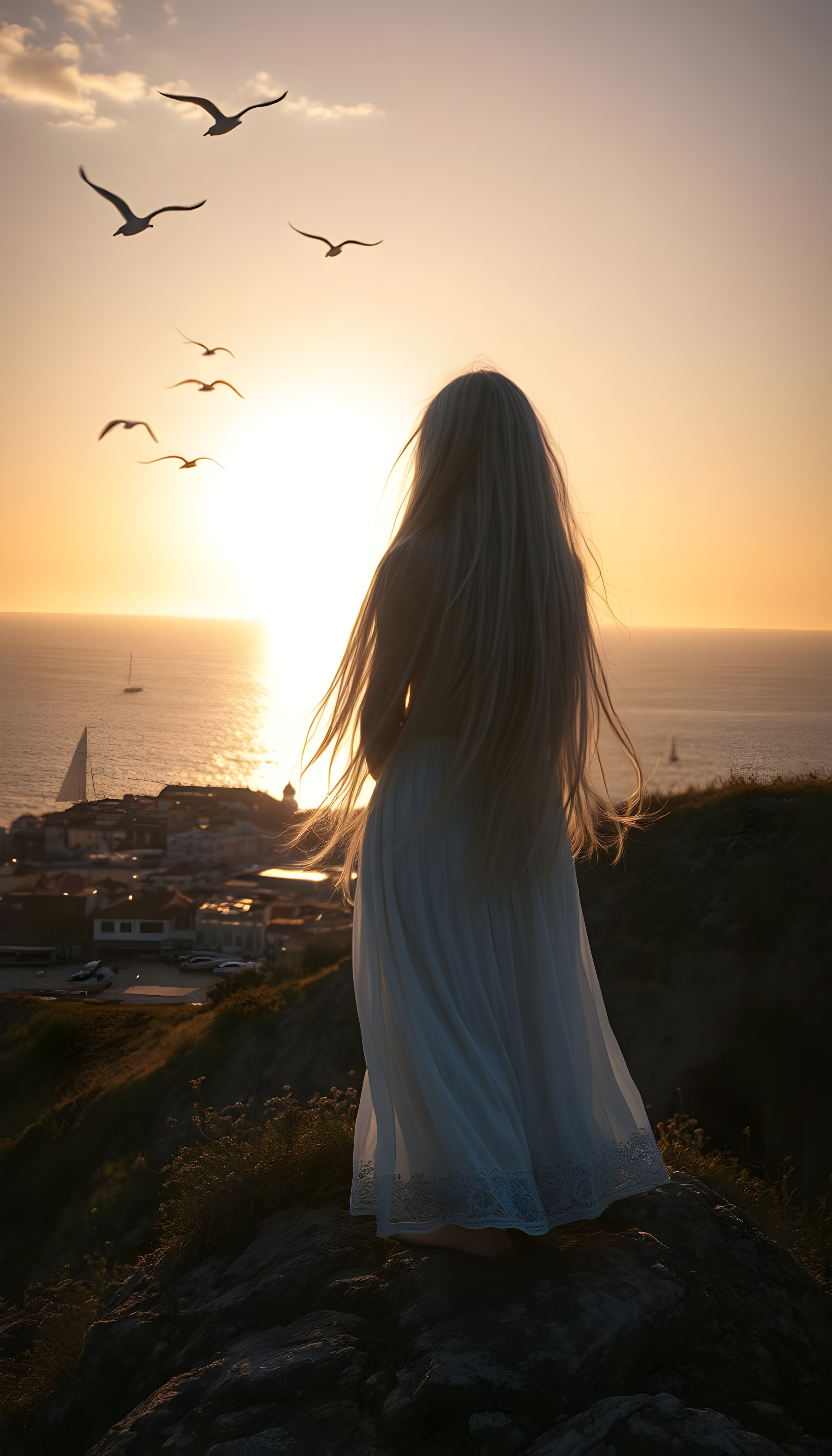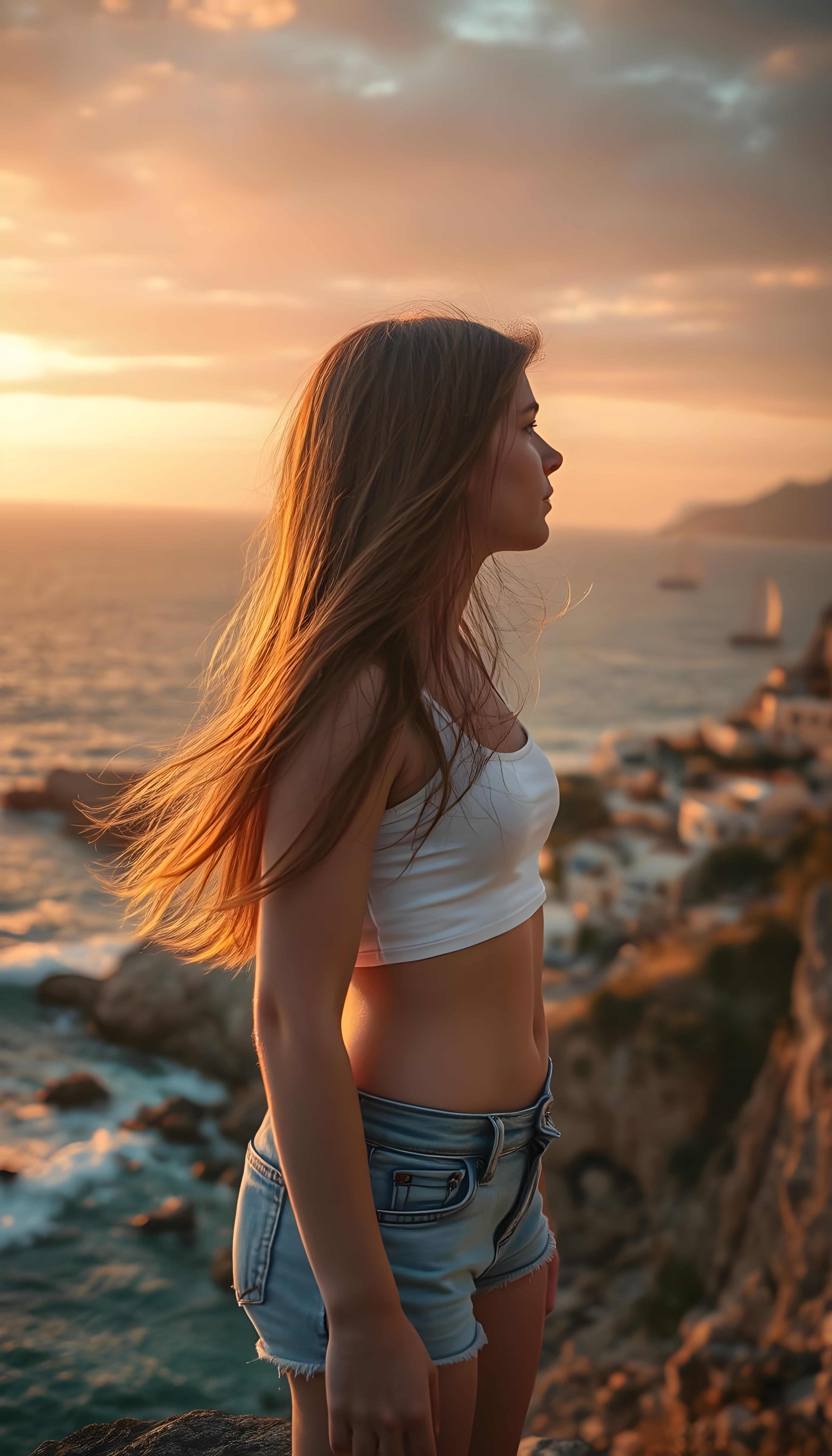 A young girl with flowing auburn hair stands on a cliff overlooking a vibrant coastal town, her silhouette framed by the golden hues of sunset. She wears a white crop top and denim shorts, her form gently illuminated by the warm, golden light. The ocean below is a vivid blue, with waves crashing against the rocky shore. The sky is painted with shades of pink and orange, creating a dreamlike atmosphere. In the distance, sailboats glide across the water, adding a touch of adventure to the serene scene. The girl’s expression is contemplative, as she gazes out at the horizon, embodying a sense of peace and wonder.
