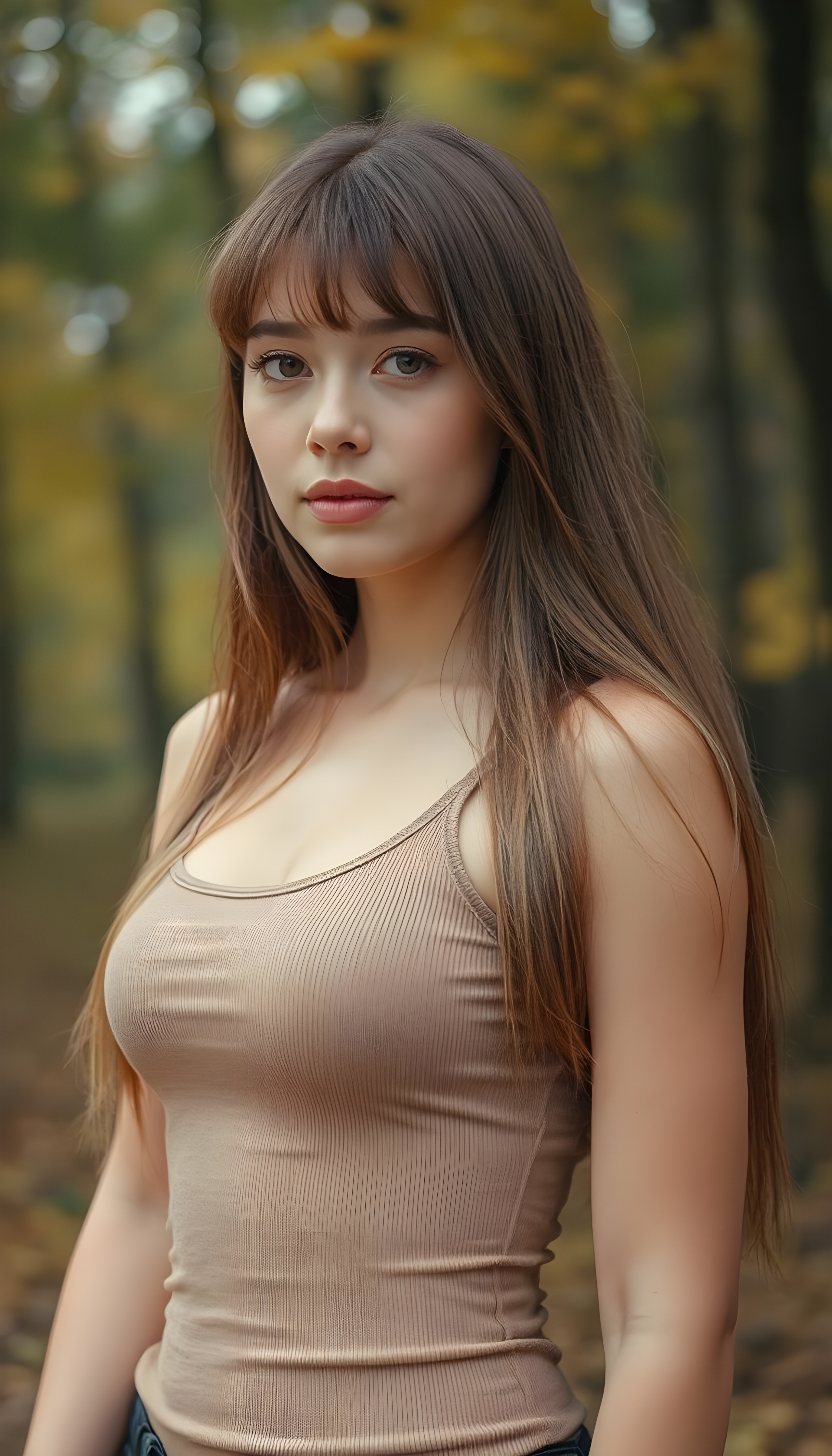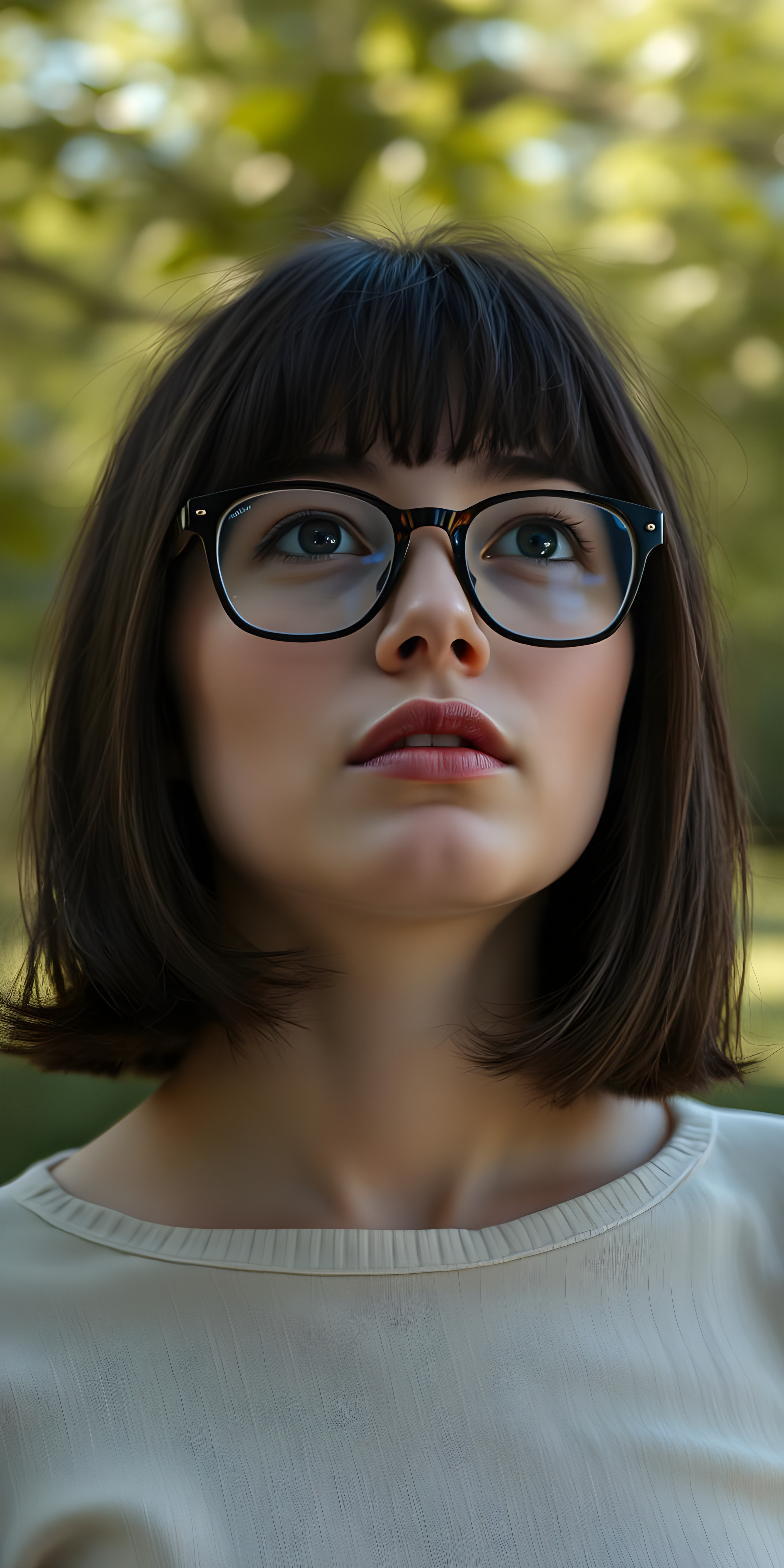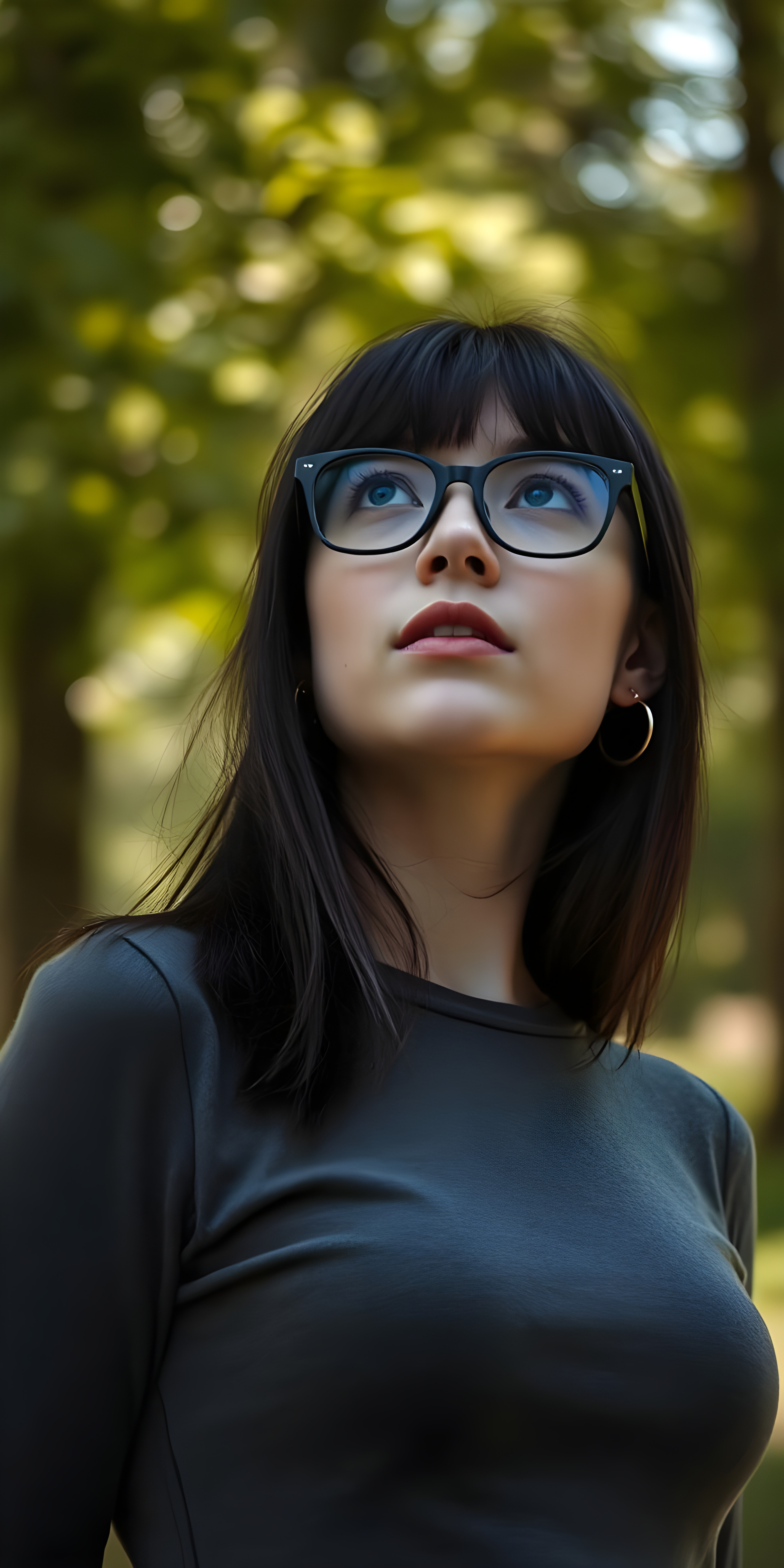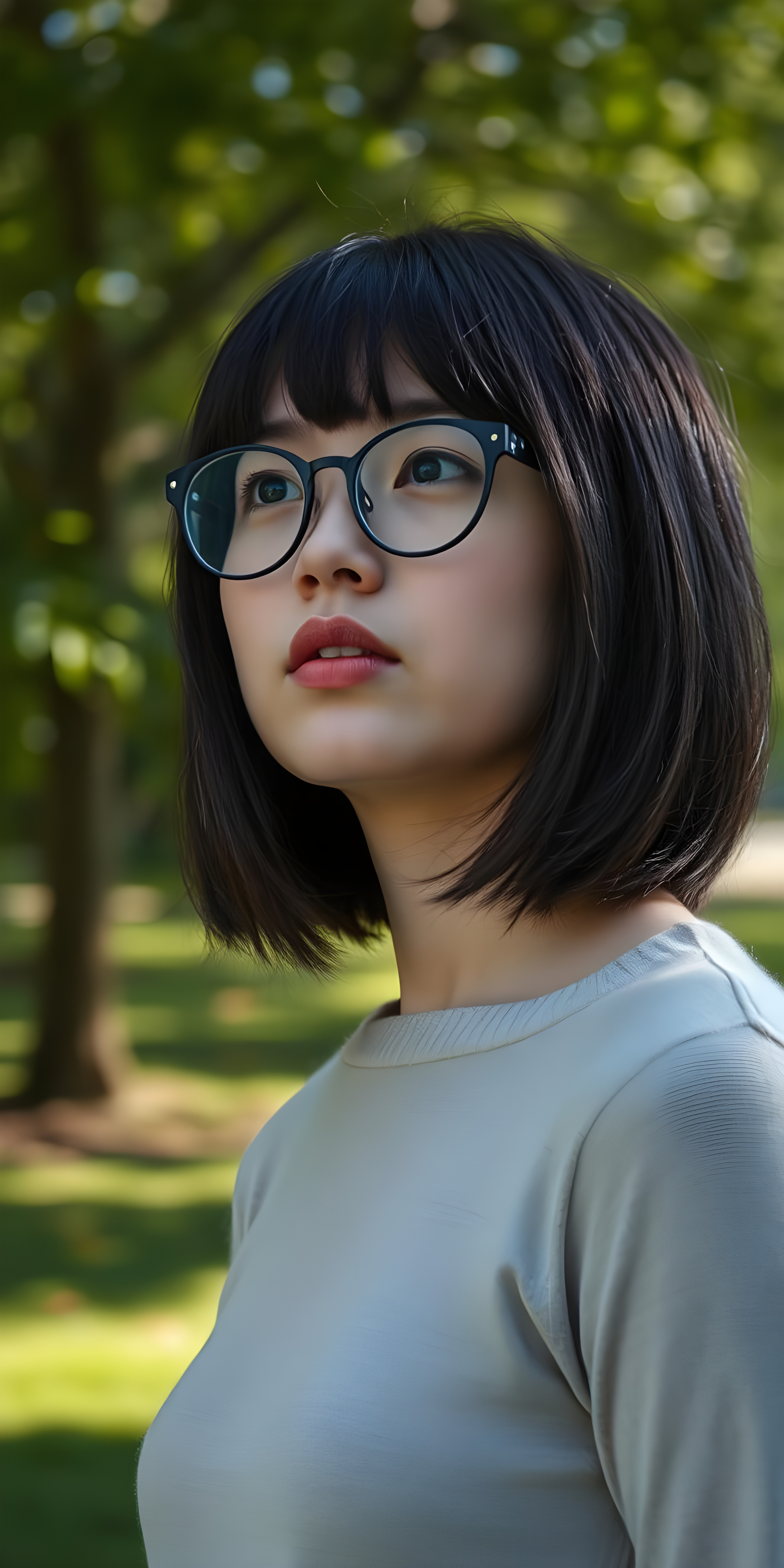 portrait from a stunningly beautiful young well busty nerd girl, flawless porcelain skin, wearing a large, dark prescription glasses, age 18, with ((black straight shoulder long jet super soft hair in bob cut and bangs frame her face (luminous)), flowing down, that match perfectly with her flawless complexion. She’s dressed in a plain tight ((super fine wool sweater)), perfectly complemented by her (perfectly proportioned female figure). She looks up, the mouth slightly open white teeth, all against a sunny green backdrop in a park.
