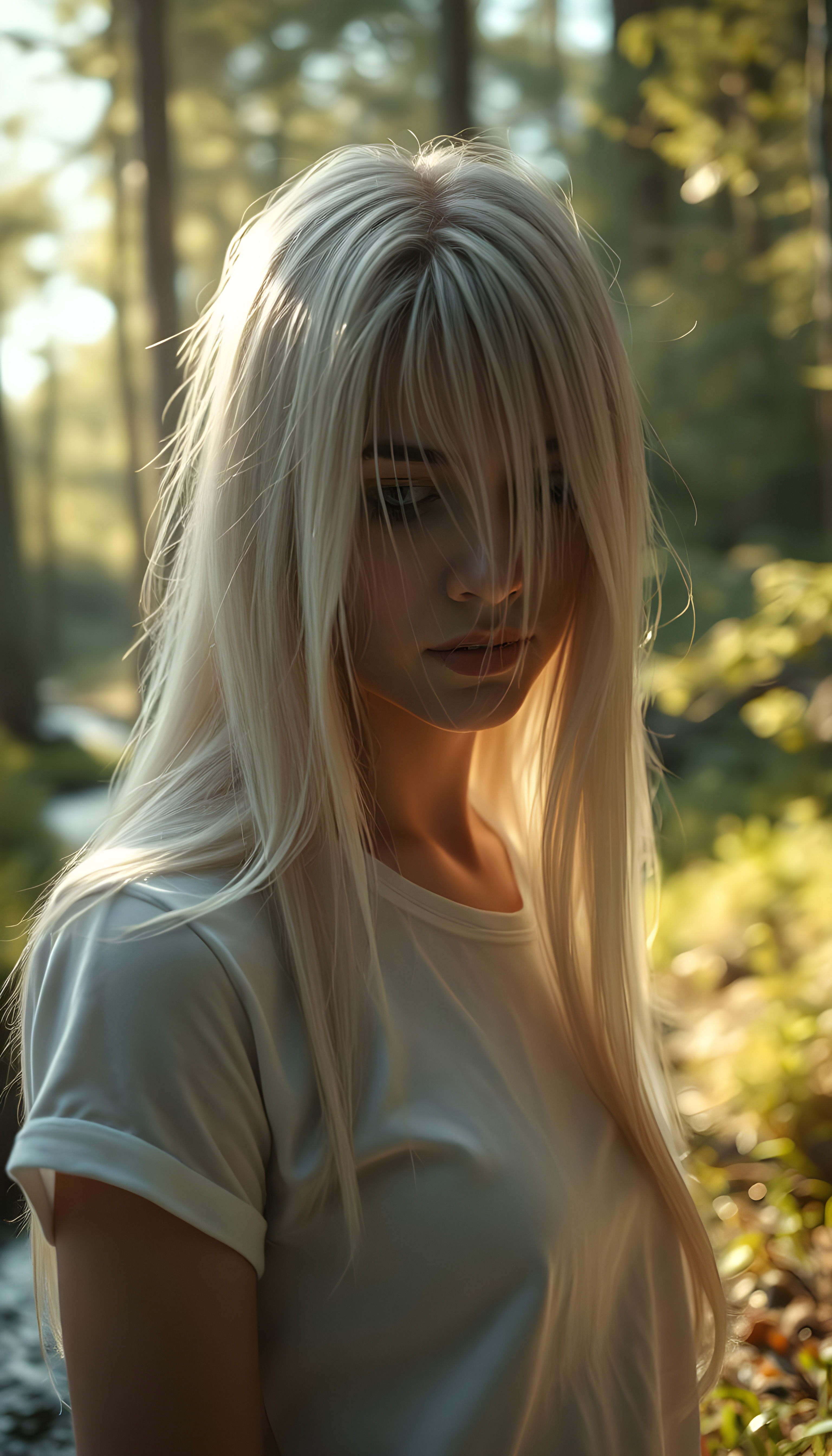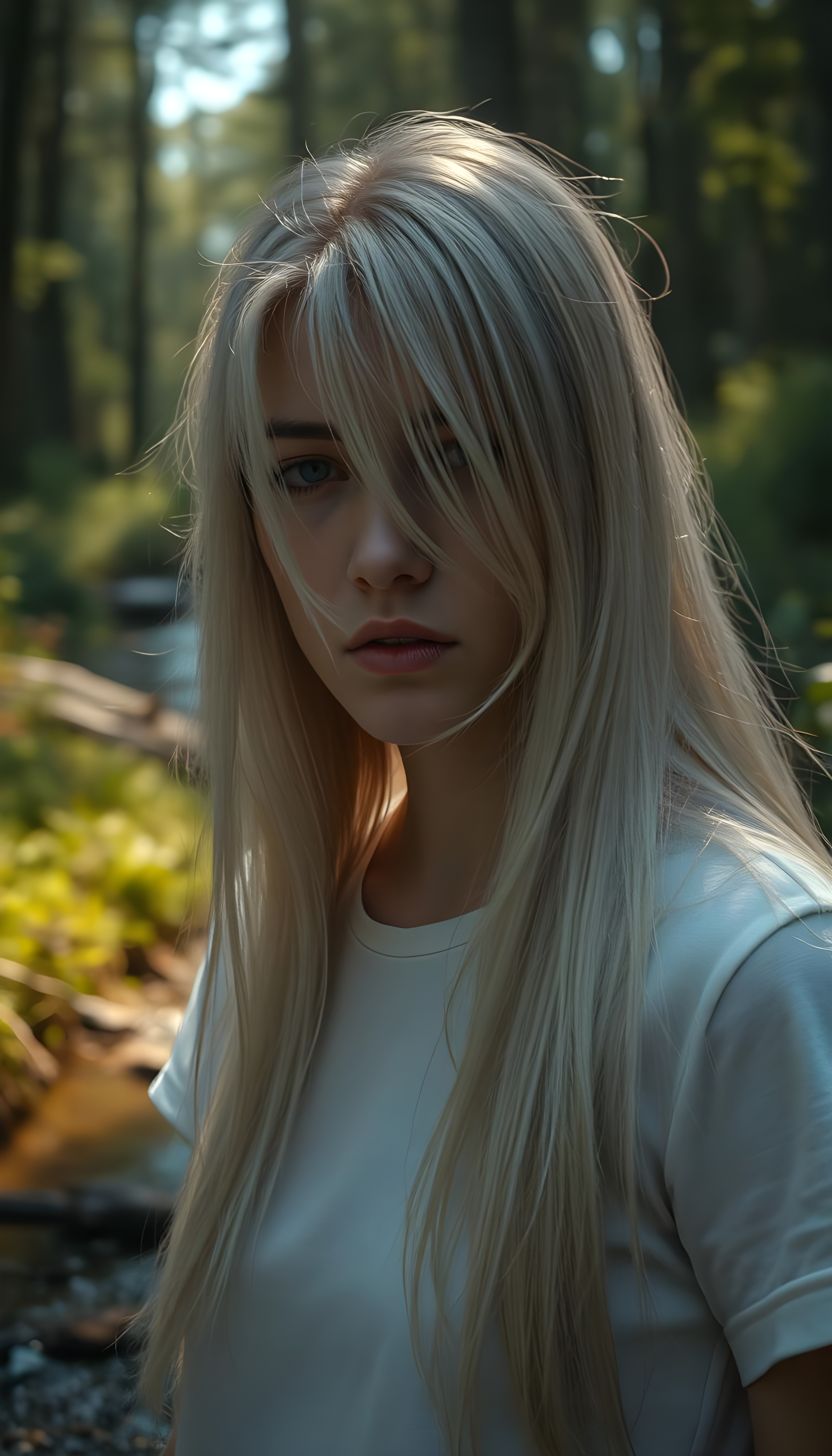 A hyperrealistic scene depicting a young adult woman with flowing, untamed, straight, silky white blonde hair cascading down her shoulders, her expression intensely sorrowful. She wears a minimalist white short-sleeve T-shirt. The image is set in a serene, sunlit forest with golden rays filtering through the trees, casting a warm glow on her face. The background features a gentle stream and lush greenery, enhancing the contrast between her melancholy and the vibrant natural surroundings. The composition is dynamic, with a low-angle shot emphasizing her hair and expression, creating a dramatic and emotionally powerful image.