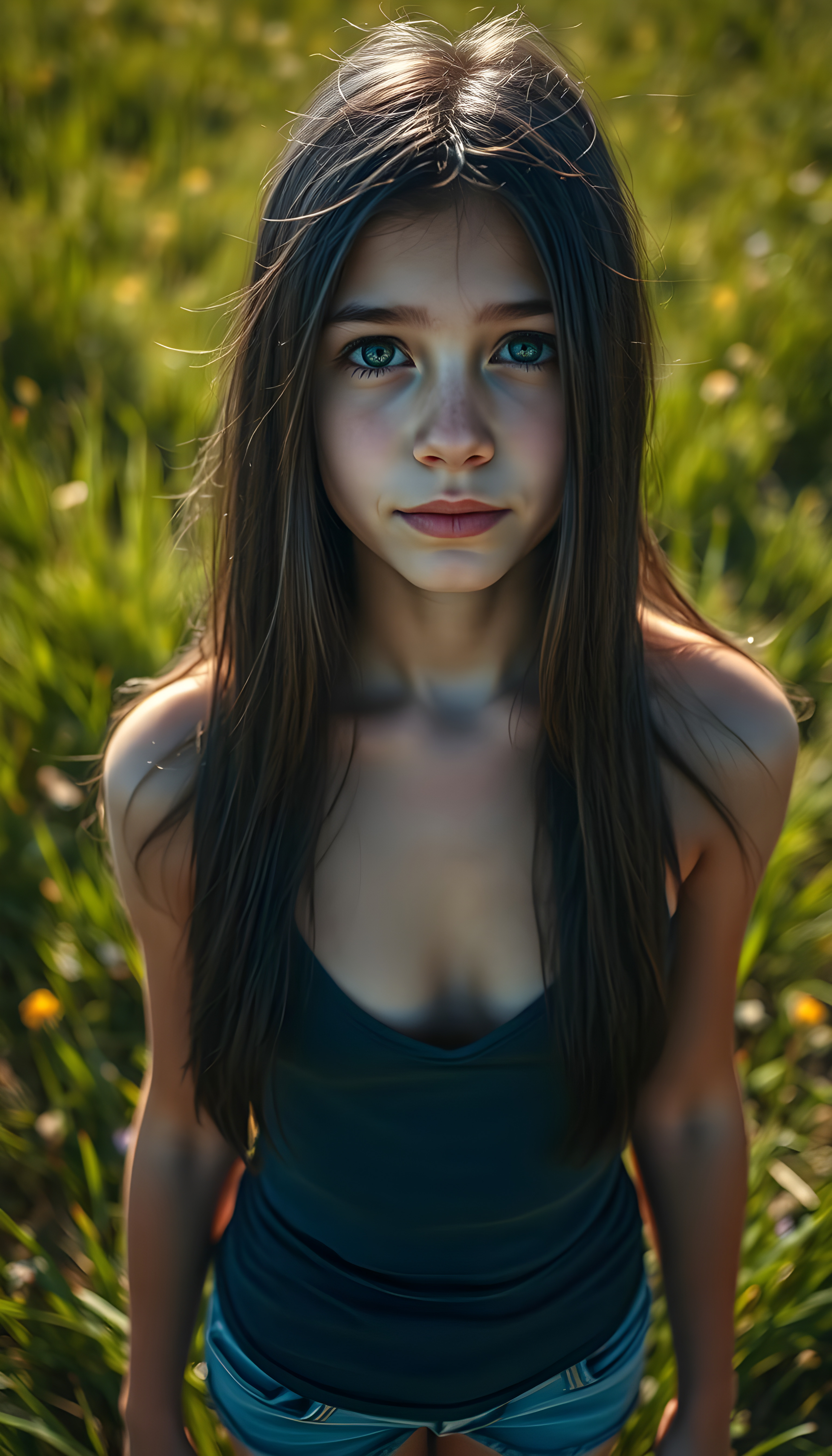 A young girl with long, straight, dark blue obsidian hair stands in a sunlit meadow, her shiny dark blue eyes sparkling under the bright sun. She wears a tight, form-fitting short tank top with a deep v-neck, revealing a bit of her chest. The scene is viewed from above, showcasing her full body and the vibrant green grass beneath her feet. The lighting casts gentle shadows, creating a serene and cheerful atmosphere, Photograph Portrait Close-up Sharp focus 35mm