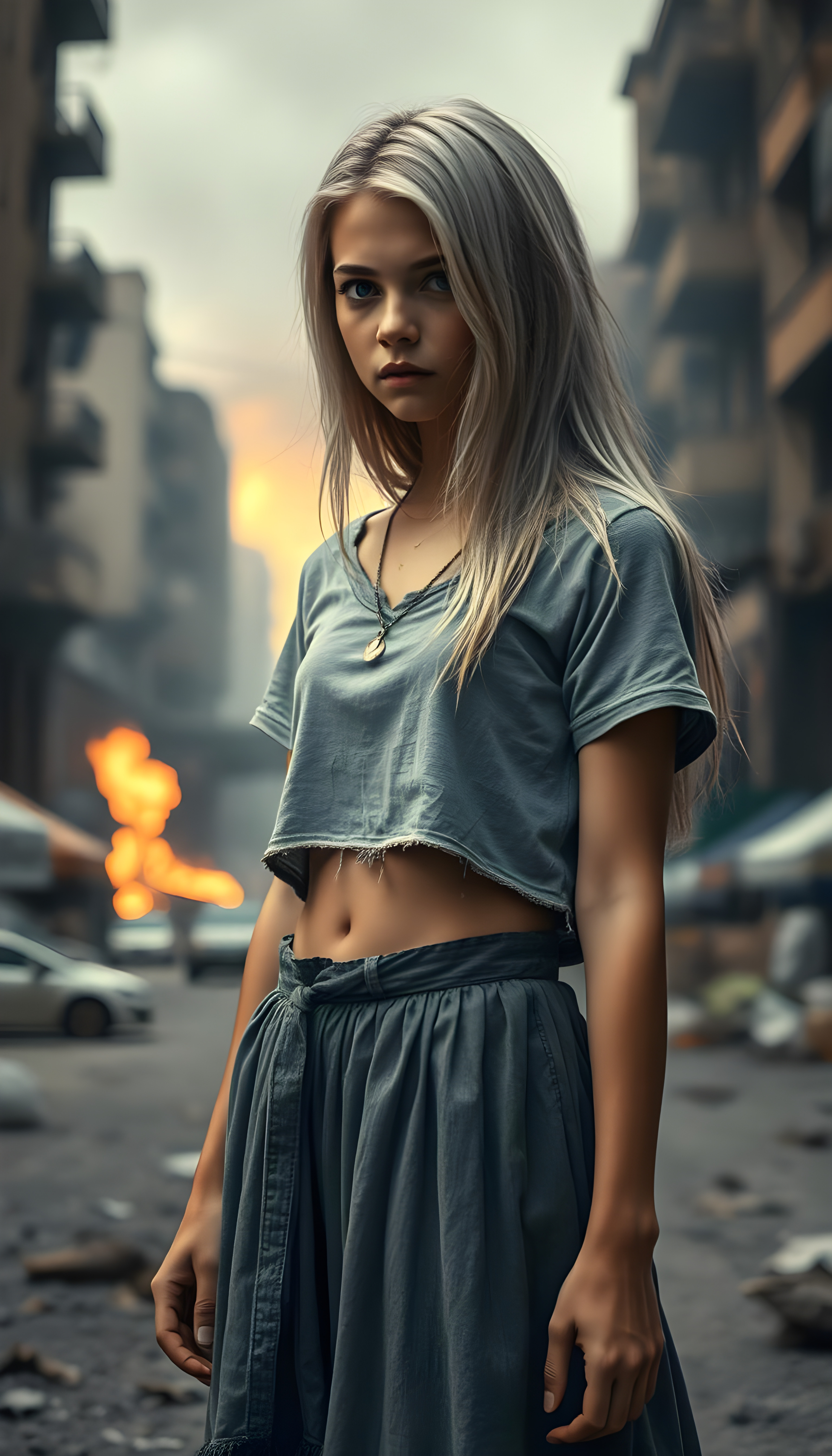 a ((gorgeous)) ((stunning)) cute young sad girl, full body portrait, pencil drawing, poor dressed in a thin and fine tattered cropped t-shirt and a round long skirt, fine open straight snow white silky hair, she stands i a destroyed street in a burning city