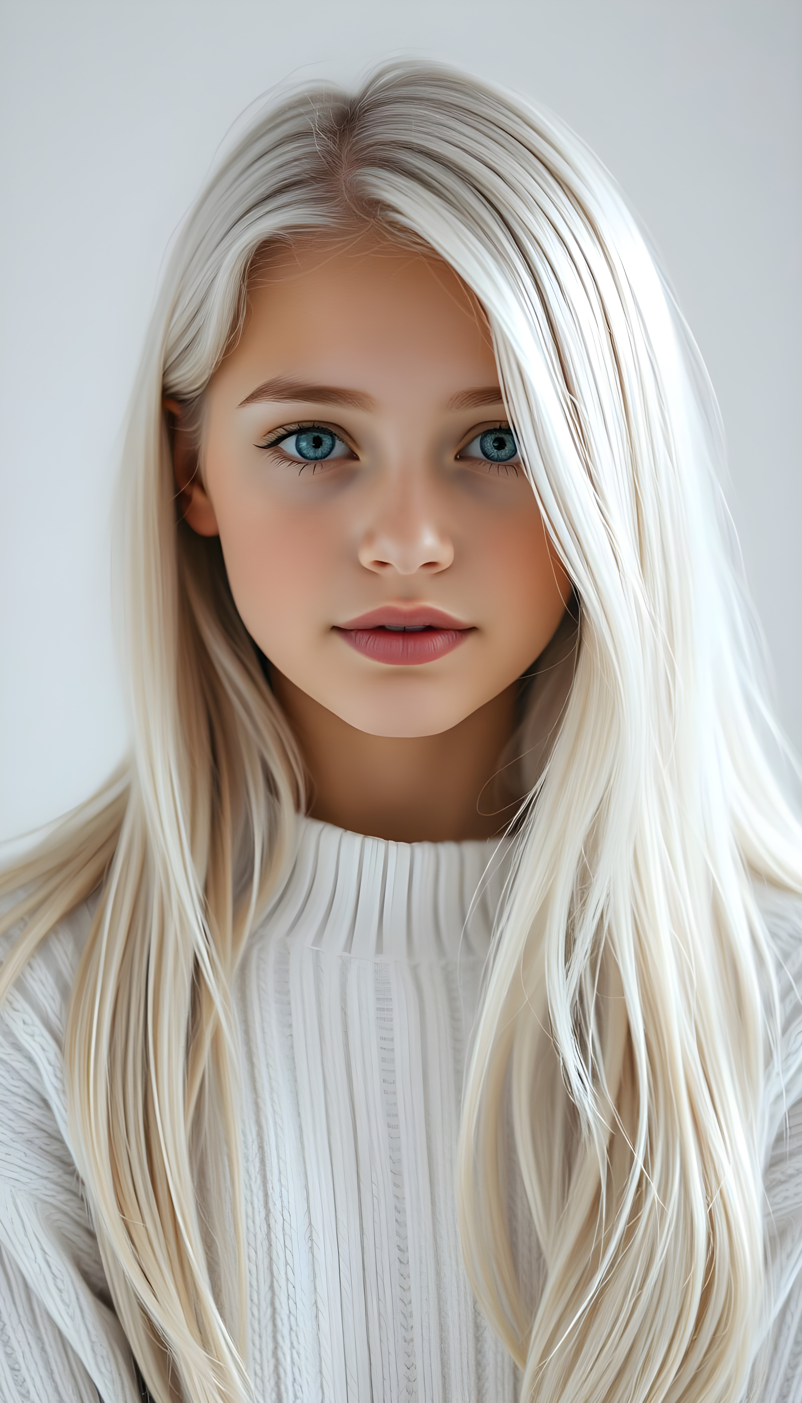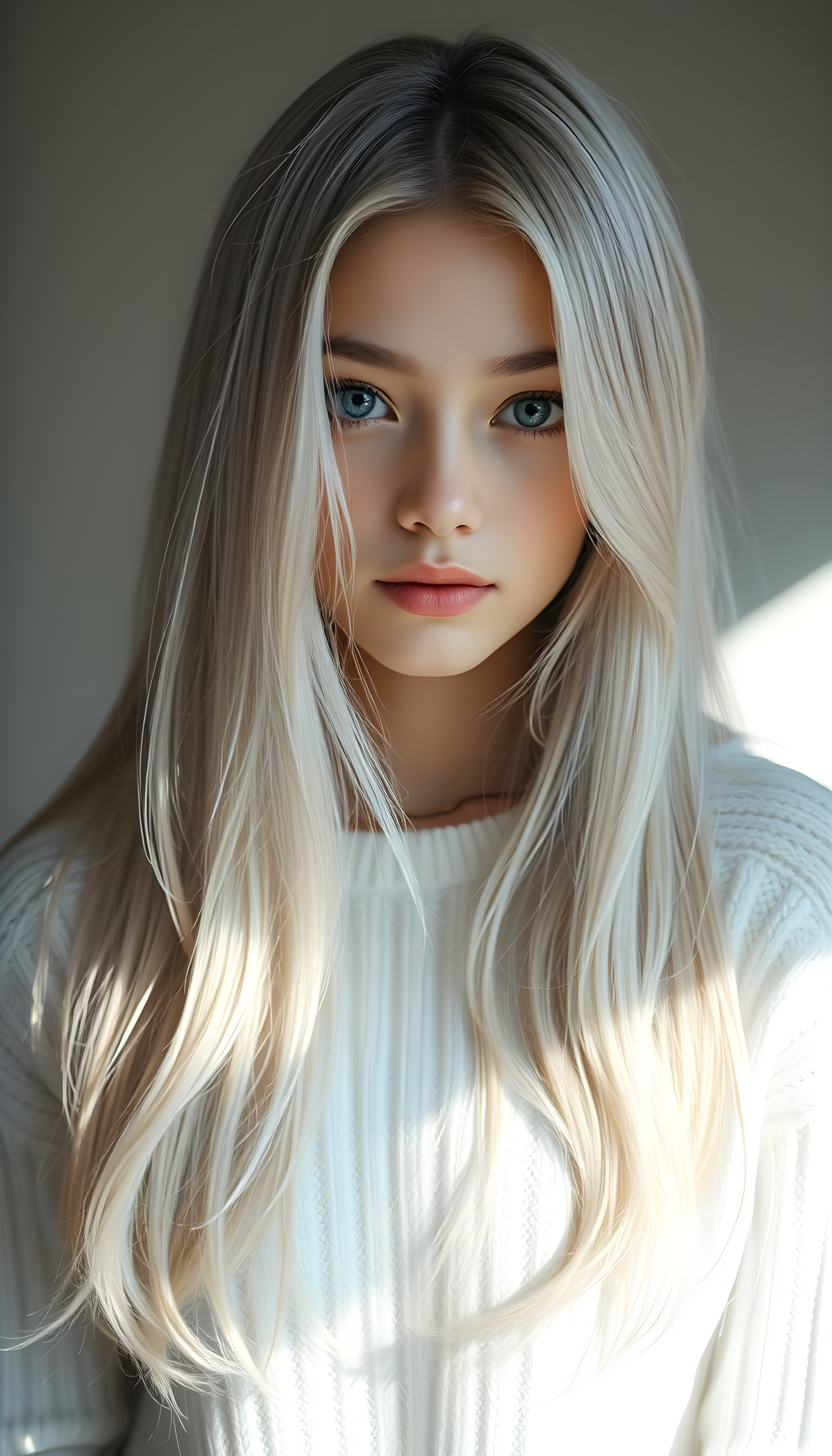 a ((gorgeous)) ((stunning)) cute young girl, full body portrait, pencil drawing, thin and fine white sweater, fine open straight snow white silky hair. The photo is very realistic, with small details. Light falls in and creates perfect shadows.