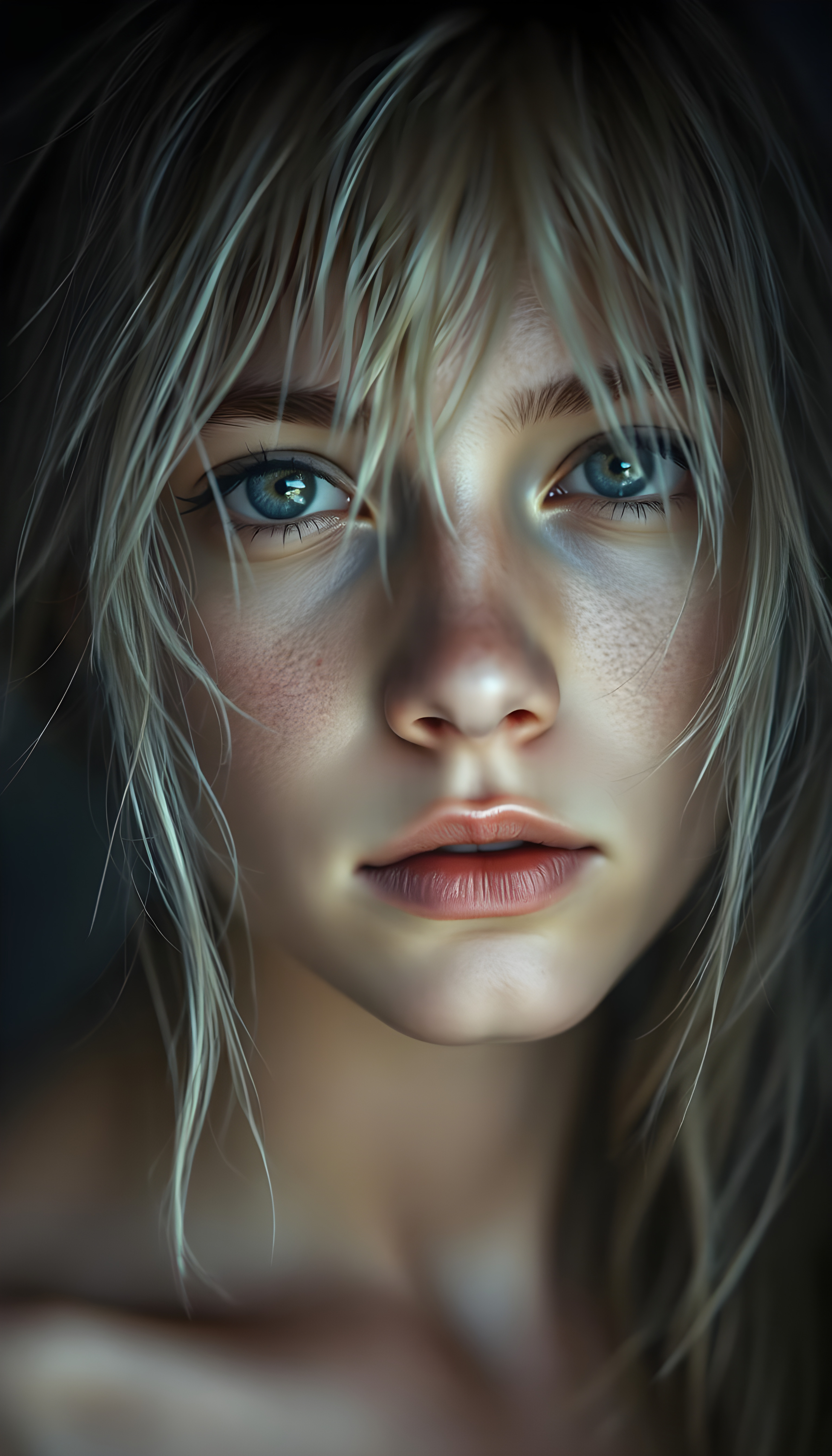A stunning portrait of a beautiful girl with wet, tousled white hair, rendered in a harmonious blend of watercolor and digital art techniques. Her face is framed by a dark, misty background that accentuates her luminous features. The scene is bathed in soft, diffused lighting that highlights the intricate details of her expression and the texture of her hair. The composition is rich in depth and volume, with subtle fractal patterns subtly enhancing the realism. The color palette is dominated by dusty tones and muted shades, creating a cinematic, dreamlike atmosphere. This close-up captures the delicate beauty and ethereal quality of her visage, with every strand of hair and crease meticulously detailed, evoking a sense of depth and emotion.