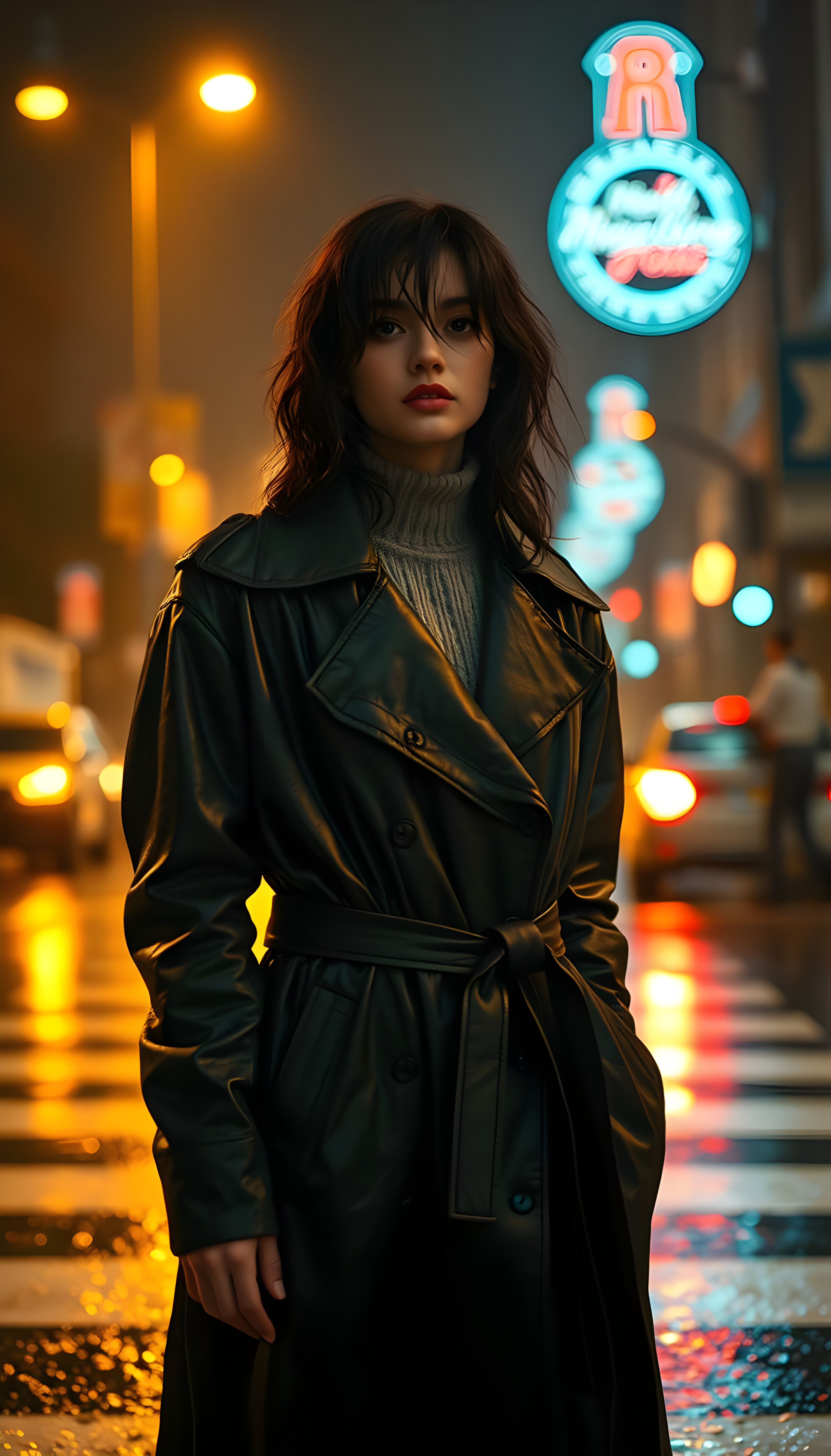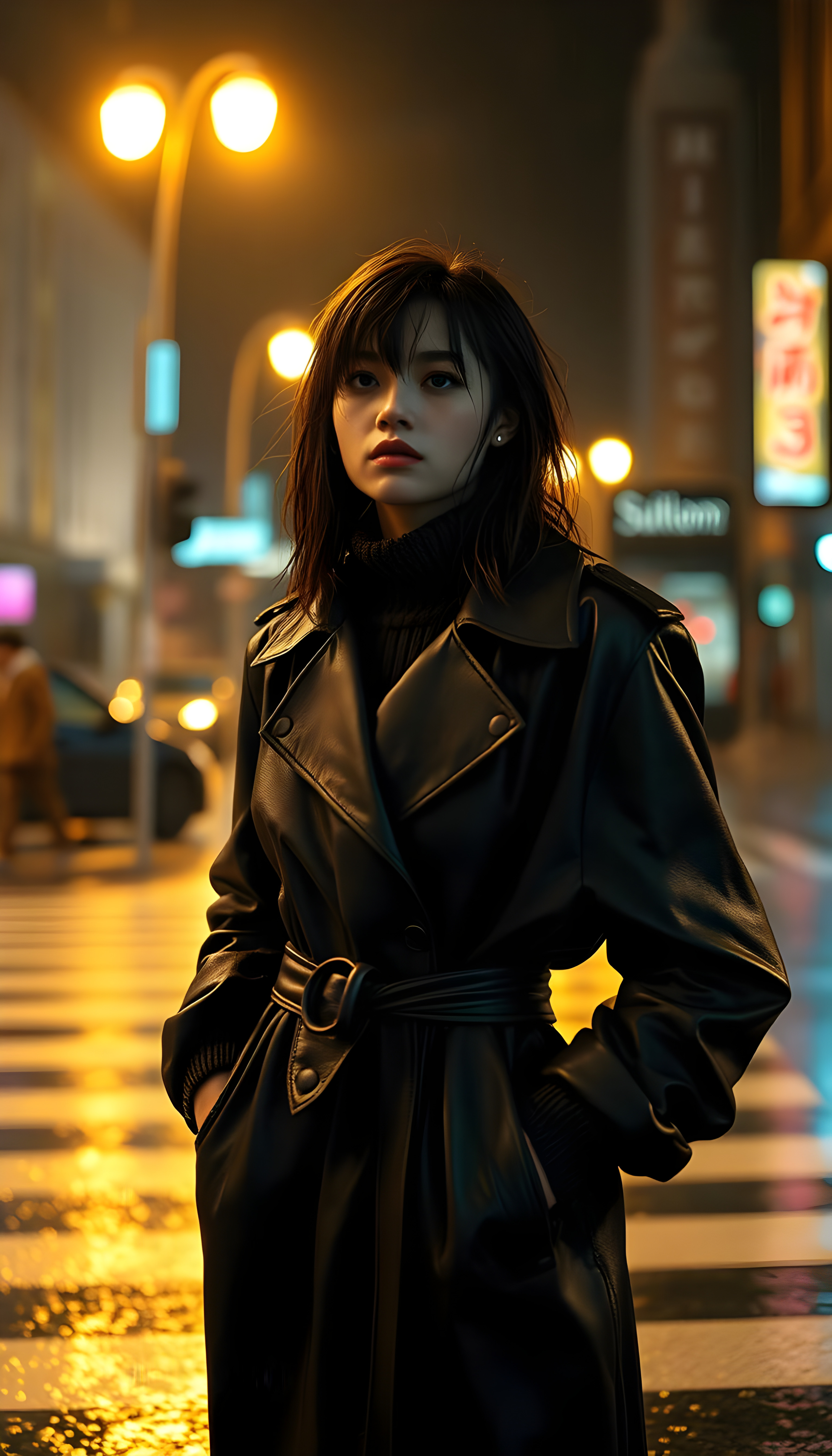 A young woman with wet, tousled dark hair cascading across her face stands on a rain-soaked crosswalk at night. She is dressed in an oversized, belted black leather trench coat over a thick knit sweater, her lips slightly parted as she gazes into the distance. The scene is bathed in warm golden light from streetlamps, with blurred headlights creating a bokeh effect behind her. Neon lights in faint blues and reds add a vibrant contrast. The image is shot from a low angle, emphasizing her expressive pose as if caught in motion. The lighting is cinematic, with glowing highlights on wet surfaces, and incorporates analog unpredictability, light leaks, and softness. The style combines VHS distortions with sharp CG Unity detailing, preserving the atmosphere of a Hasselblad 500CM with Kodak Ektachrome’s grain and glow, creating a raw, nostalgic yet sharp visual impact.