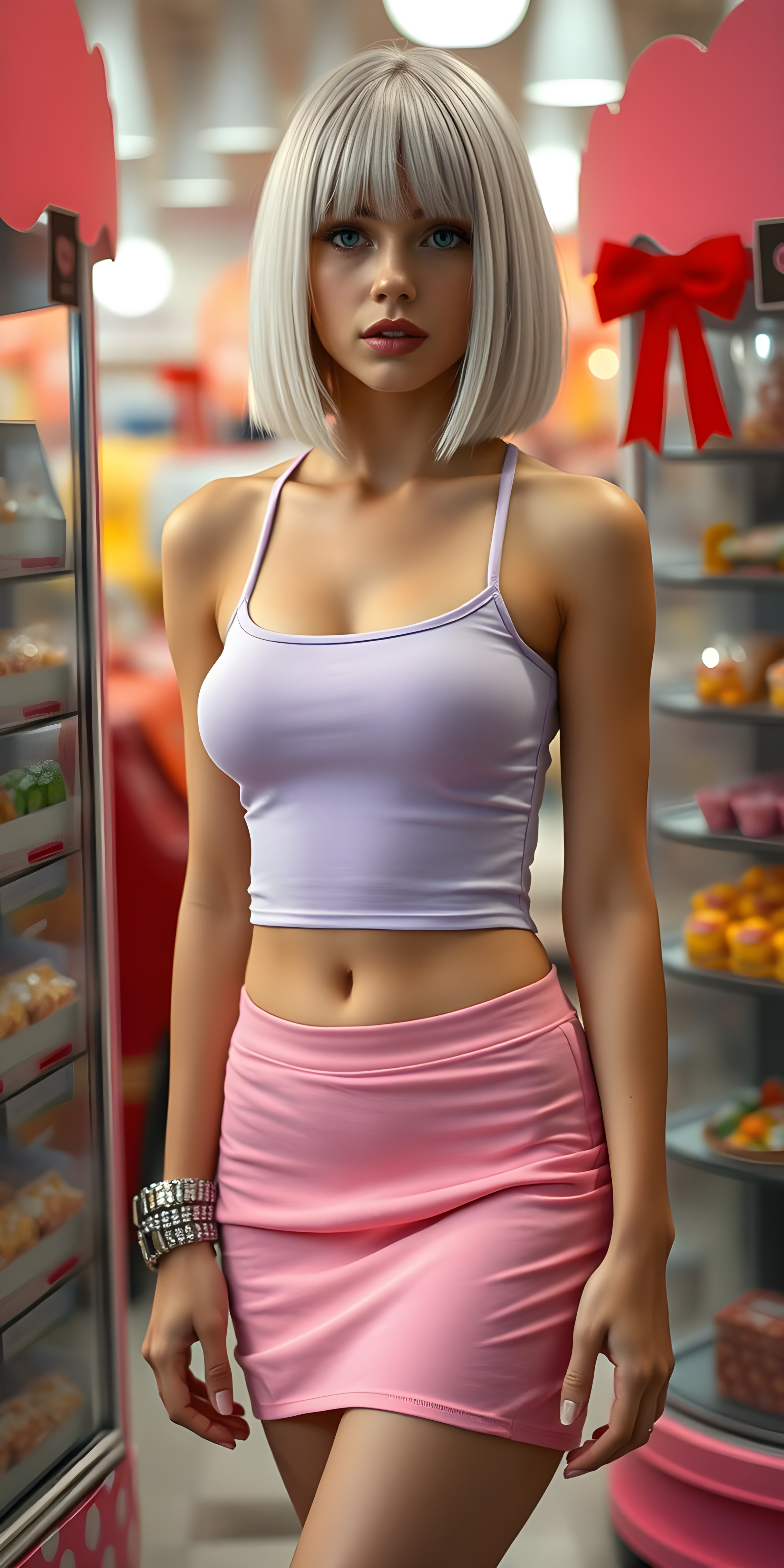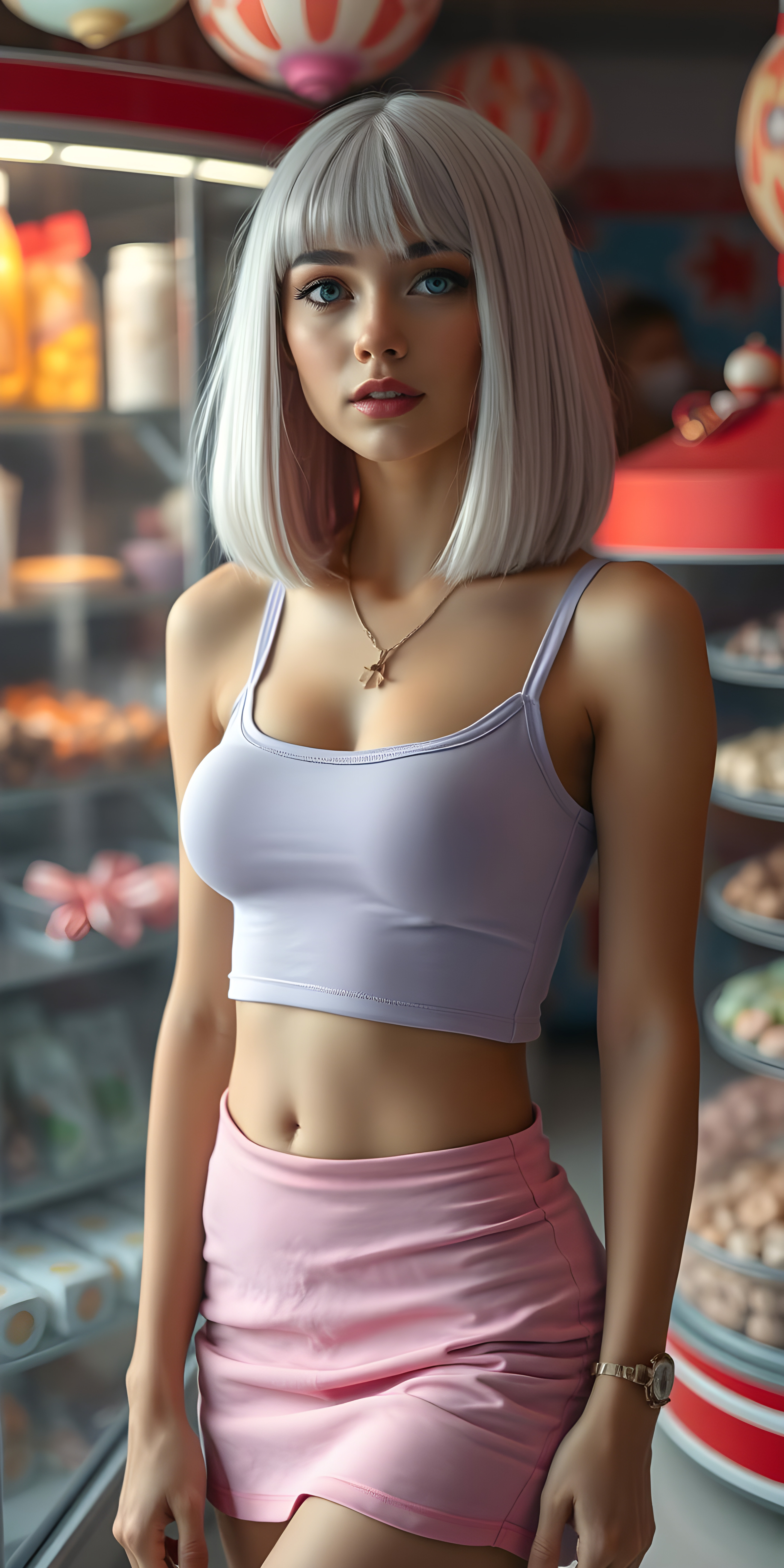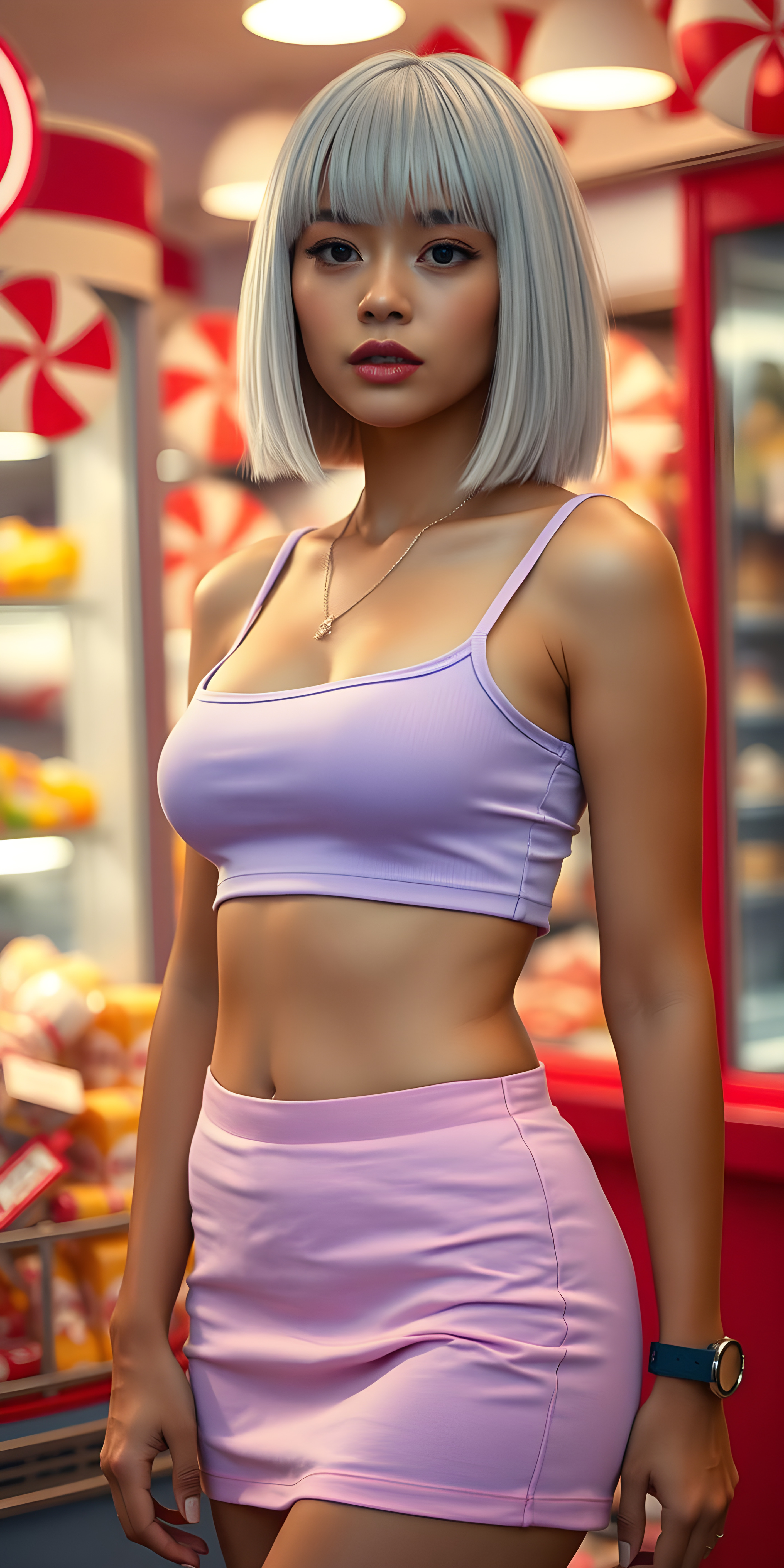 a full body view form a stunning beautiful natural busty girl, straight white hair in bob cut, wears only a plain light purple plain thin cropped tank top and a short round pink mini skirt, perfect curved female body, soft skin, round face, kissable lips, seductive, she stands in a candy shop.