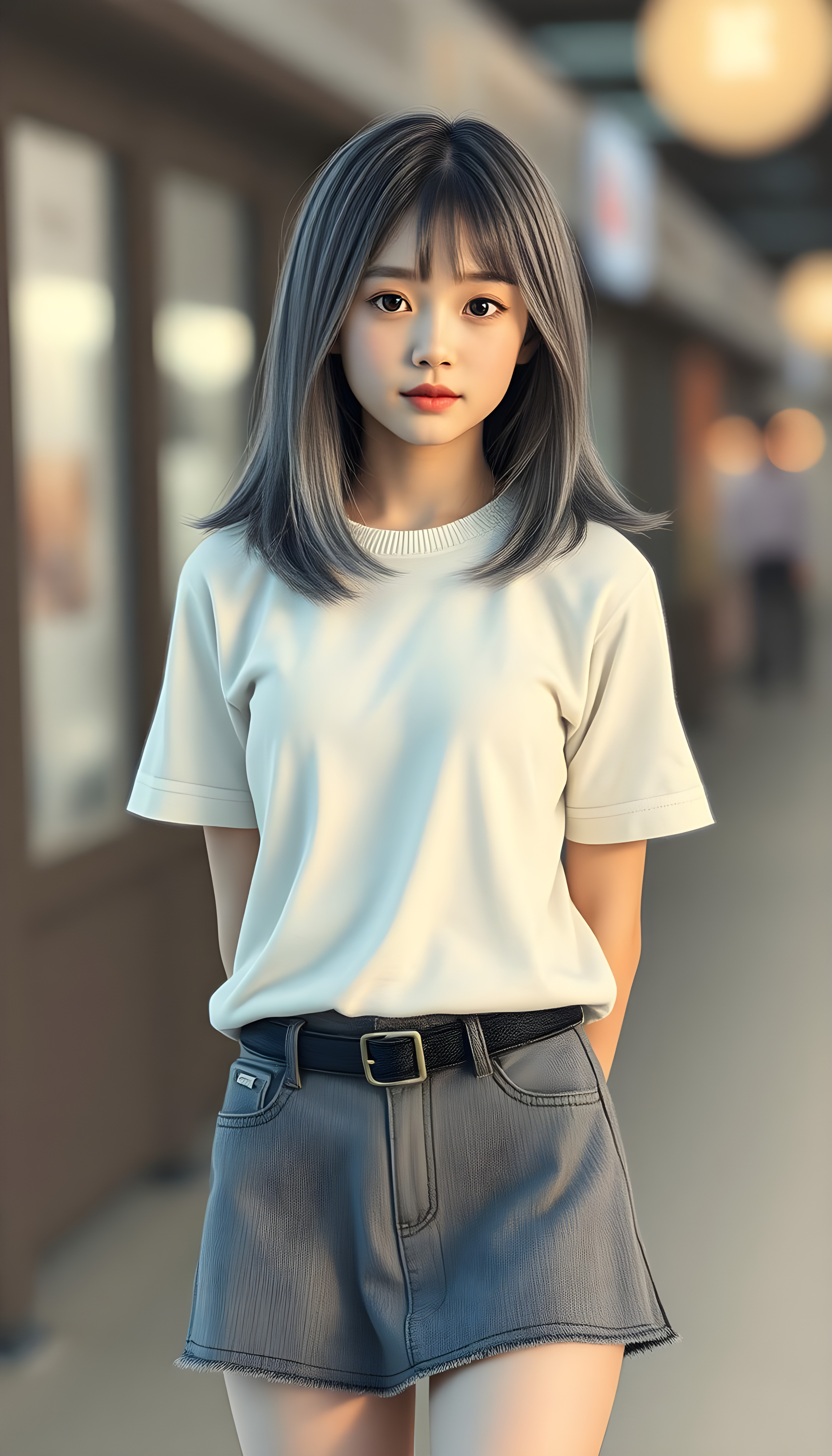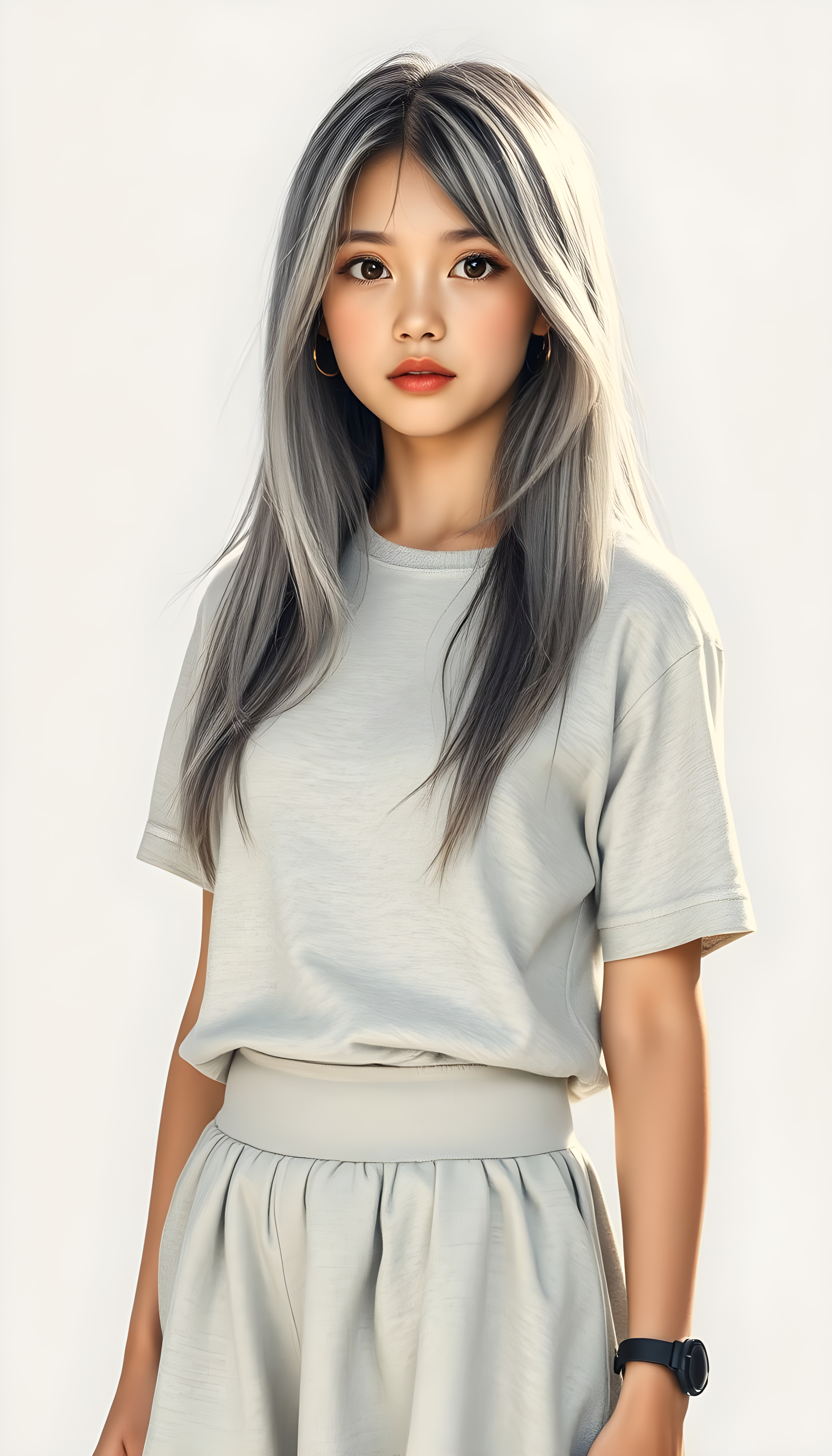 super realistic, detailed, ((gorgeous)) ((stunning)) cute young girl, full body portrait, 18 years old, pencil drawing, thin and fine wool t-shirt and a round short mini skirt, fine open straight ash grey shiny hair