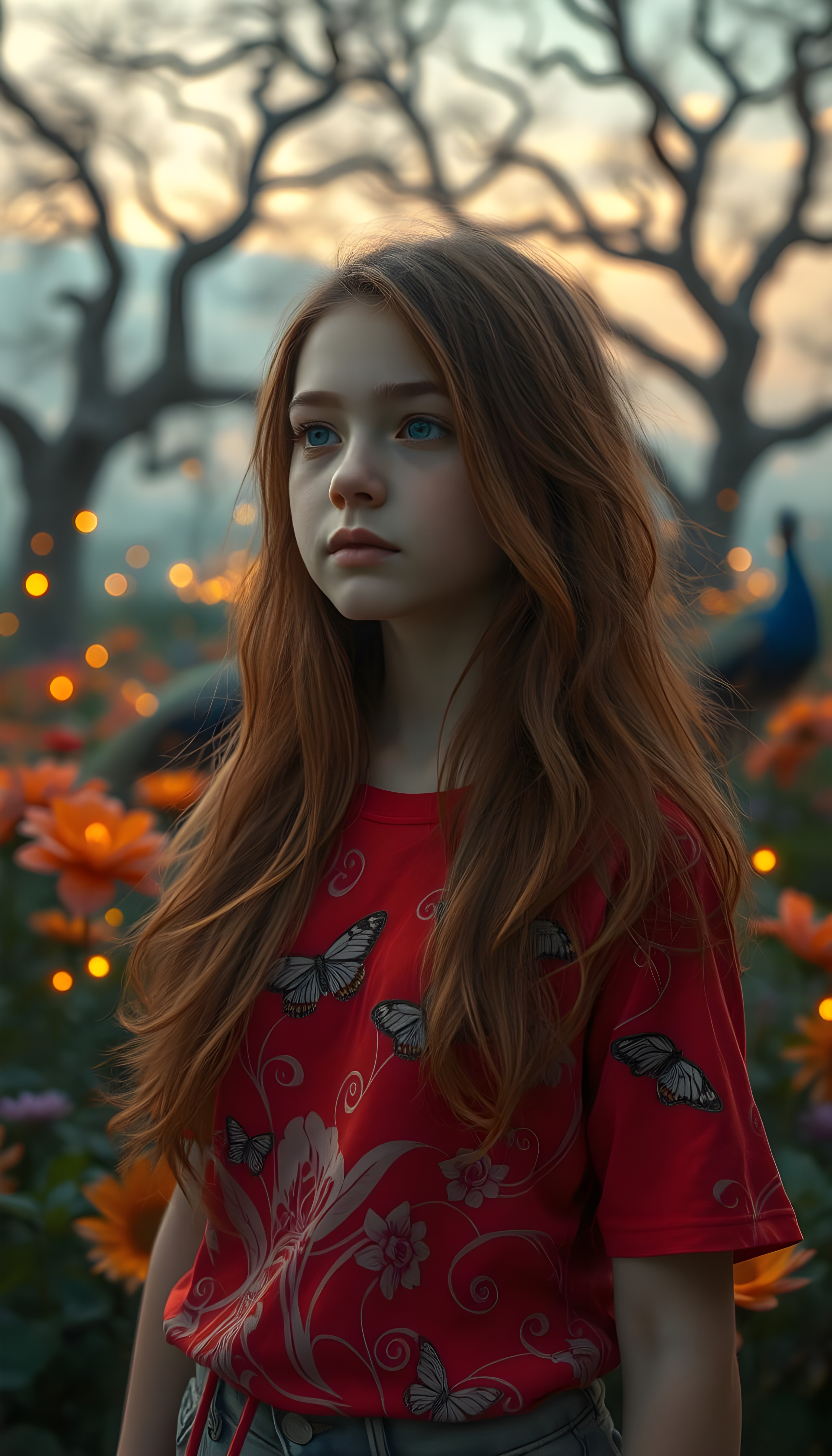 A vibrant, imaginative scene featuring a young girl with long, flowing auburn hair cascading down her shoulders, her large blue eyes gazing dreamily into the distance. She wears a striking red thigh t-shirt adorned with intricate patterns of swirling clouds and dancing butterflies. The setting is a whimsical, enchanted garden filled with oversized flowers in every hue of the rainbow, glowing softly under a twilight sky. Ethereal fireflies illuminate the scene, casting a magical glow. In the background, majestic peacocks with iridescent feathers strut gracefully among ancient, twisting trees. The atmosphere is serene and mystical, evoking a sense of wonder and adventure.