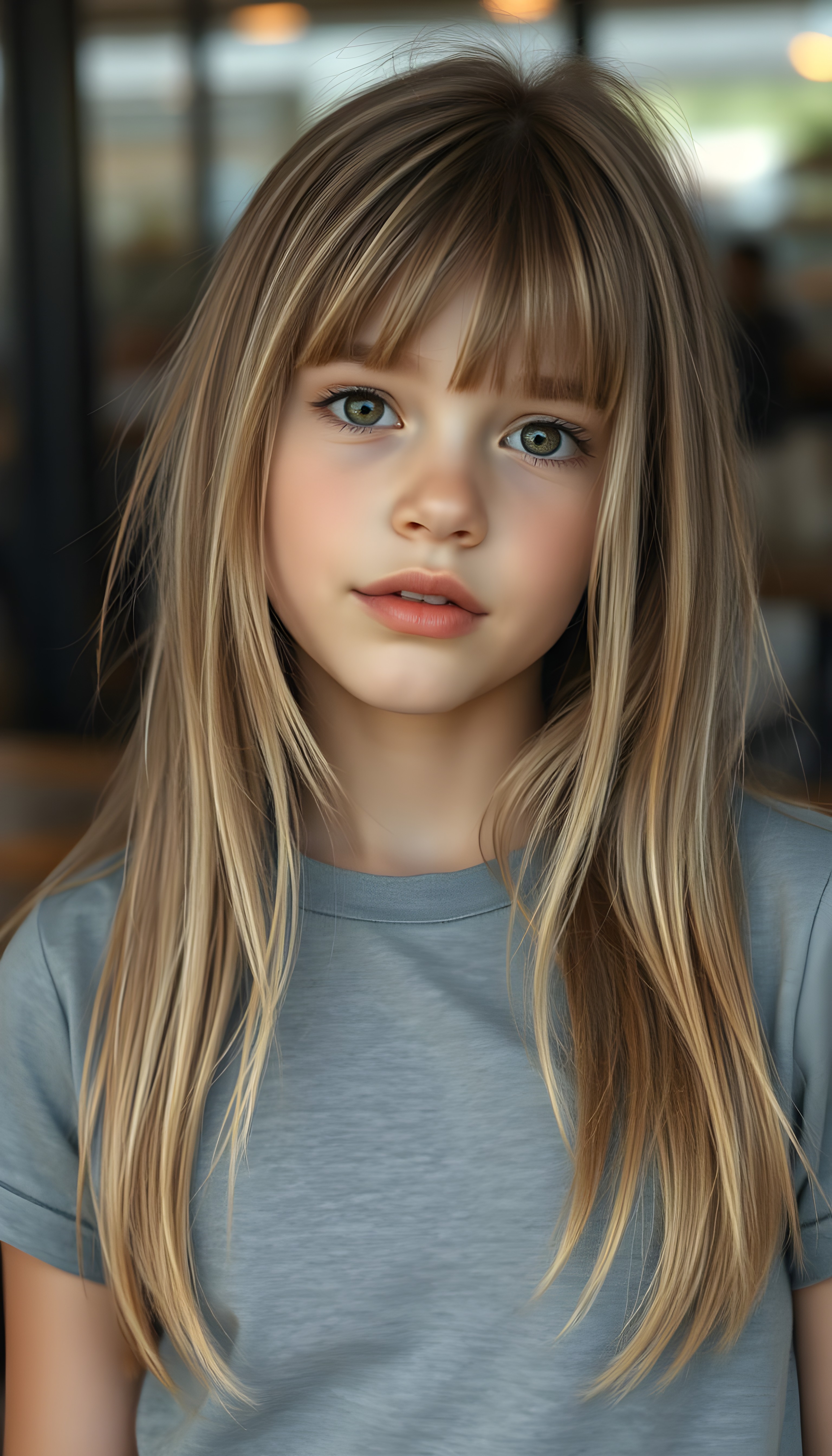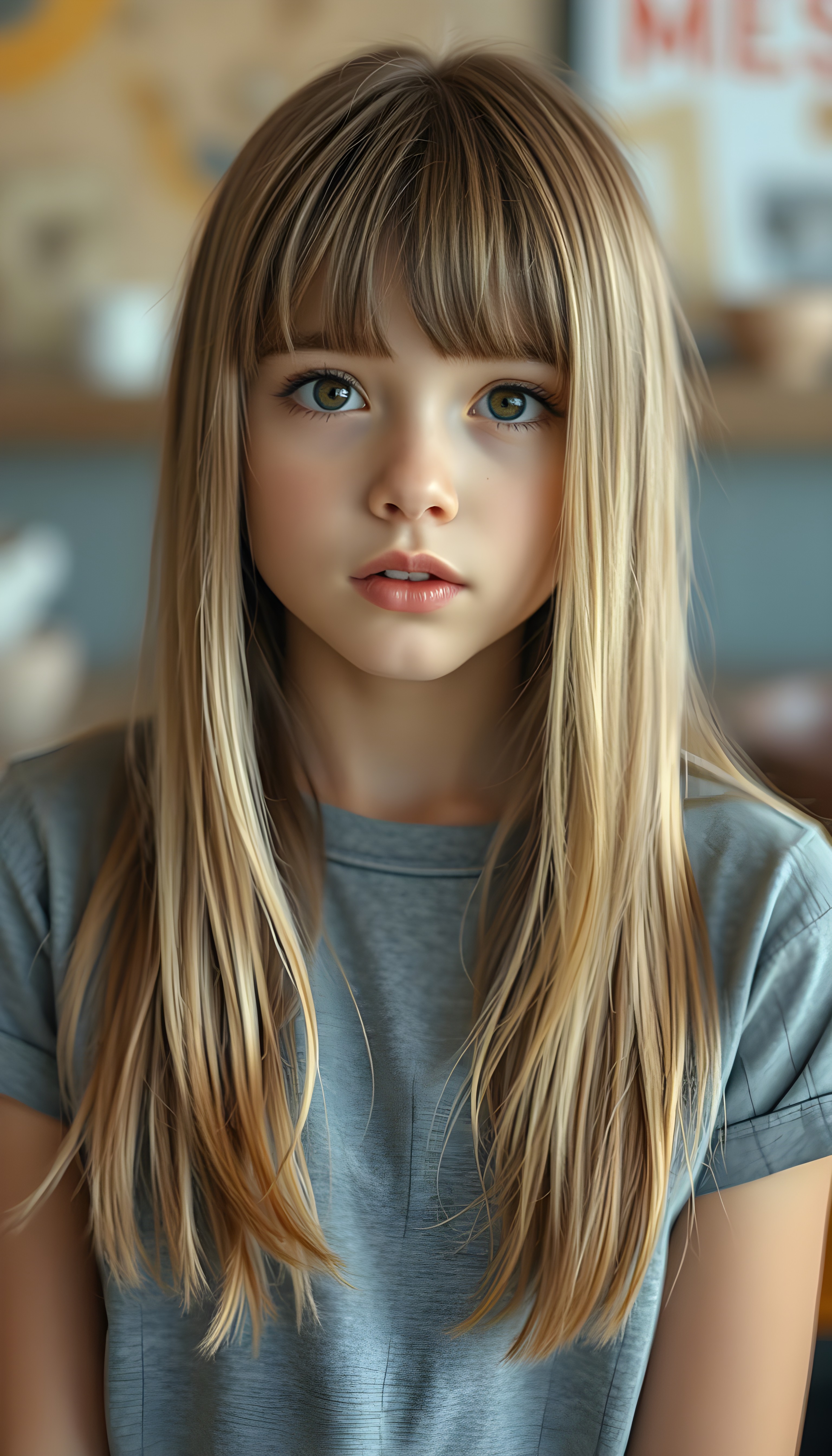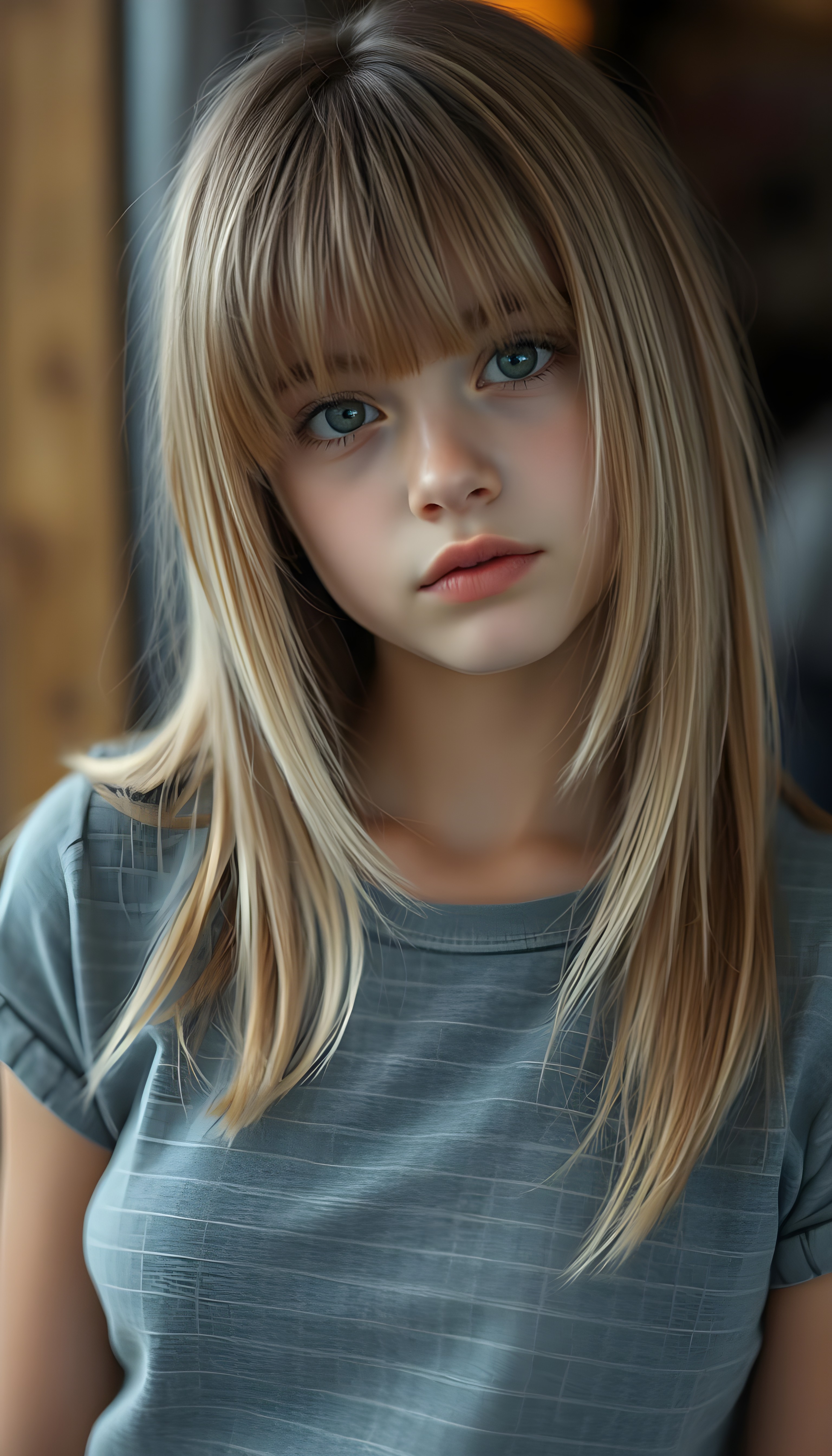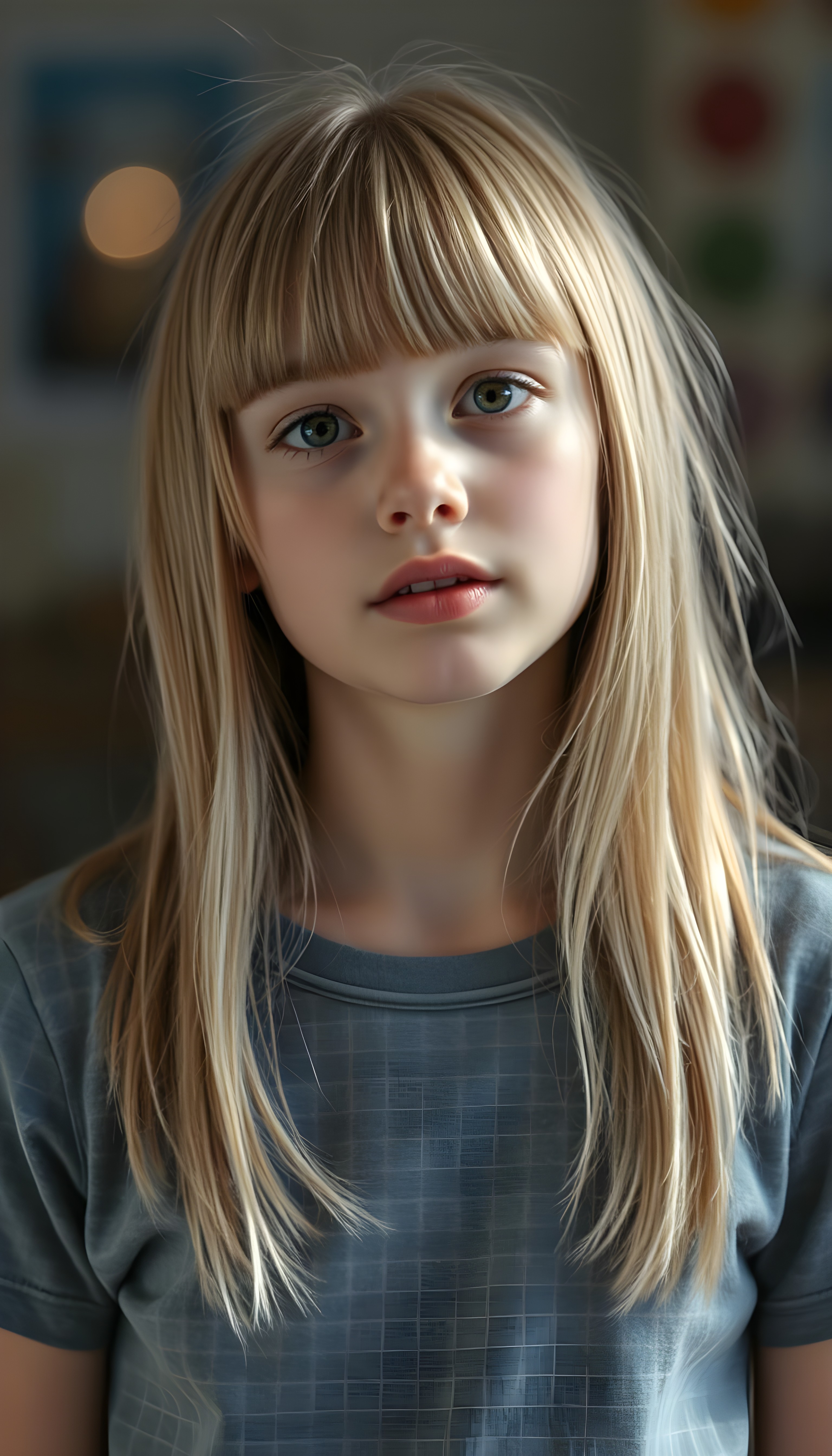 A young girl with straight golden blonde hair and light brown highlights, her hair falling gently over her upper body, bangs cut frame her round face. She tilts her head slightly. She has dark, round, large eyes and a pouty mouth. She wears a grey checkered T-shirt that accentuates her wonderful, feminine body. She has a round face, beautiful full lips, her mouth slightly open, and white teeth.