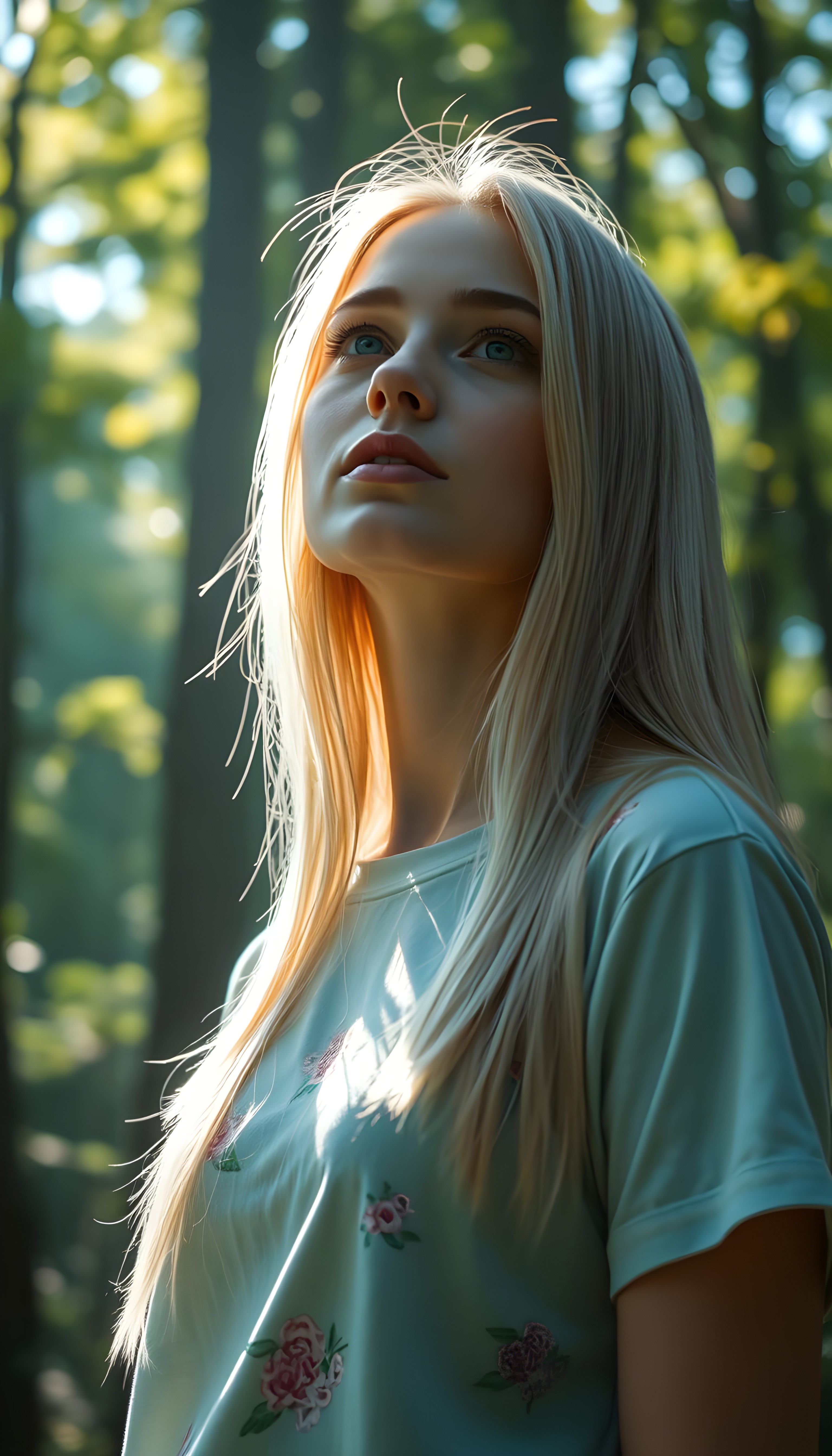 A young woman with straight, shiny light blonde hair cascading over her shoulders is captured in a whimsical forest setting. She wears a vibrant t-shirt with delicate floral patterns, her attire shimmering in hues of pastel blues and pinks. The sunlight filters through the lush canopy, casting a magical glow on her, highlighting her innocent and curious expression as she gazes upward. The background is filled with towering trees, their leaves forming a mosaic of green and golden light, creating a dreamlike, serene atmosphere. This composition is inspired by a fairy tale, blending realism with a touch of fantasy.