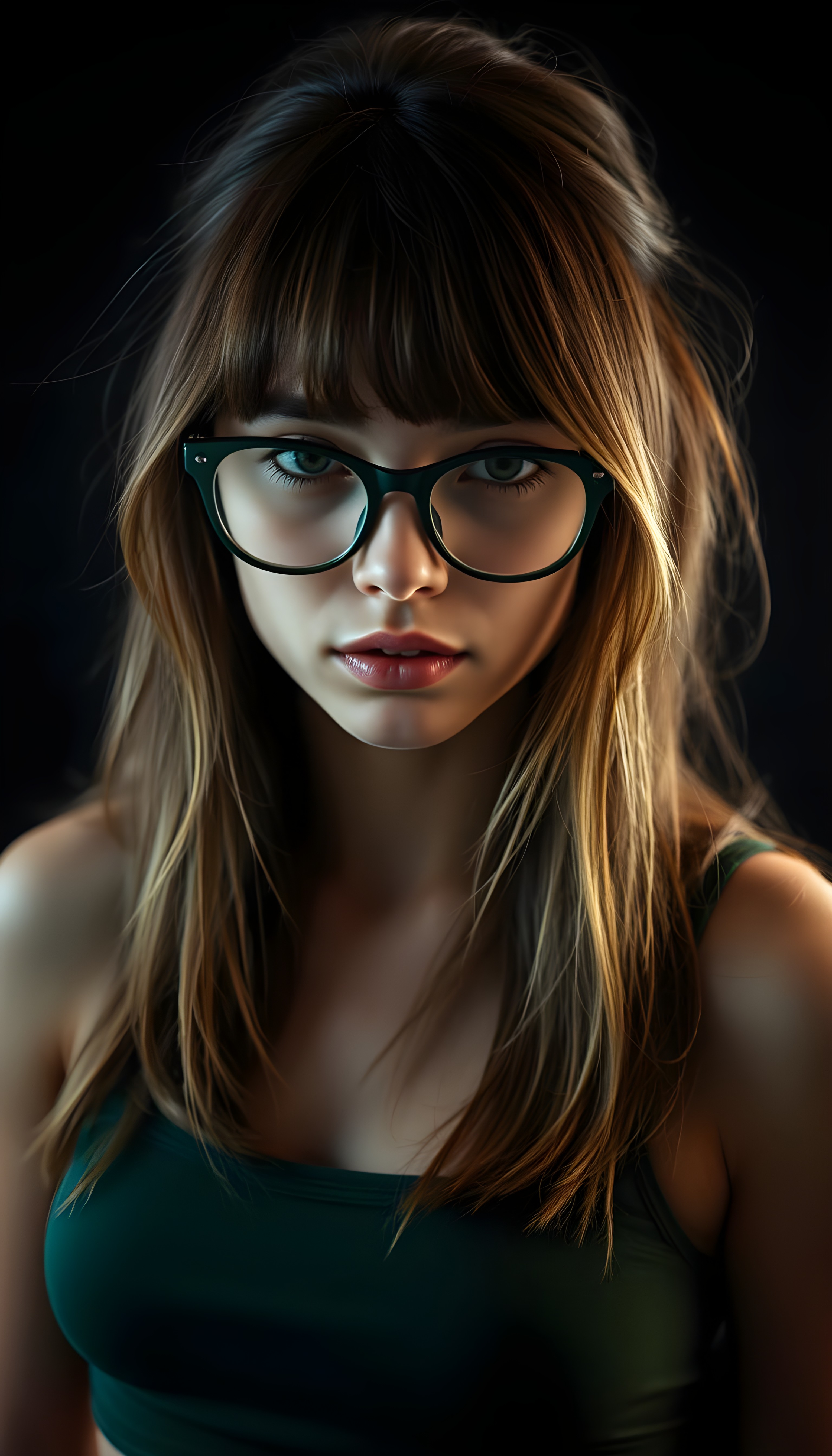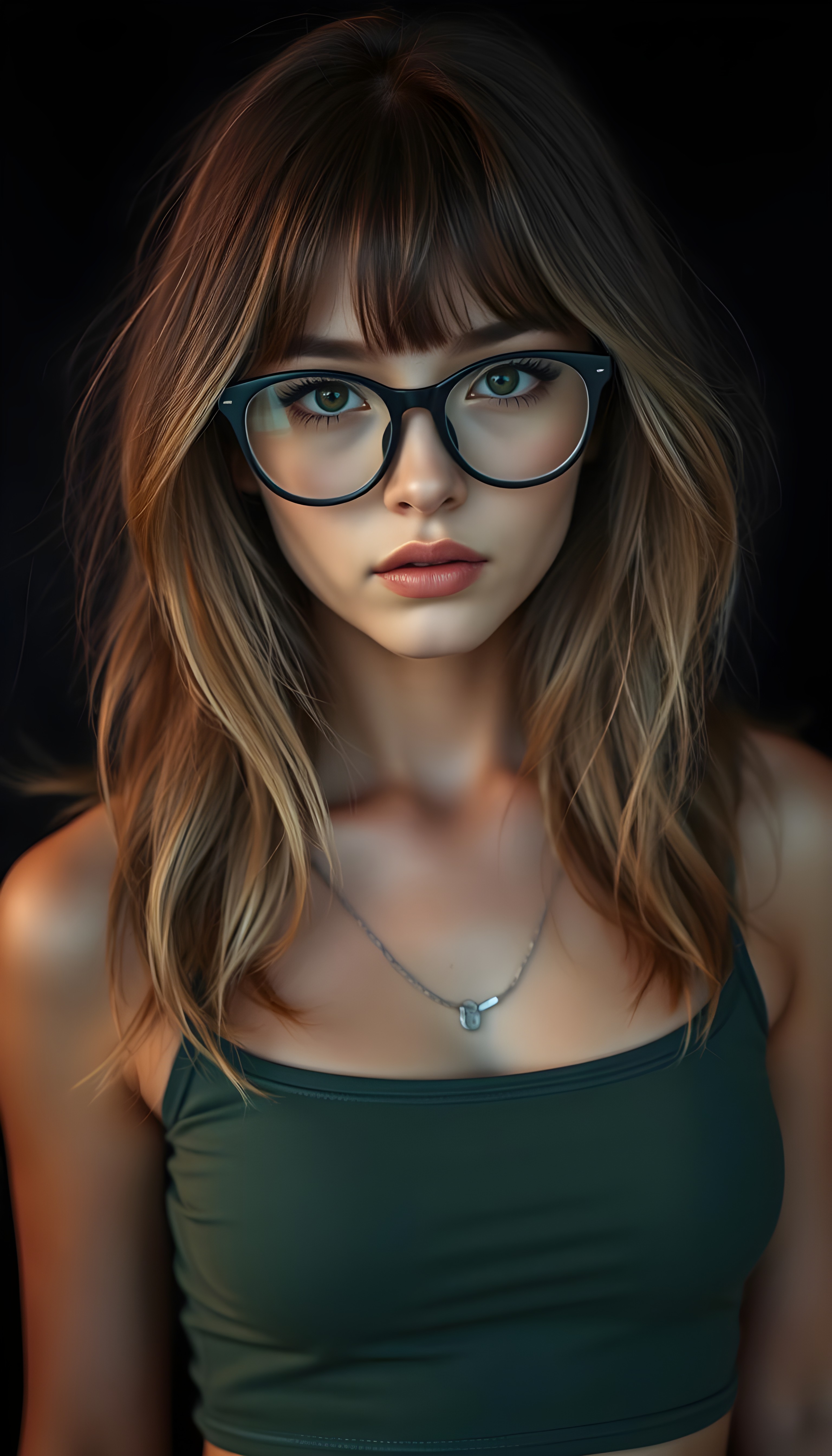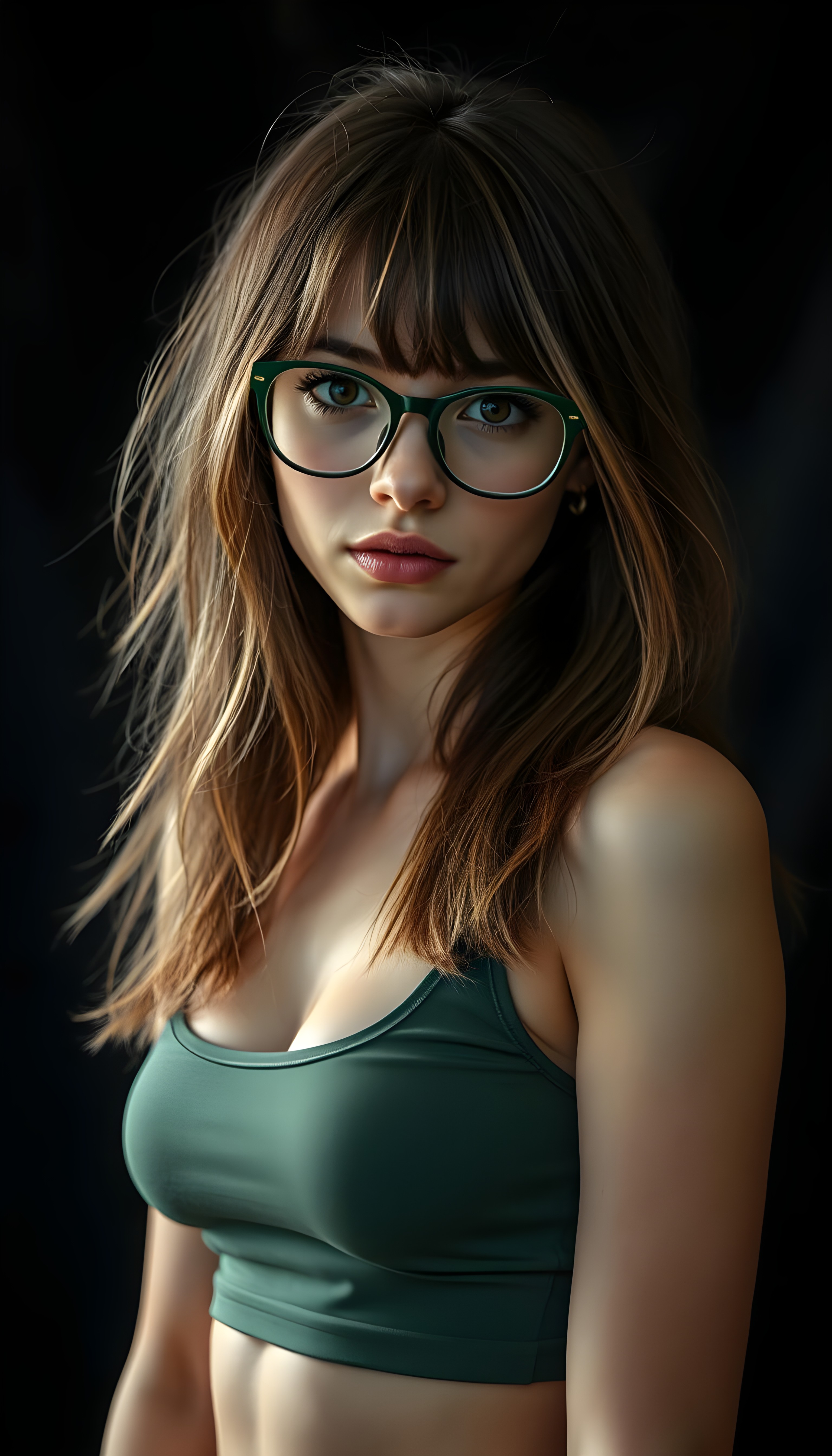 a cute nerd girl with long, brown shoulder-length jet soft flowing hair and blond highlights, wearing a large, dark green prescription glasses. She has bangs that are parted to the side. Her eyes are dark brown. She wears a short form-fitting cropped green tank top that support and emphasizes her perfect body, low neck, ((dark background)) ((gorgeous)) ((stunning)) ((perfect portrait))