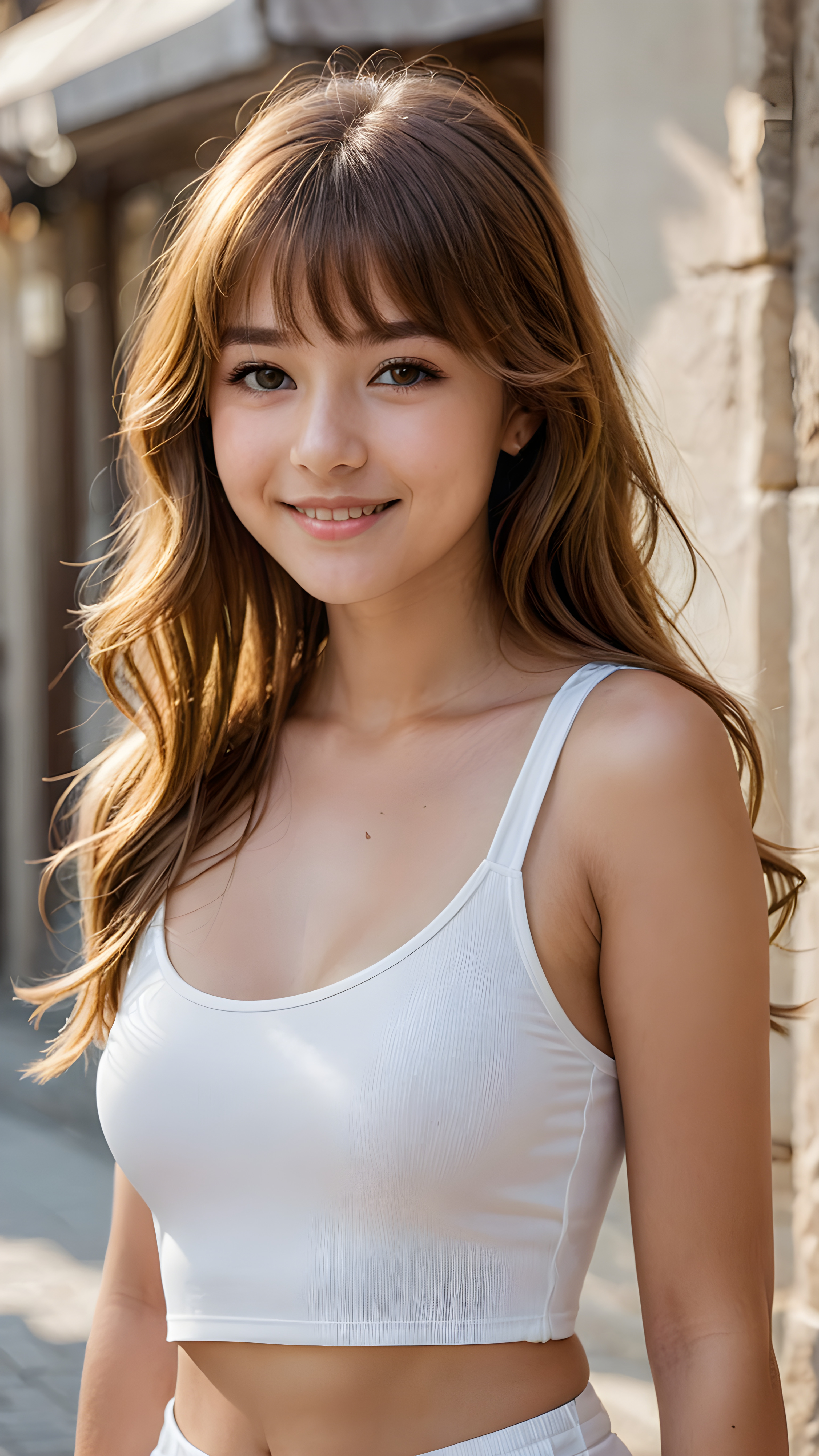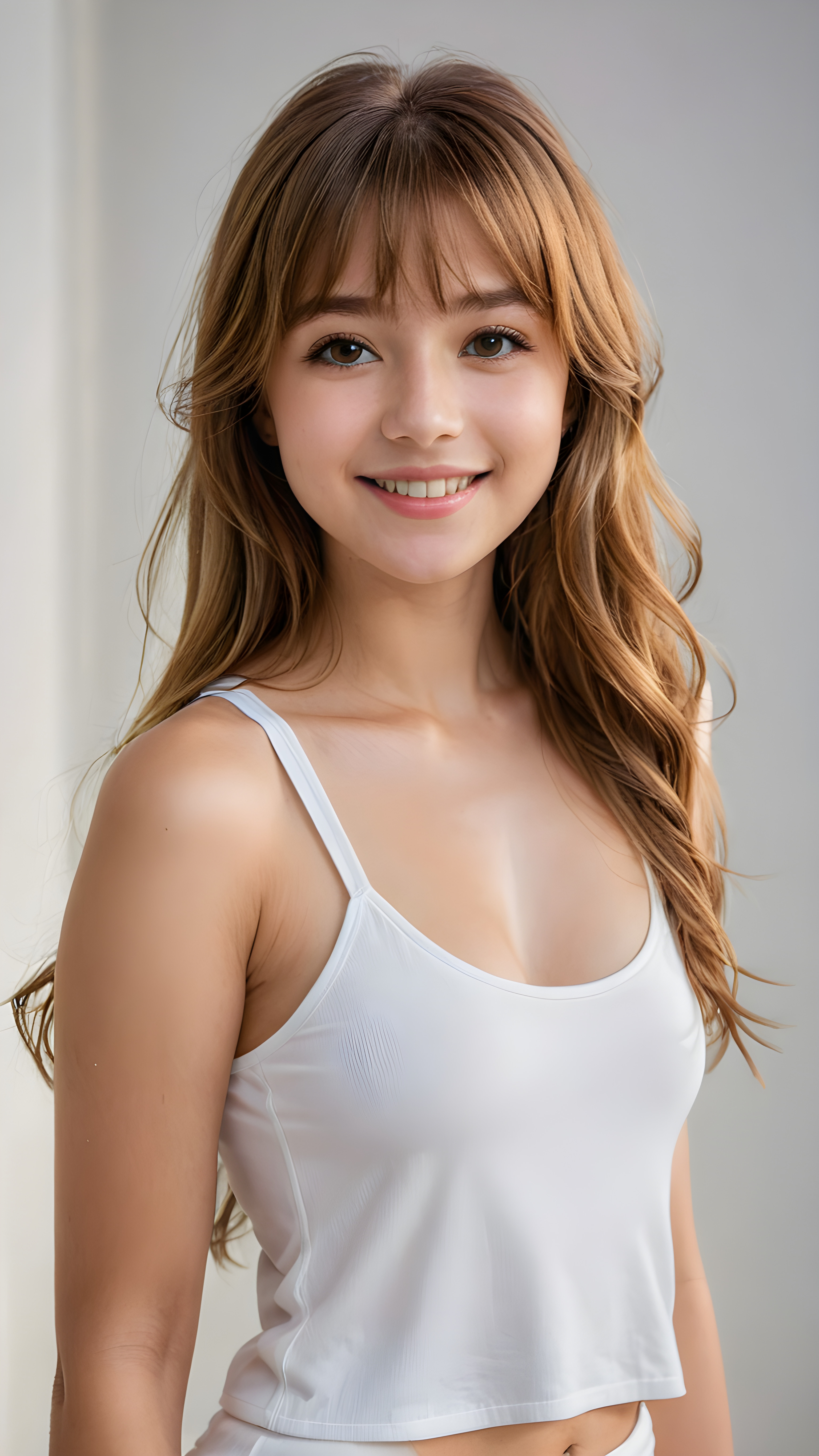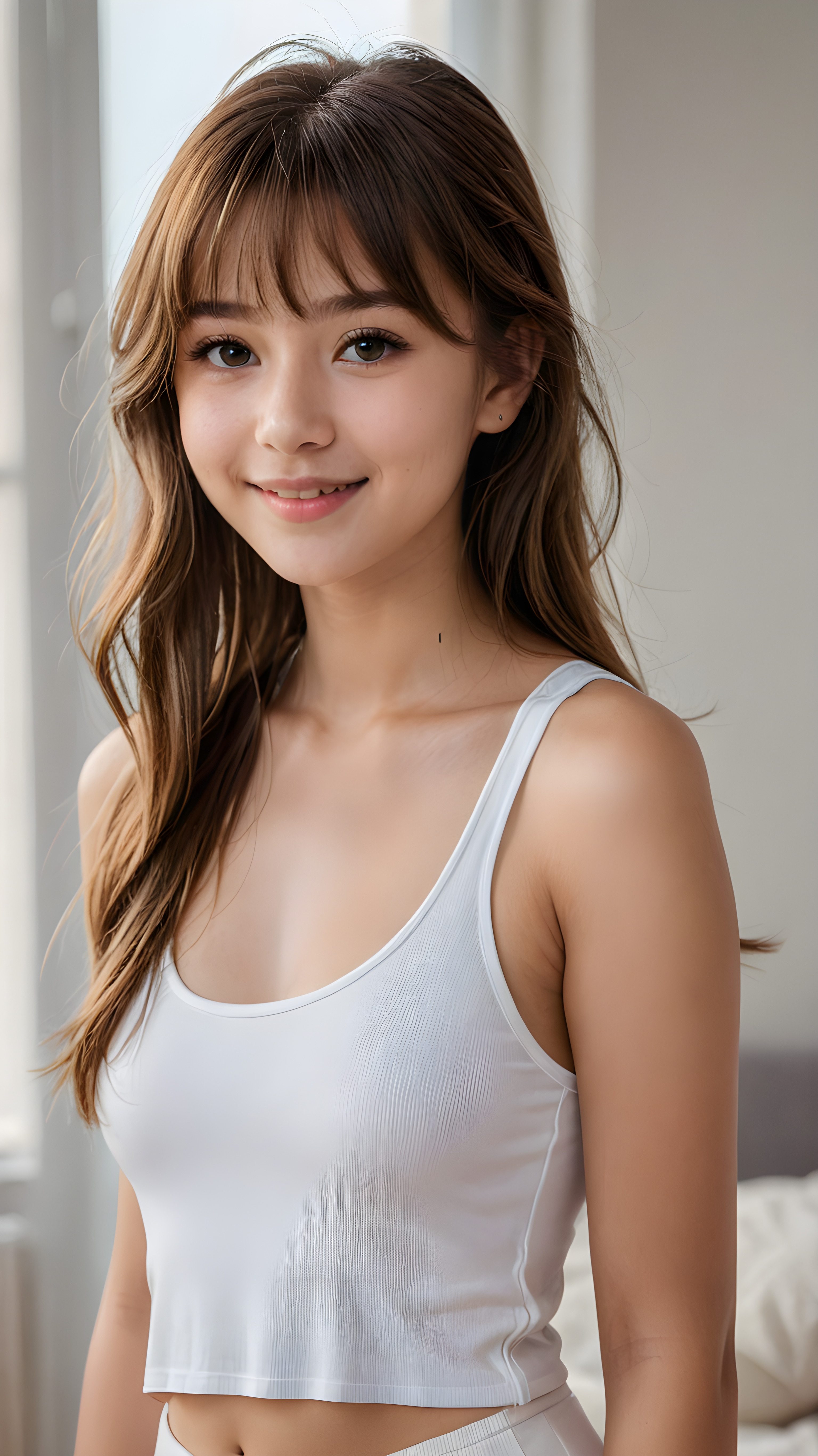 a young beautiful cute young fit (+ daemonic) teen girl, 13 years old, warm smile, dimmed light falls on her, she has long (((straight long hair, bangs cut))) (her hair falls on her shoulders), ((angelic round face)), in a dreamy, perfect shadows, she wears (a ((white tight crop tank top))), perfect curved fit body, she looks seductively at the viewer and smiles slightly, upper body, flawless skin, light background, ((side profile)) ((ultra realistic photo)) ((stunning)) ((gorgeous)) ((4k))