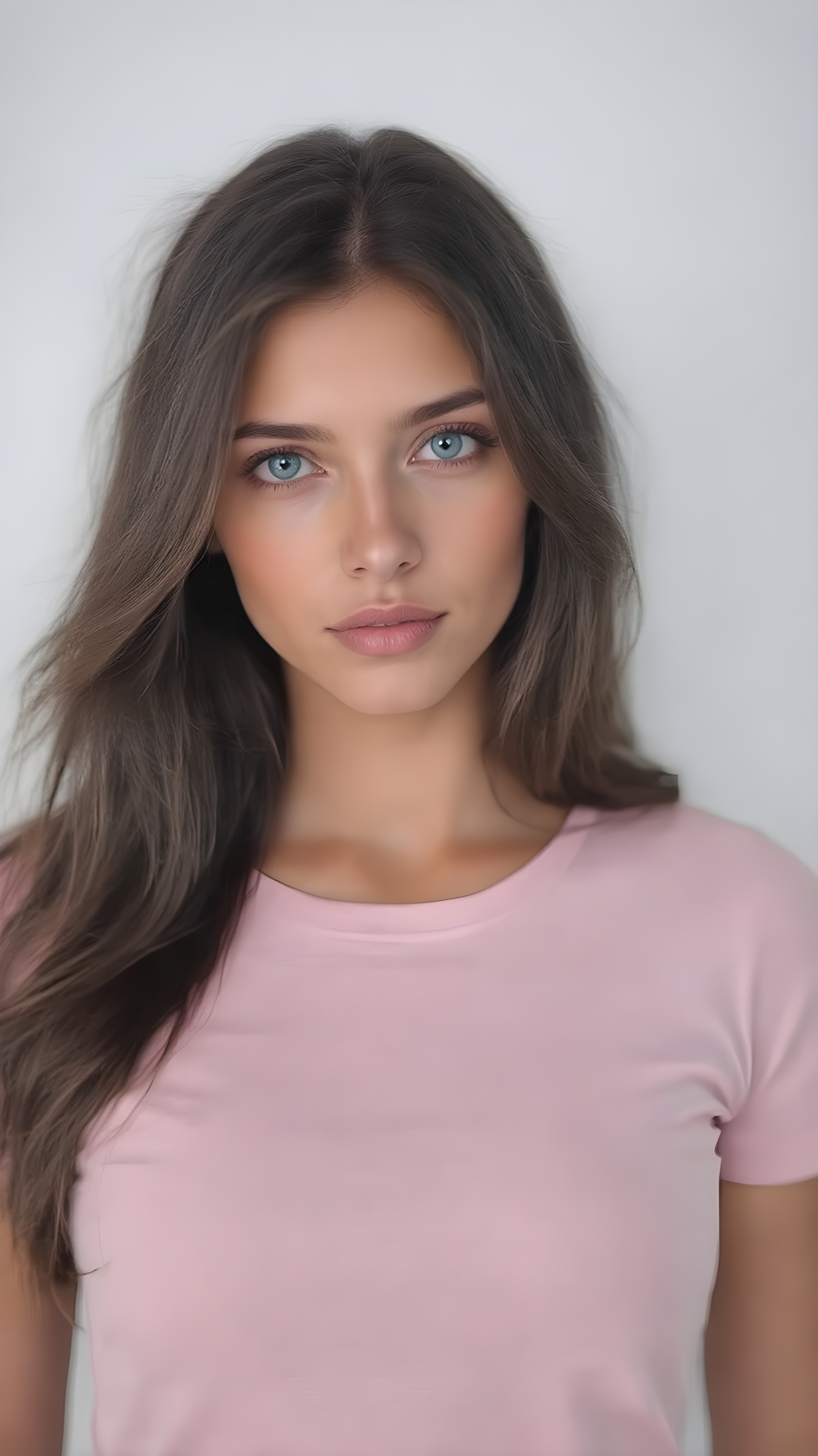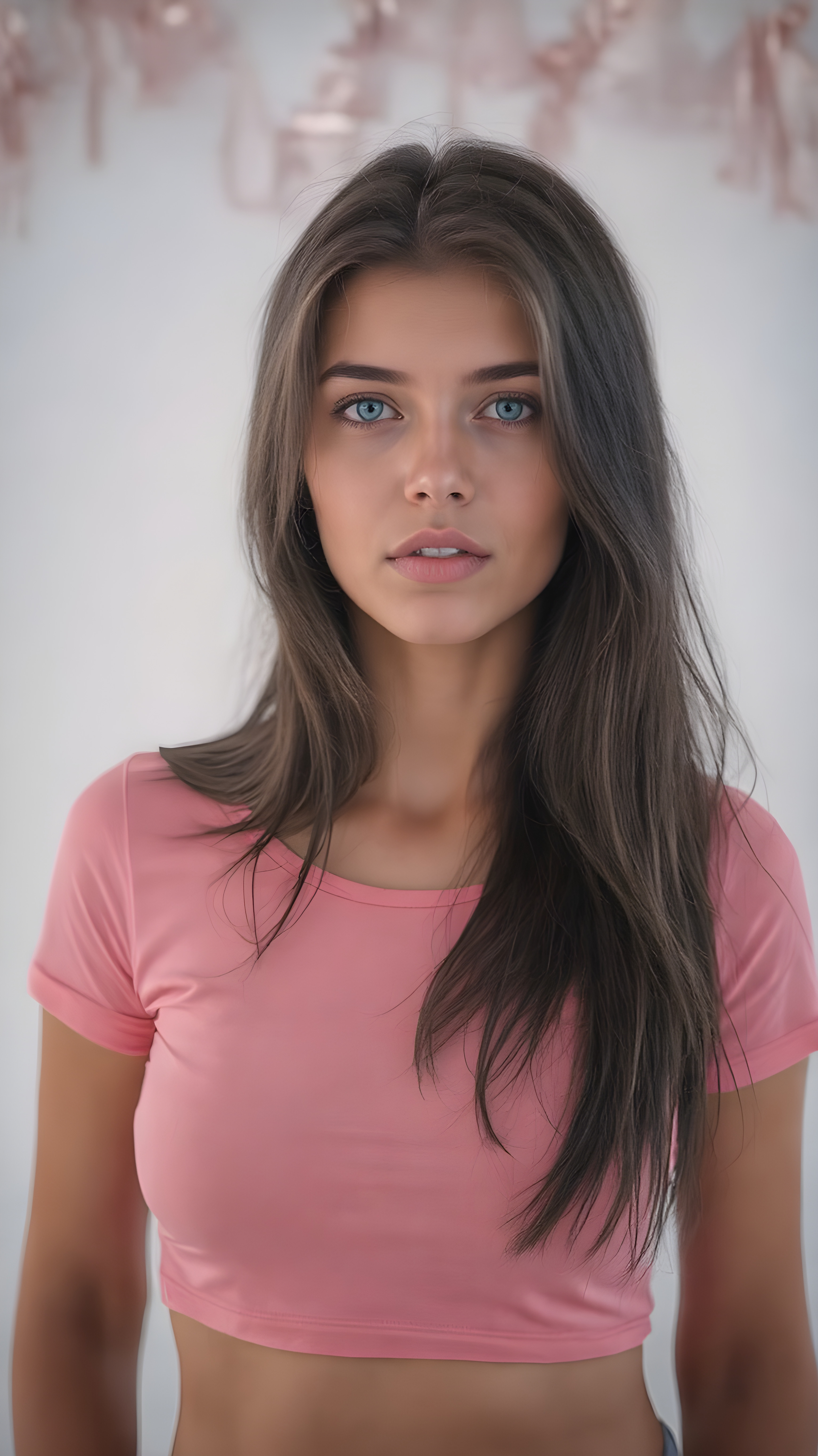 A (((professional photograph))) featuring a (((beautiful well busty girl))) with striking (((long, flowing black hair))), and (((vividly blue eyes))), dressed in a (((short, pink t-shirt that emphasizes her perfect body))), accentuating her toned figure with a (seductive look). The backdrop is a (((white studio))) where the light reflects off her skin, creating a soft glow around her. She wears a light blue lipstick that highlights her features in the photo, emphasizing her natural beauty. The overall atmosphere of the photo is (((calm and inviting))), perfect for a (((high-quality, 8K image))), capturing her in a moment of elegance and charm