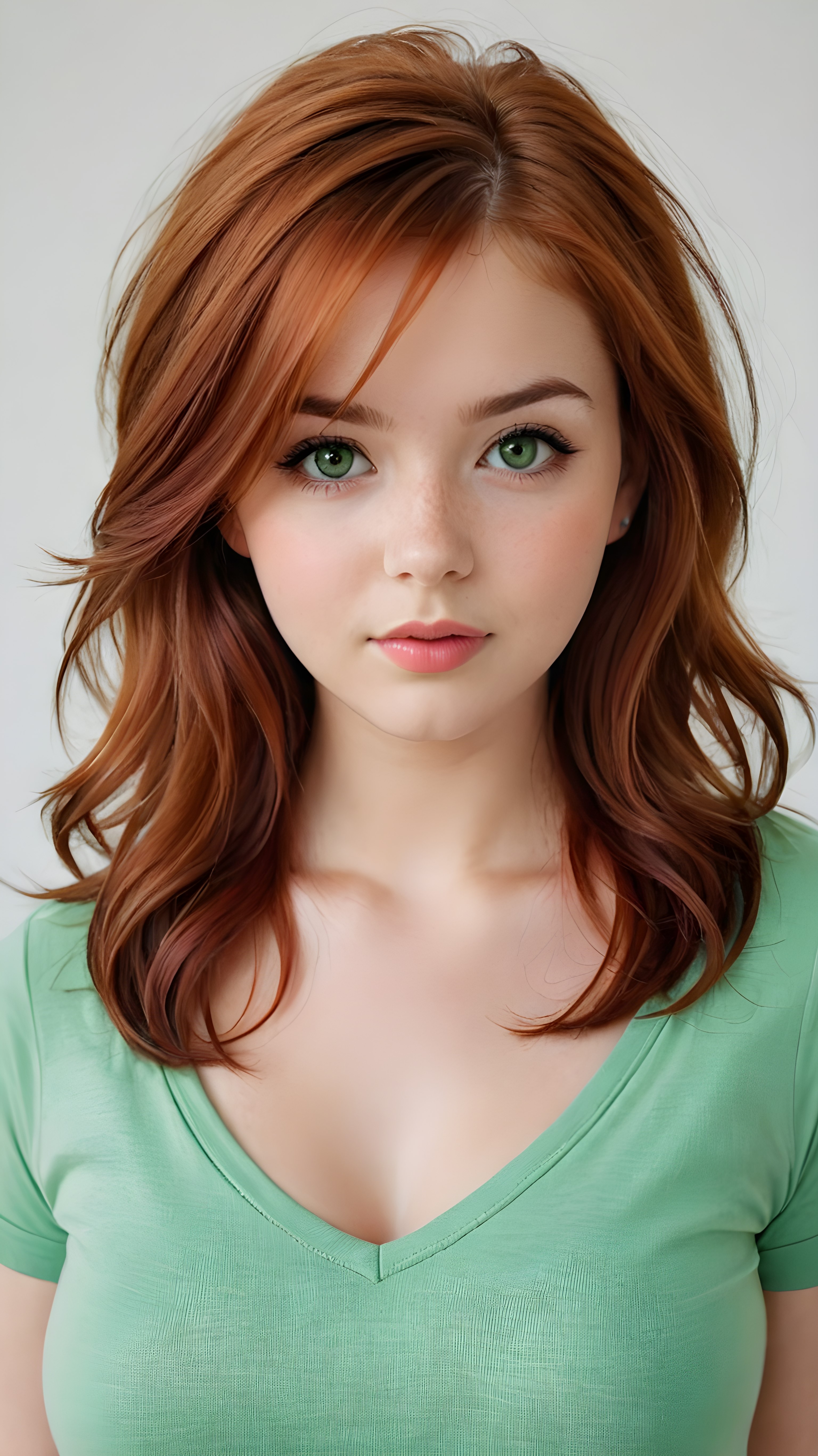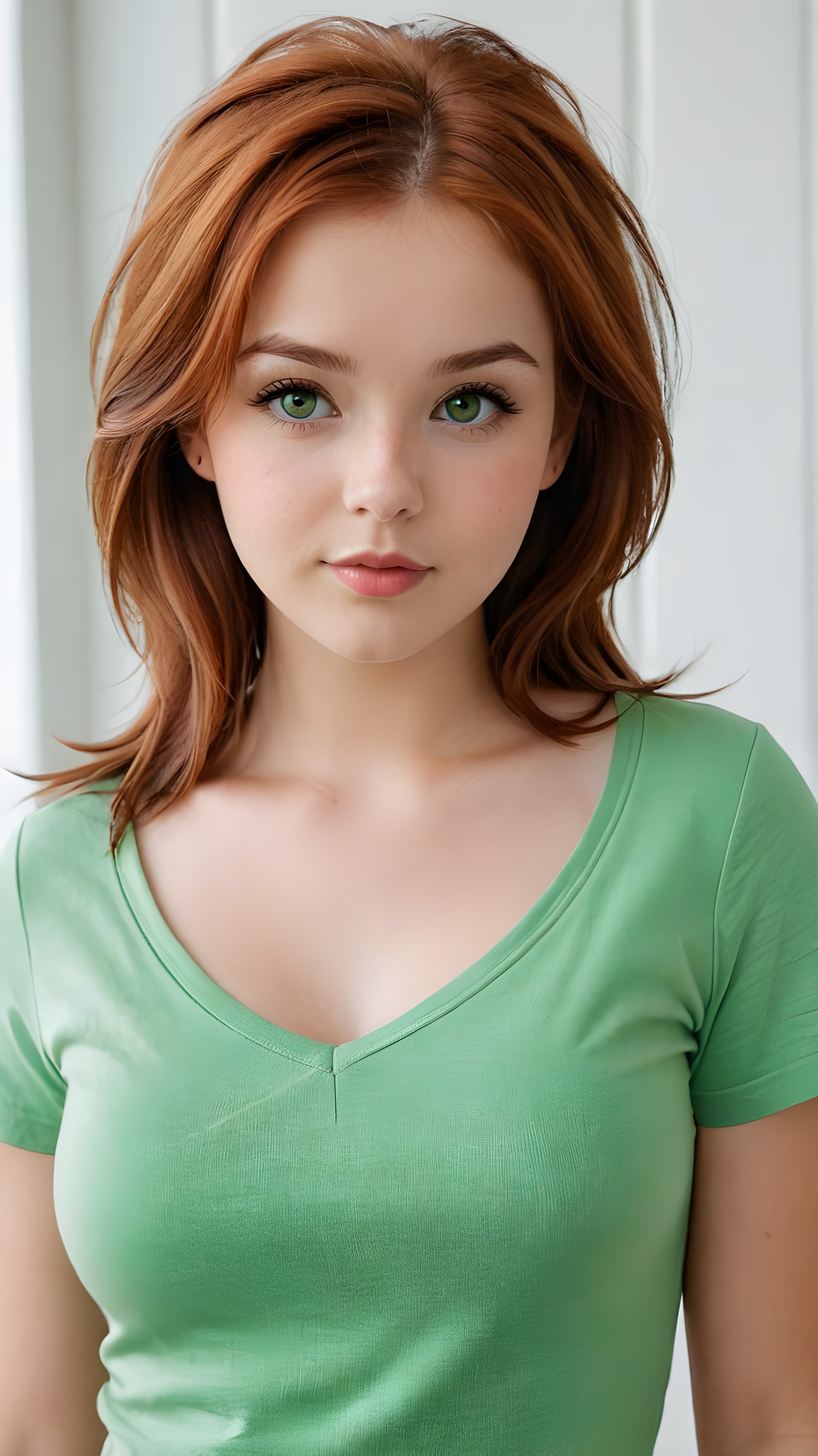 a realistic photo from a cute stunning young red haired teen girl, age 16, round face, and a sexy, womanly curves, she wears a short cropped t-shirt, deep v-neck, open front, soft jet straight hair, light green eyes, full lips