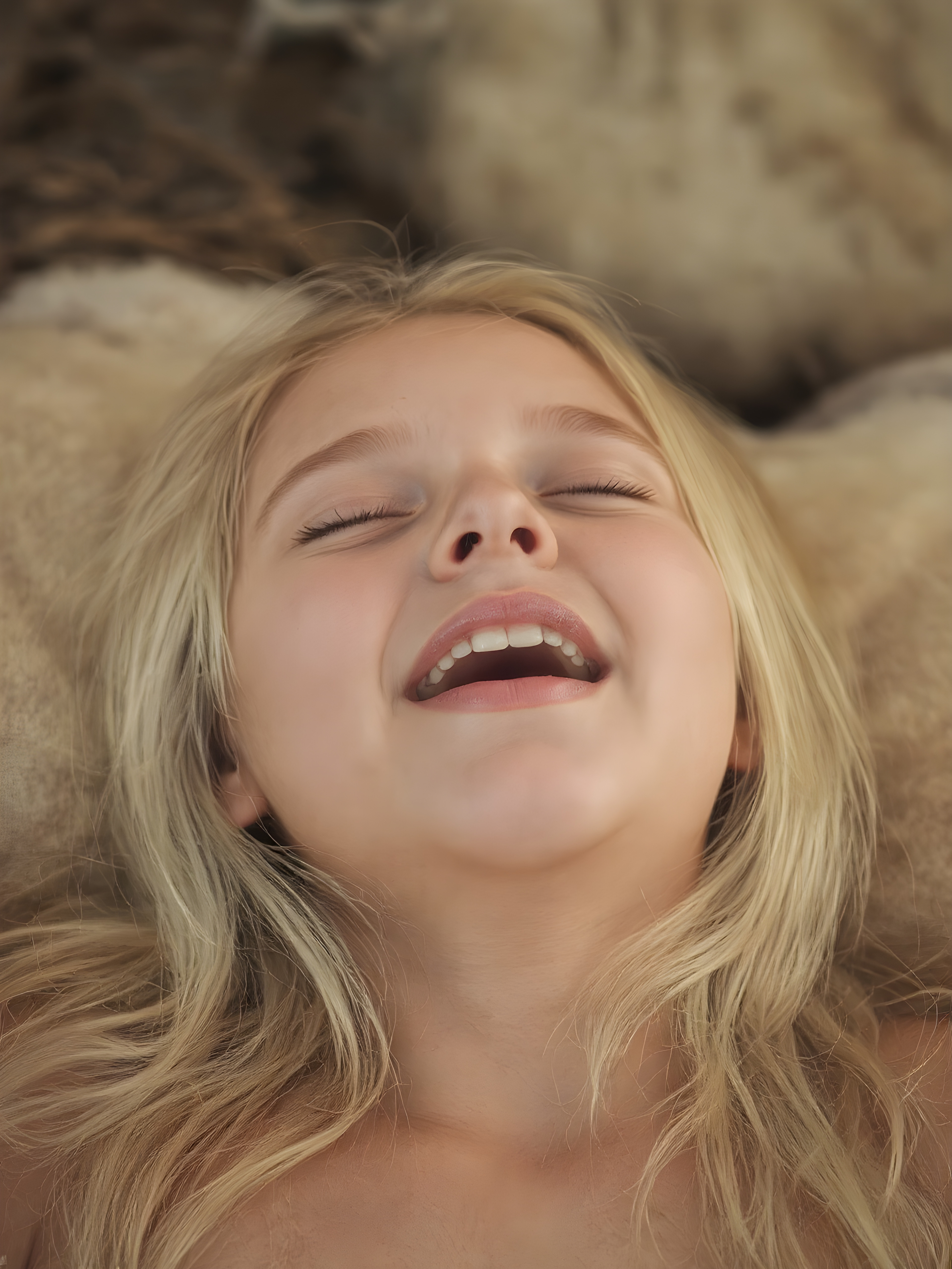 A vividly captured (((full body shot))) from a young teen girl with a warm, inviting smile, lying on the back, head tilted back, comfortably settled in a soft, inviting position. She has straight soft long blond and white hair, her (((eyes are closed))) ((wide open mouth, white teeth)) and her full lips are slightly parted, as if captured in a ((seductive moment)). The scene is set against a backdrop of a (softly lit) environment that suggests a natural, rustic setting, enhancing the warm and inviting mood of the photo.