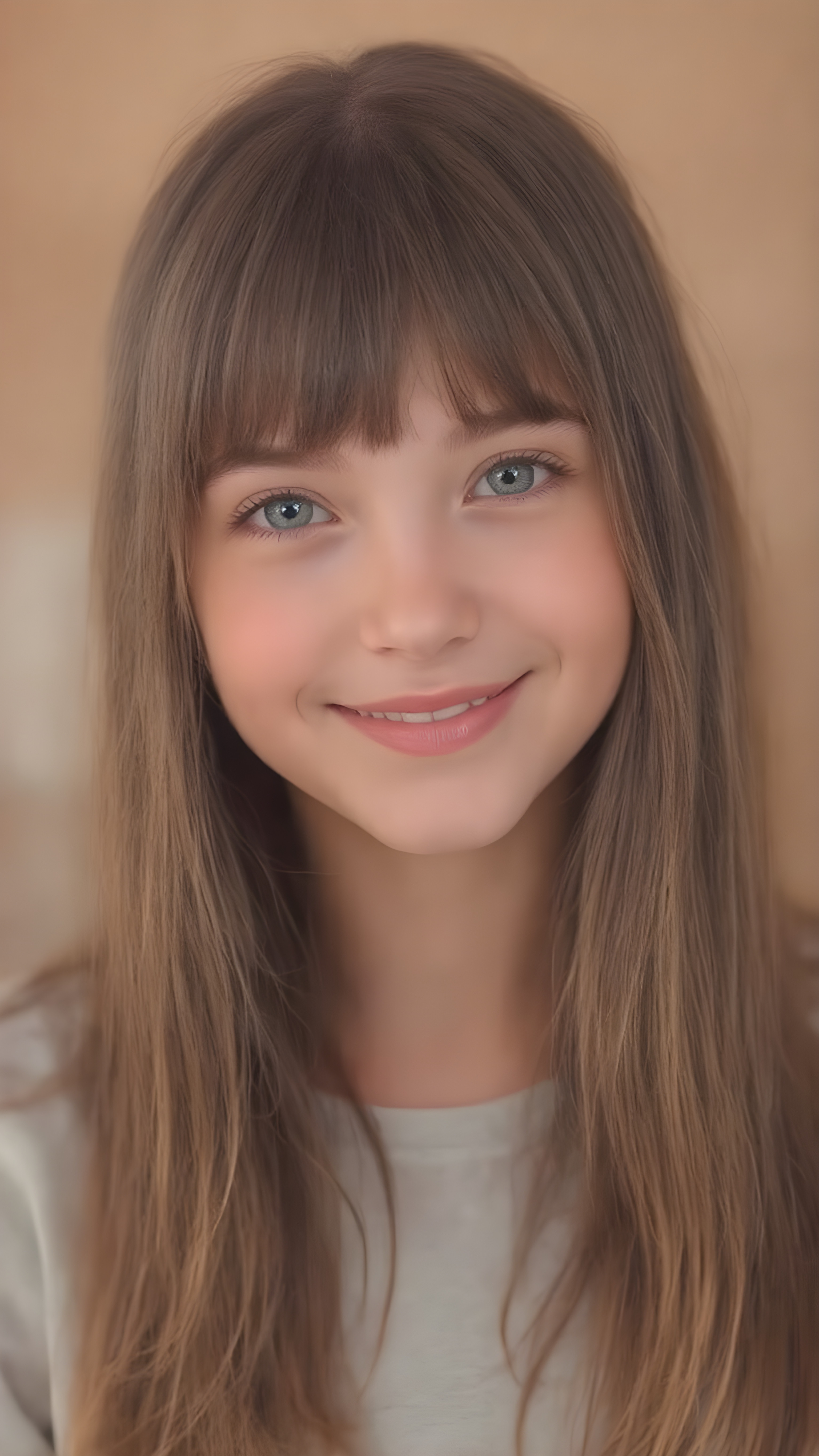 portrait, full body, warm tones, cute girl, stunning, gorgeous, she smile very happy and has long, straight brown soft hair, bangs, detailed realistic round face
