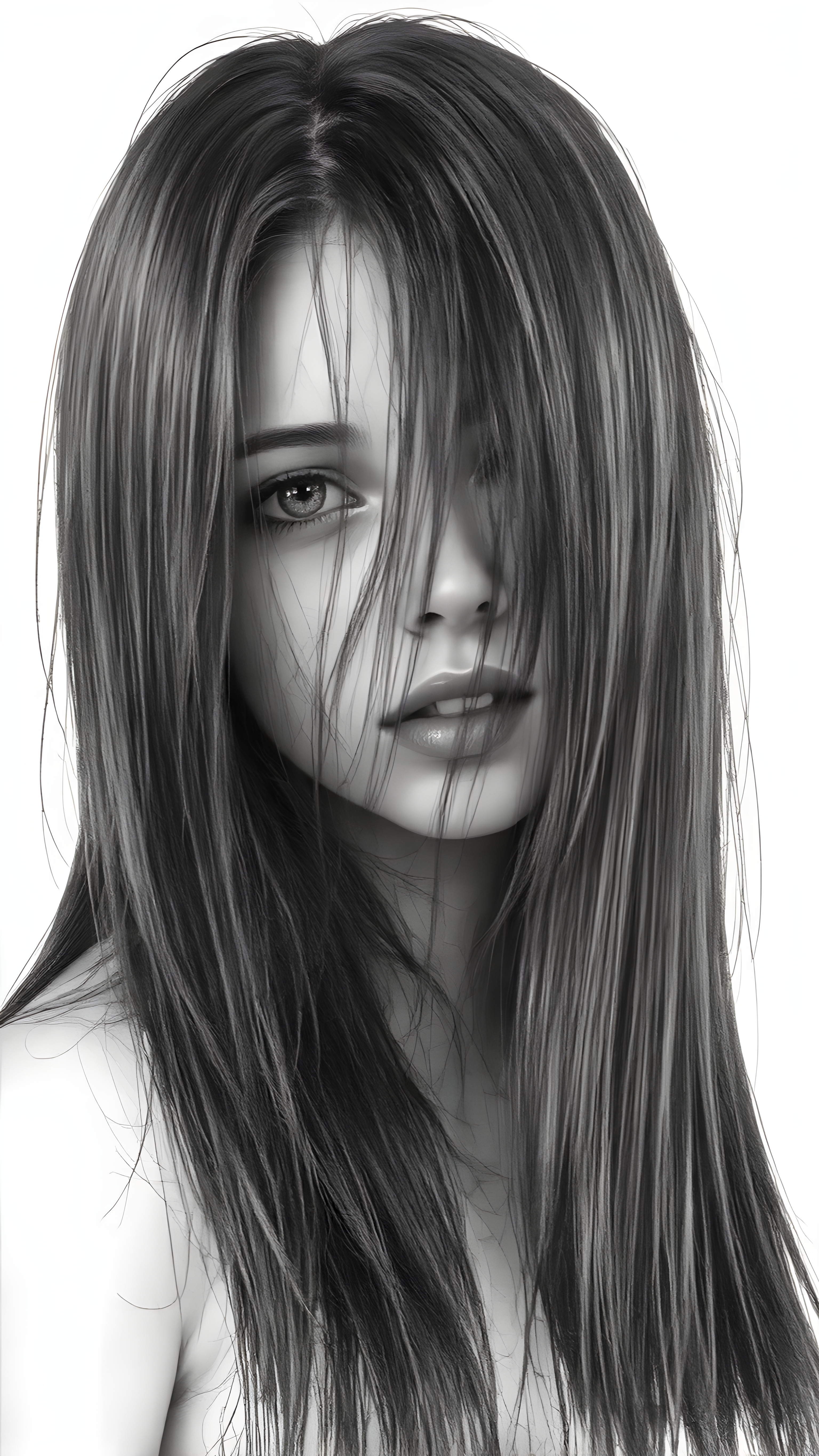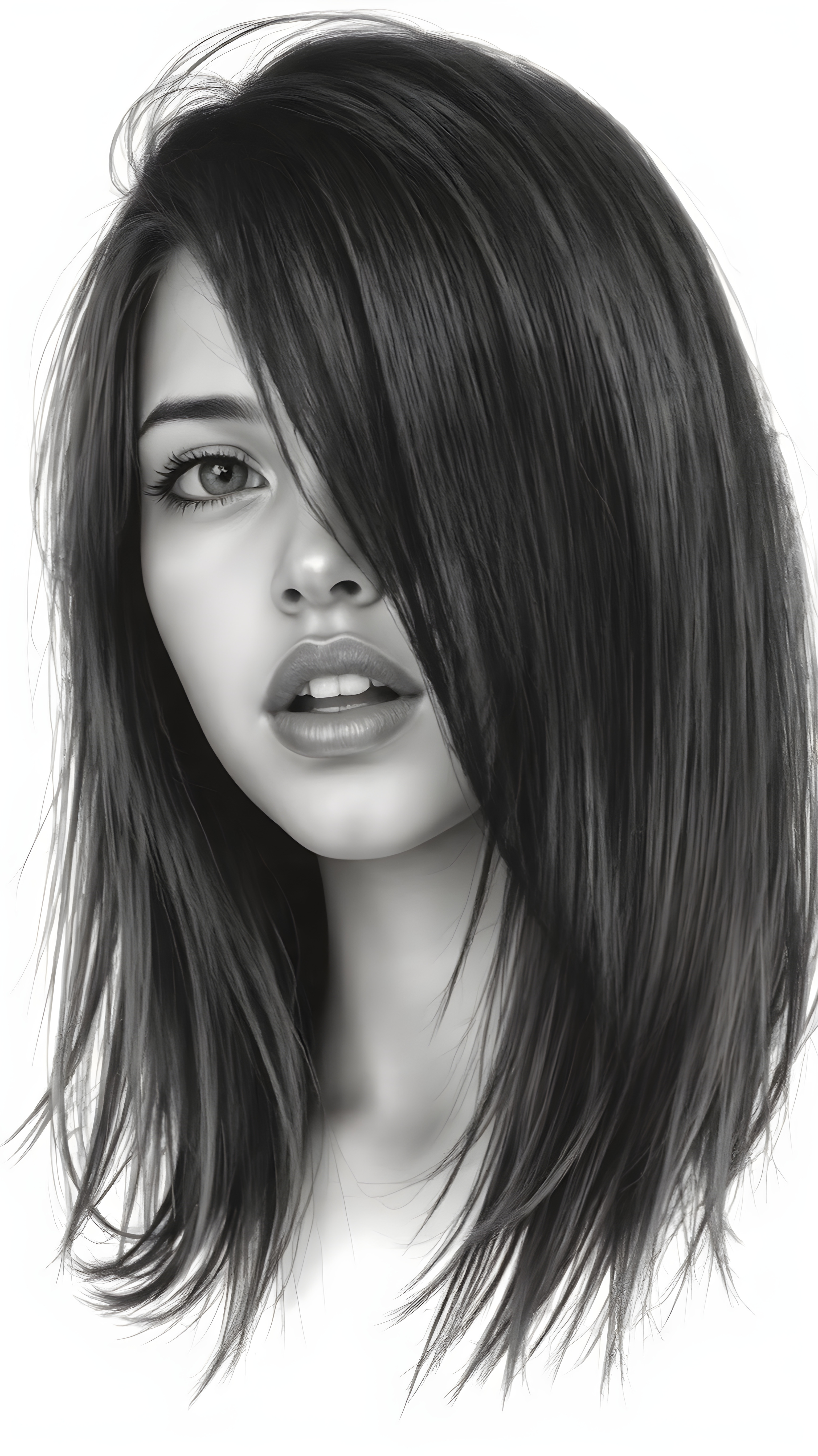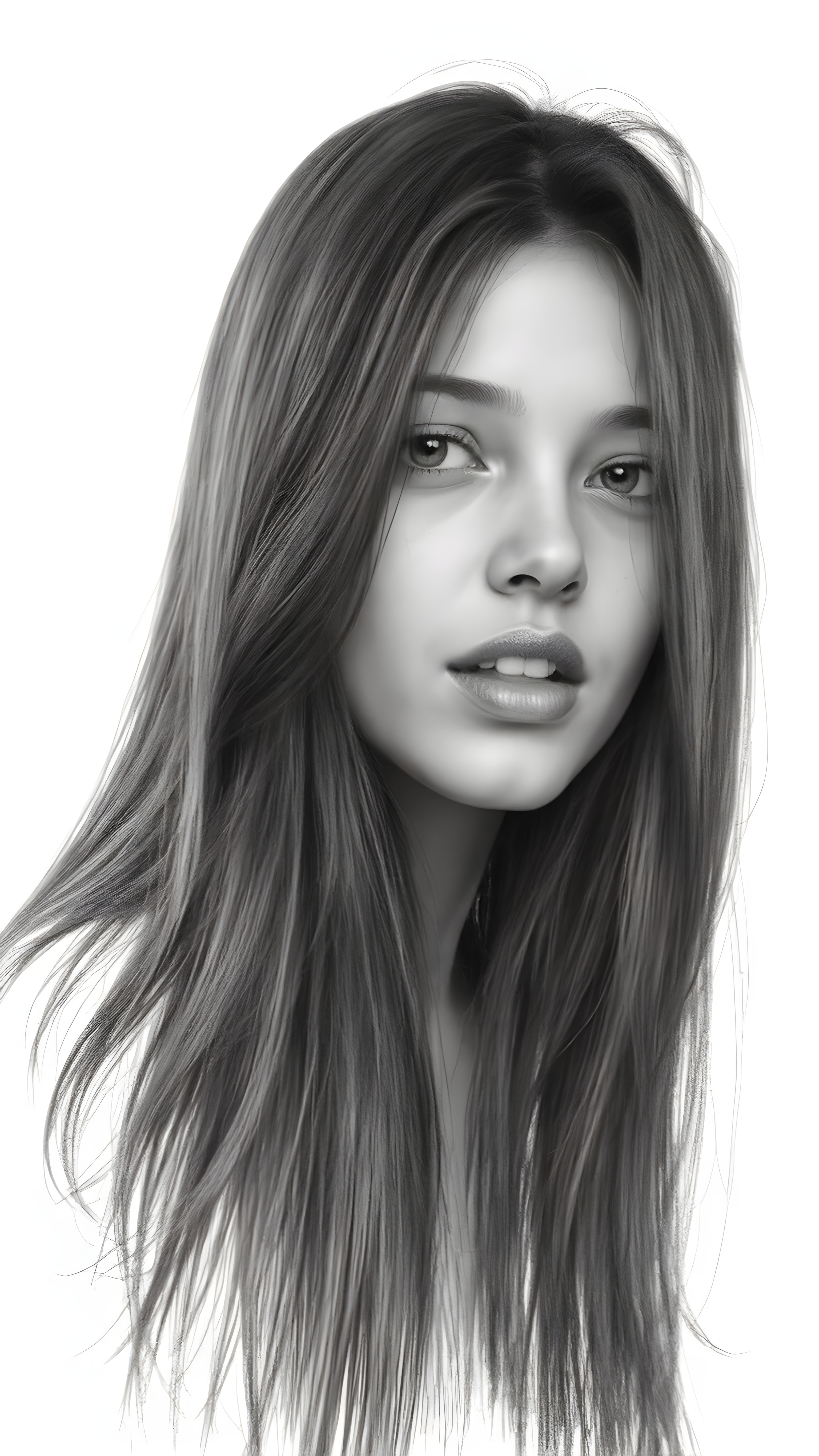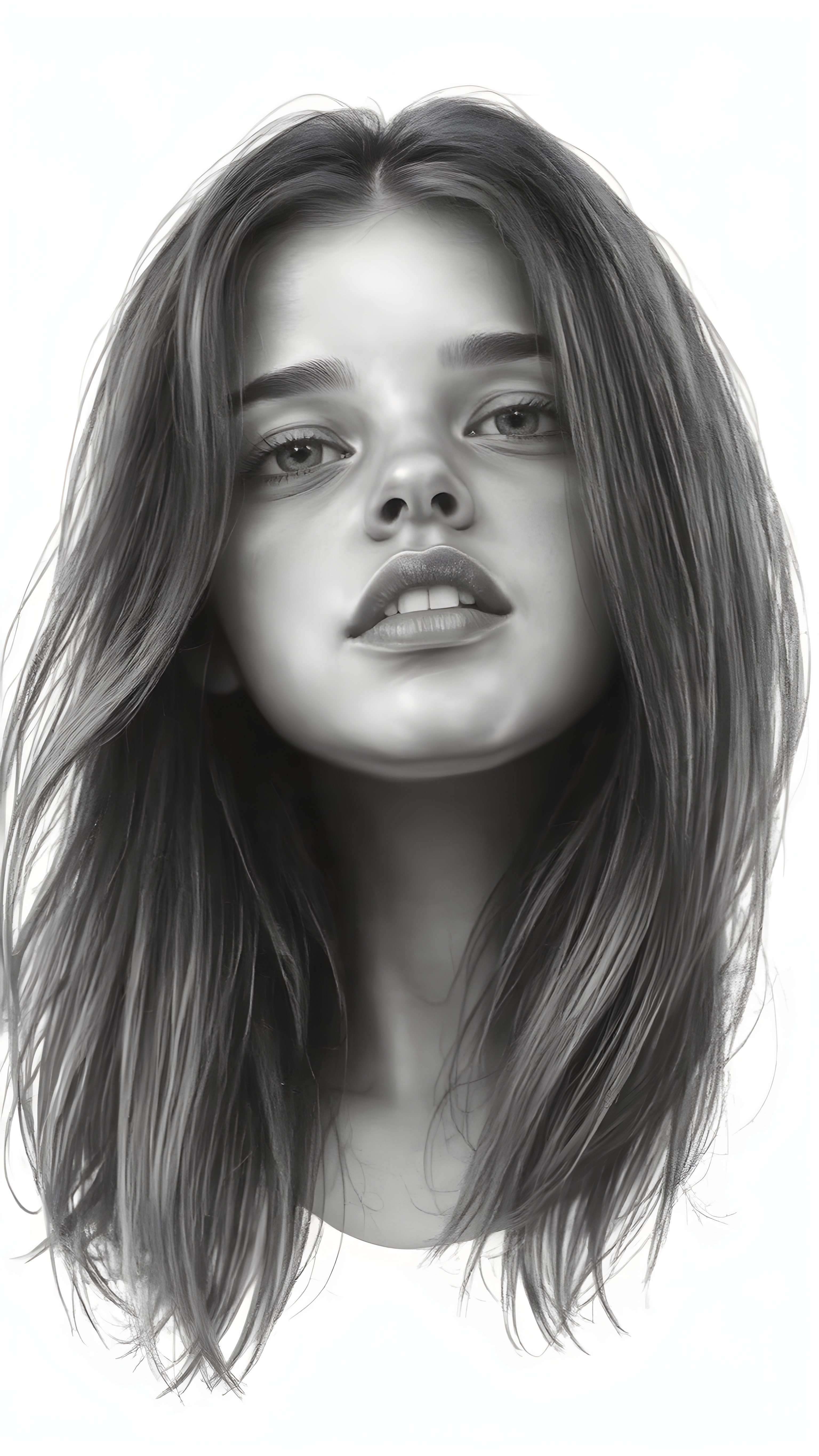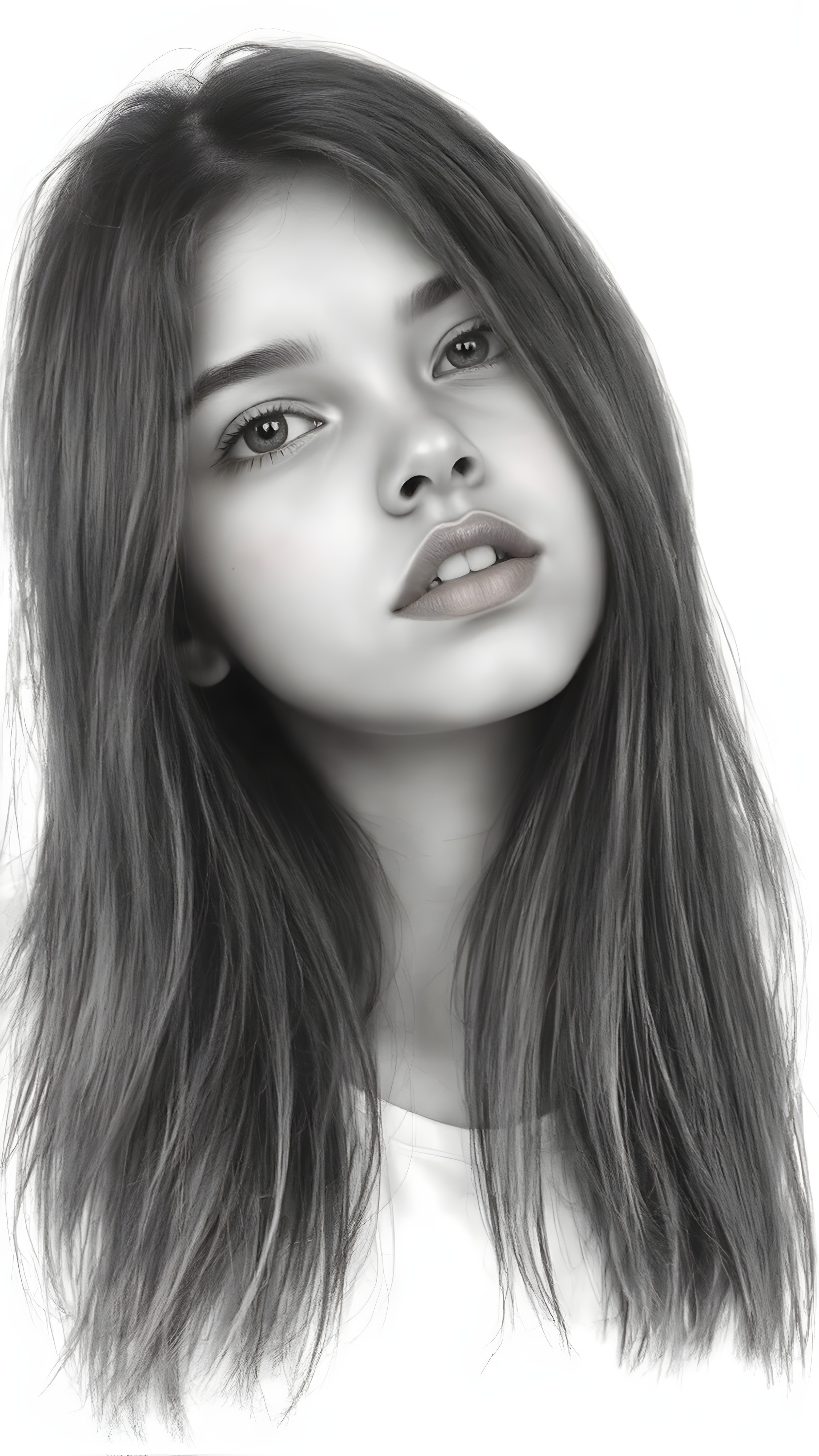 a (((very detailed and realistic (((black and white charcoal drawing))) ((upper body)) portrait))), featuring a (((cute teen girl))) with ((extremely long, straight, thick, untucked (natural dark) hair)), realistic face, full kissable lips, white backdrop, open mouth, white teeth