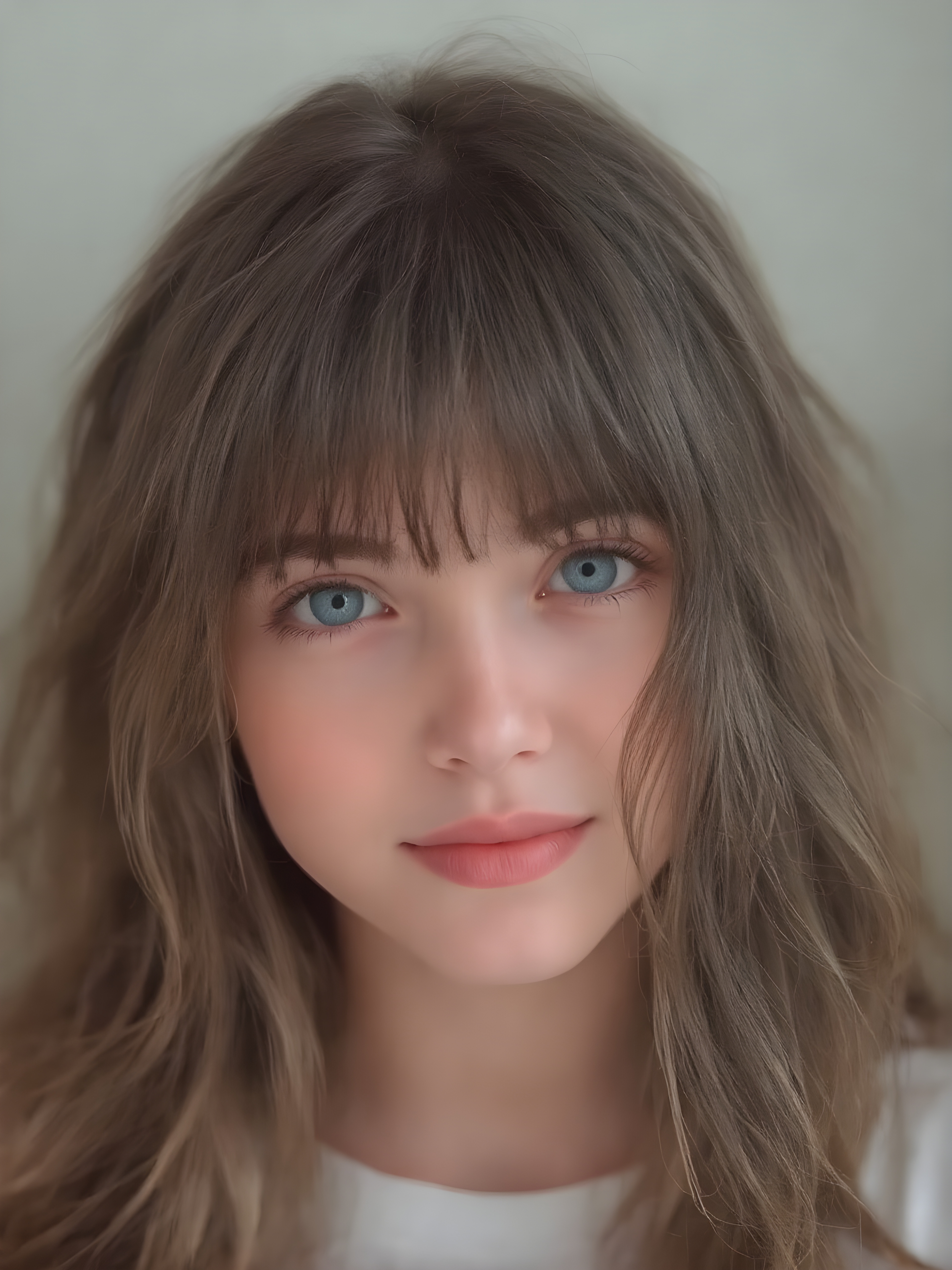 a (((super cute girl))) who exudes an air of warmth and cuteness, with her locks of (((black brown soft hair))), which cascades down in soft, gentle waves, framing her face perfectly in bangs cut; she has (((perfect deep blue eyes))), her lips are a soft shade of (light pink), and her skin is (extremely soft), her full plump lips are red, white teeth