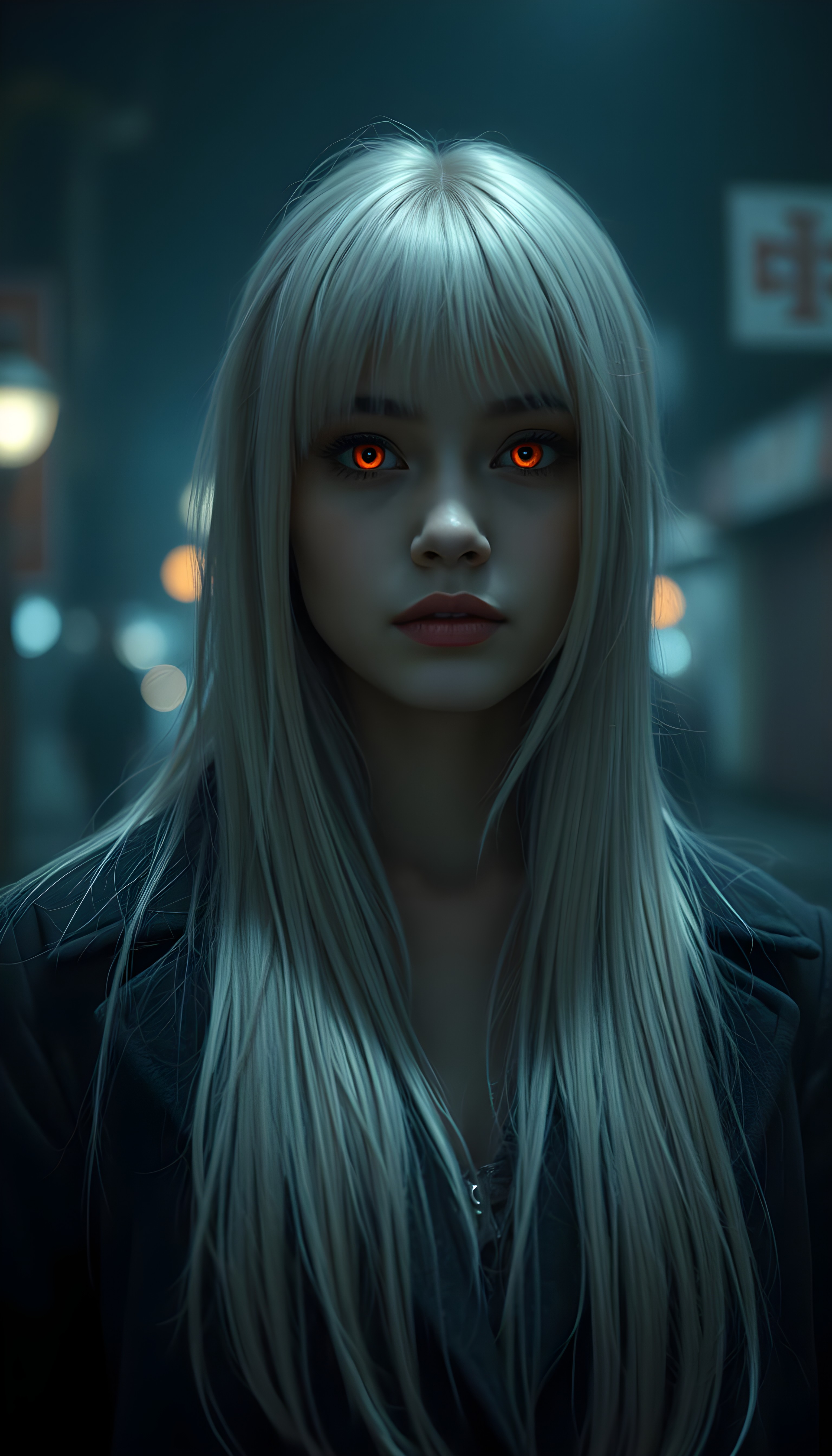 A girl stands in a nightly fogy street. A very detailed and emotional image. The girl has long, straight white hair. She is wearing a long, dark coat. View from the front. Her face is flawless. Her eyes glow red like a vampire.