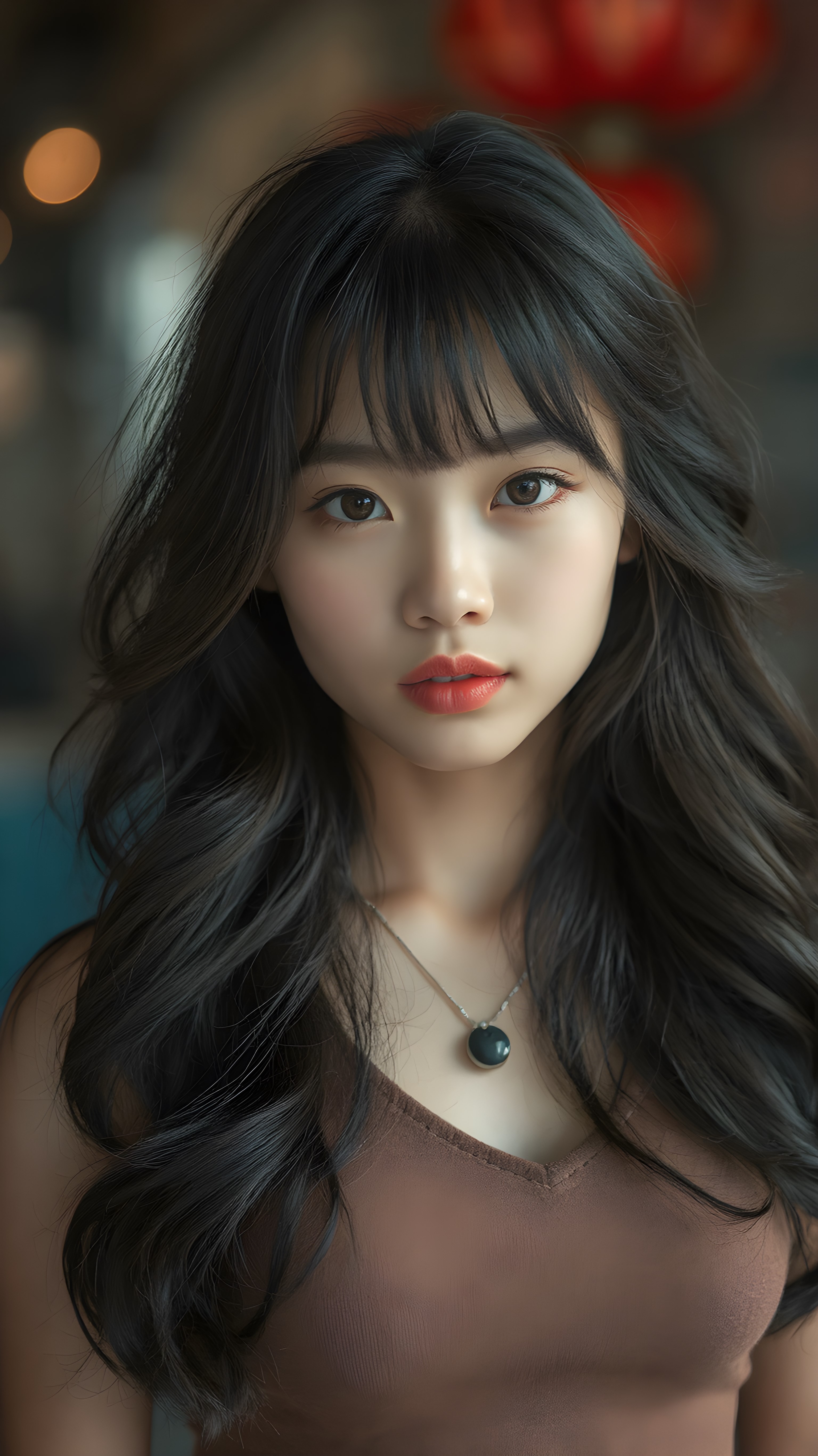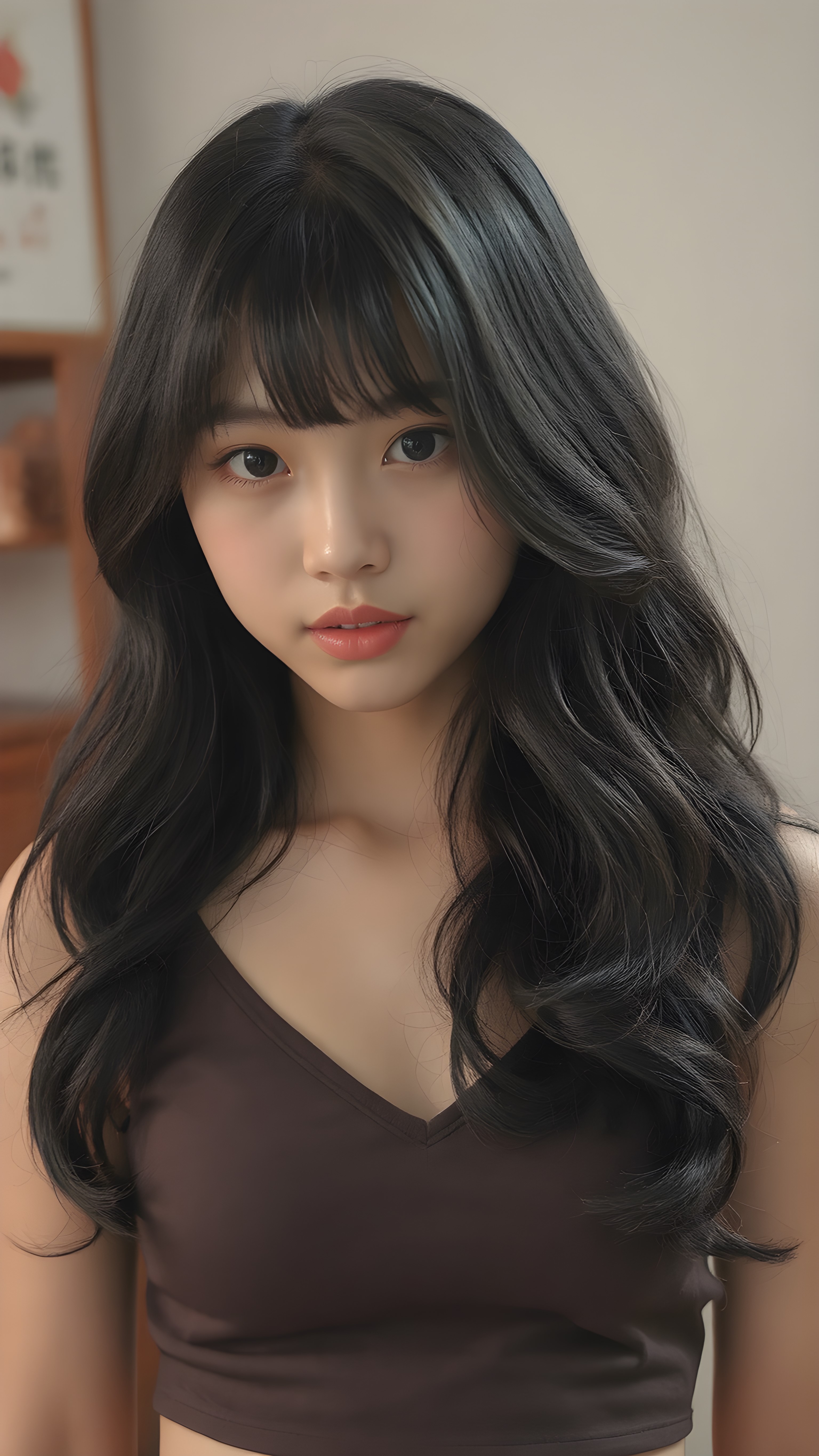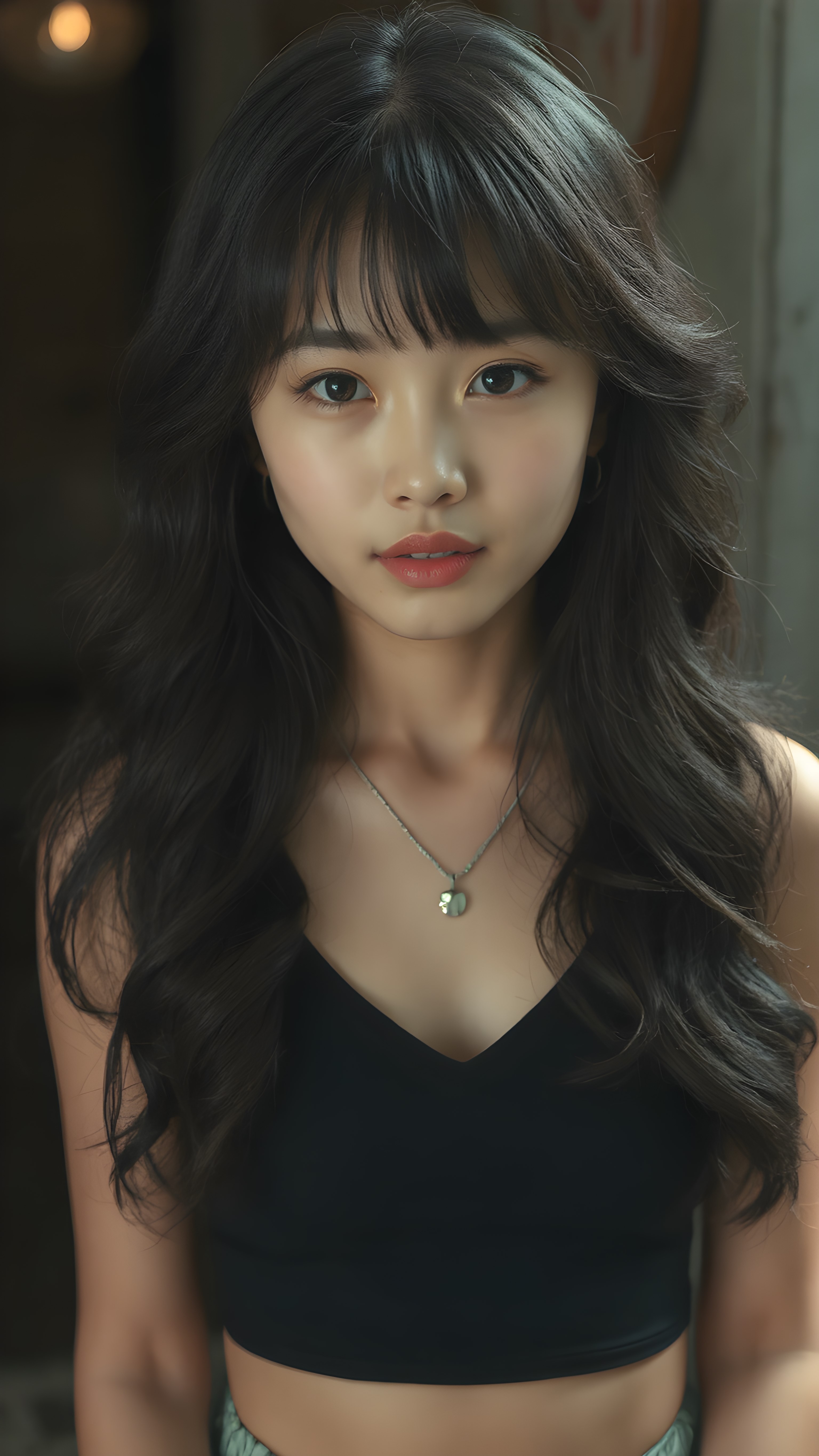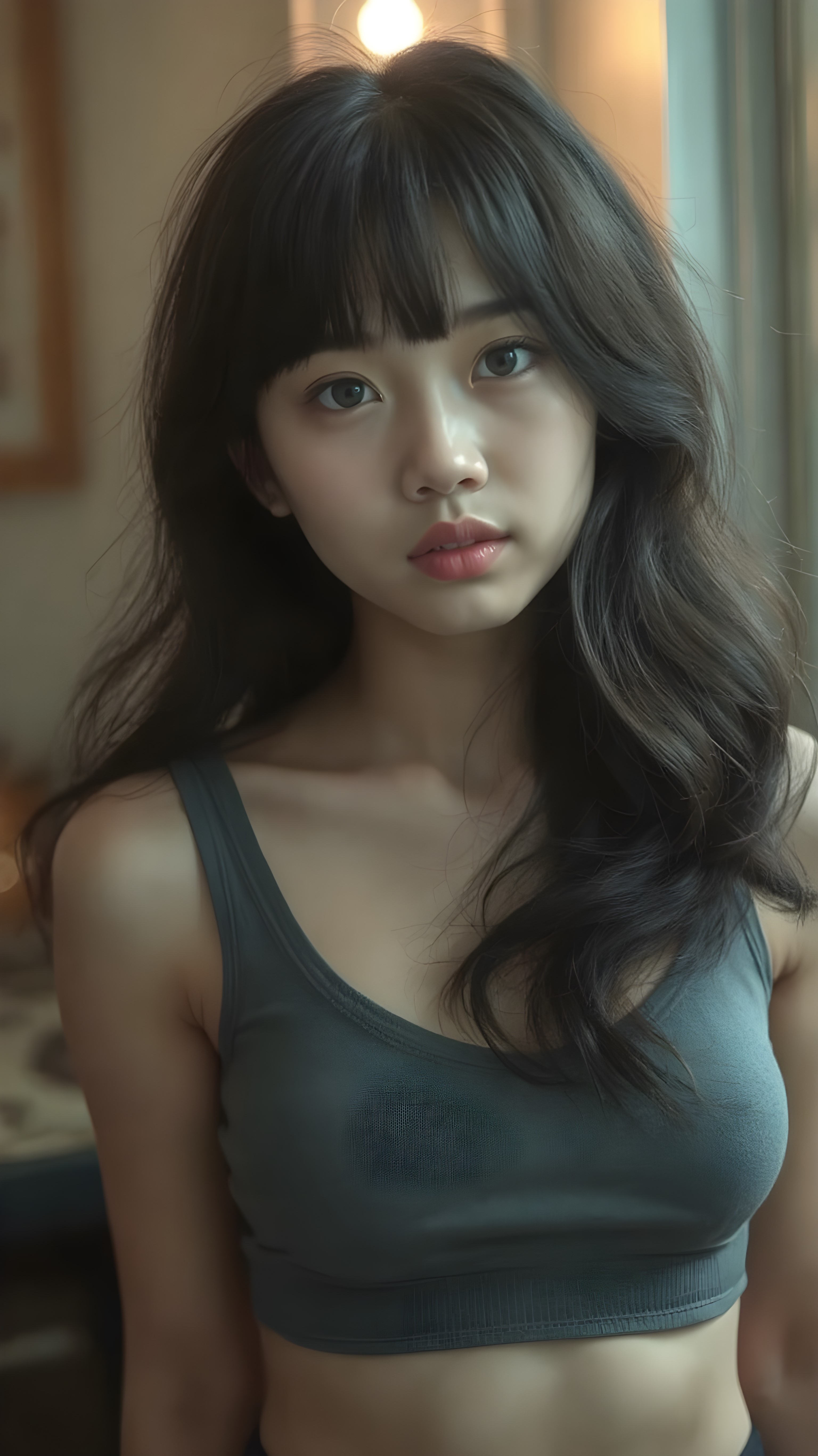 a beautifully captured (((super realistic full body photo))), featuring a (((young Chinese teen girl, black long wavy hair))) with hyper-realistic detailed skin textures and glossy lipstick-adorned lips, dressed in a (short tight cropped tank top with a low v-neck that perfectly complements her toned physique. Her striking ((bangs)) are artfully cut to frame her face perfectly, captured in a (professional studio photo shoot)