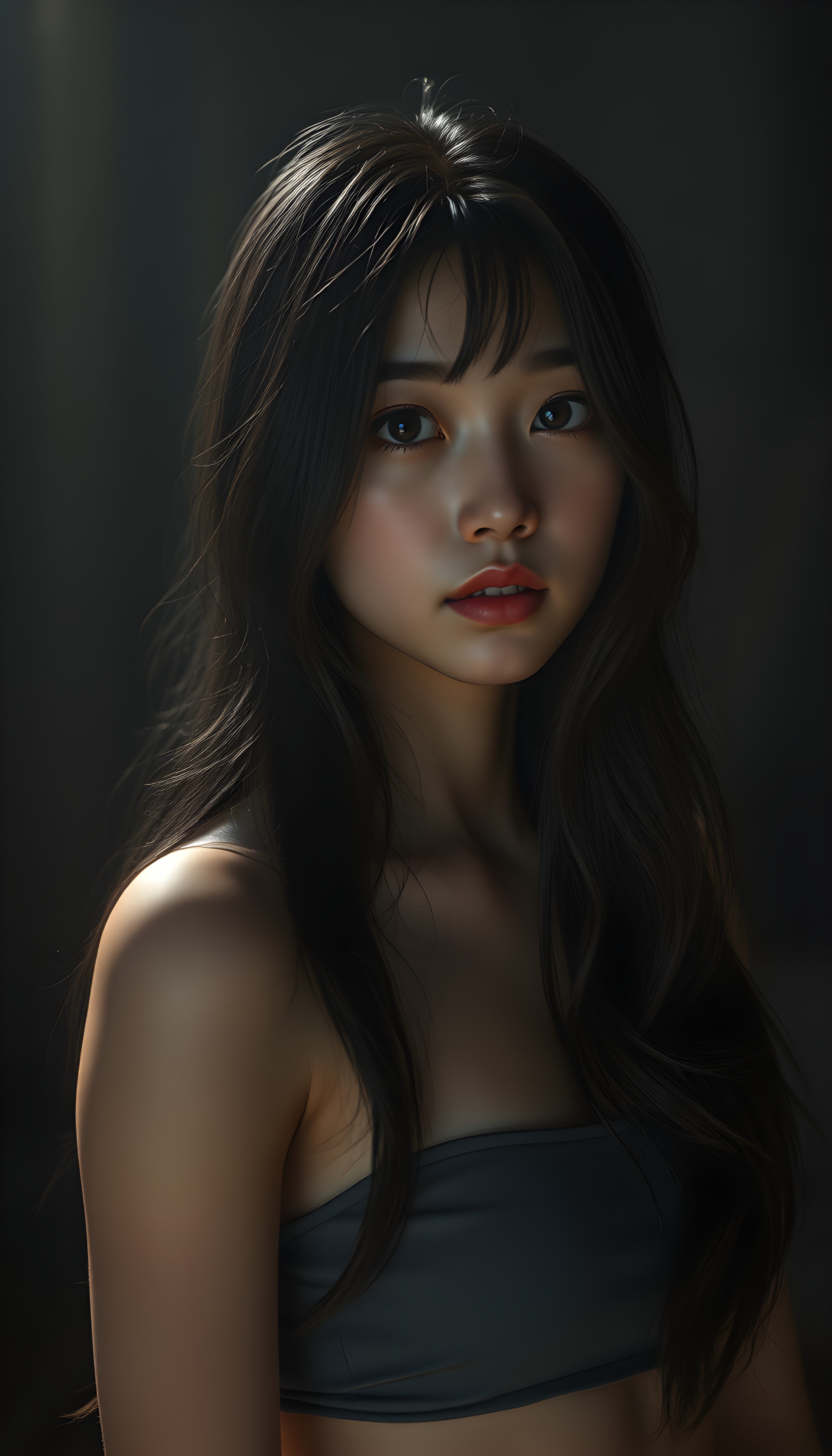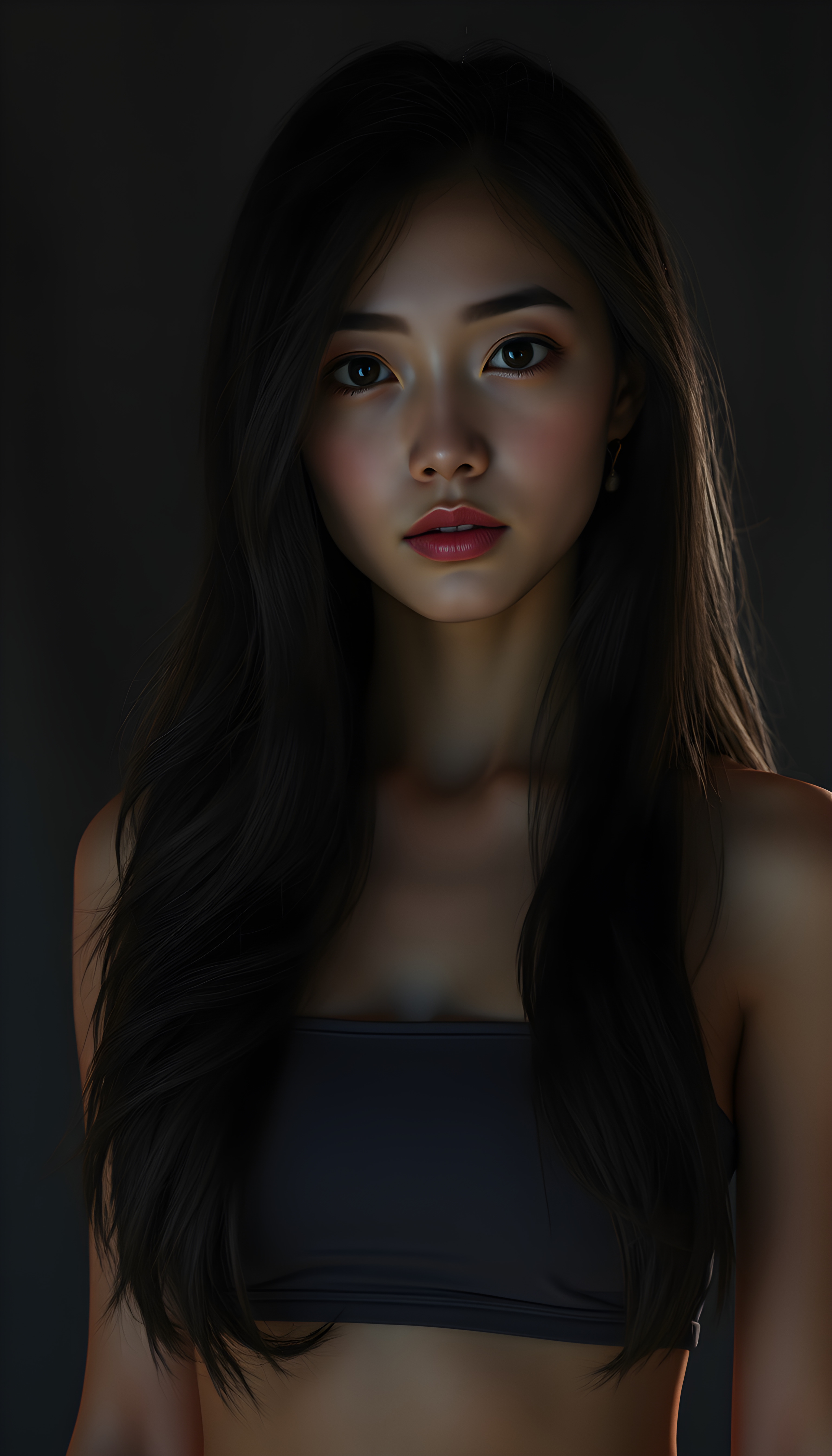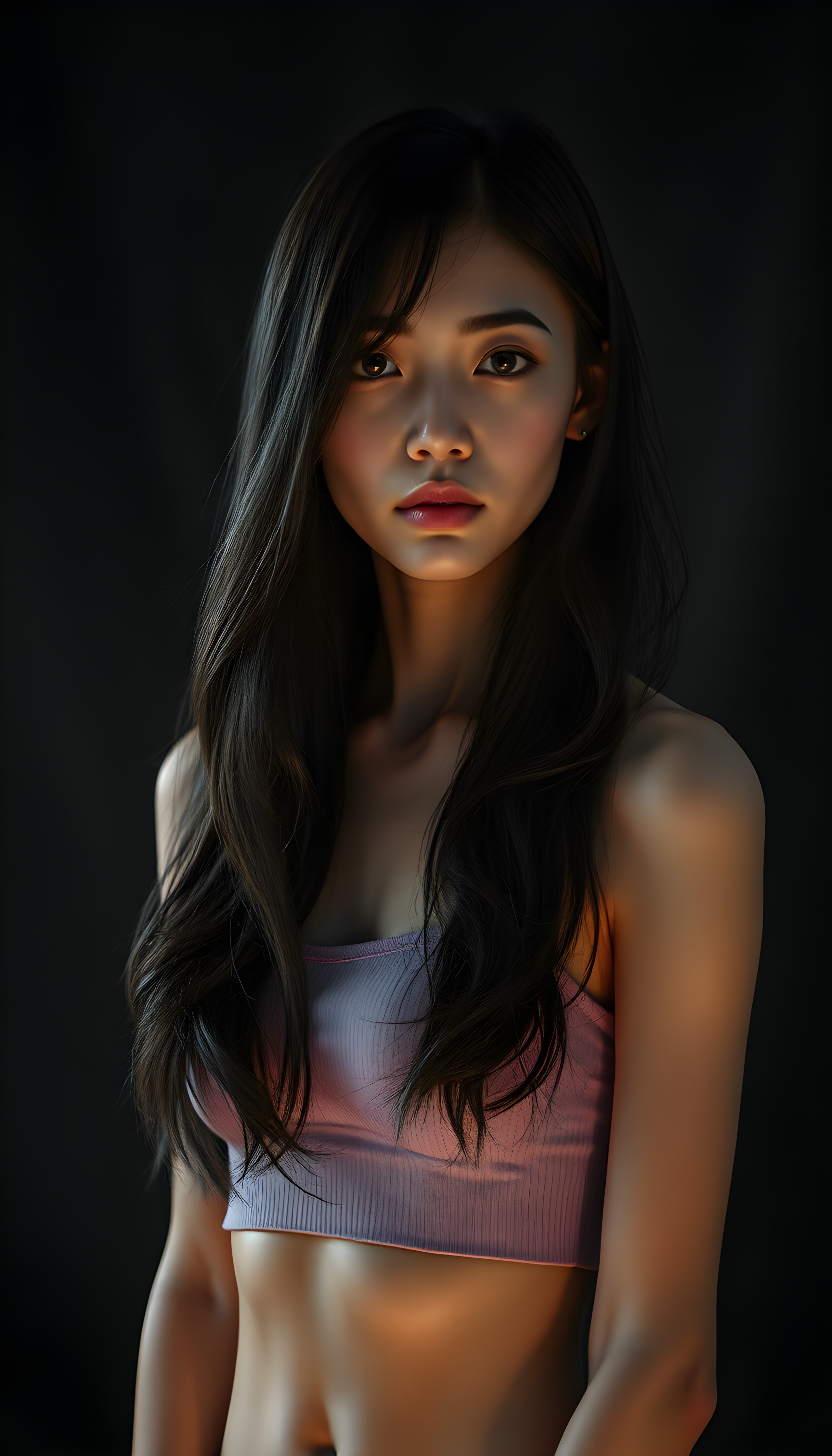 A breathtakingly detailed 3D render of a beautiful Asian girl with long, thick, wavy black hair cascading over her shoulders. She wears a short, cropped tank top and stands in a dark, moody setting illuminated by volumetric lighting that highlights her natural features and stunning eyes. The background is a dark, textured canvas that contrasts with her illuminated face, creating a dramatic and ethereal atmosphere. Her flawless anatomy is meticulously rendered, showcasing a blend of realism and artistic flair. The scene is enhanced with soft, diffused lighting that adds depth and dimension to the composition, making her appear lifelike and captivating.