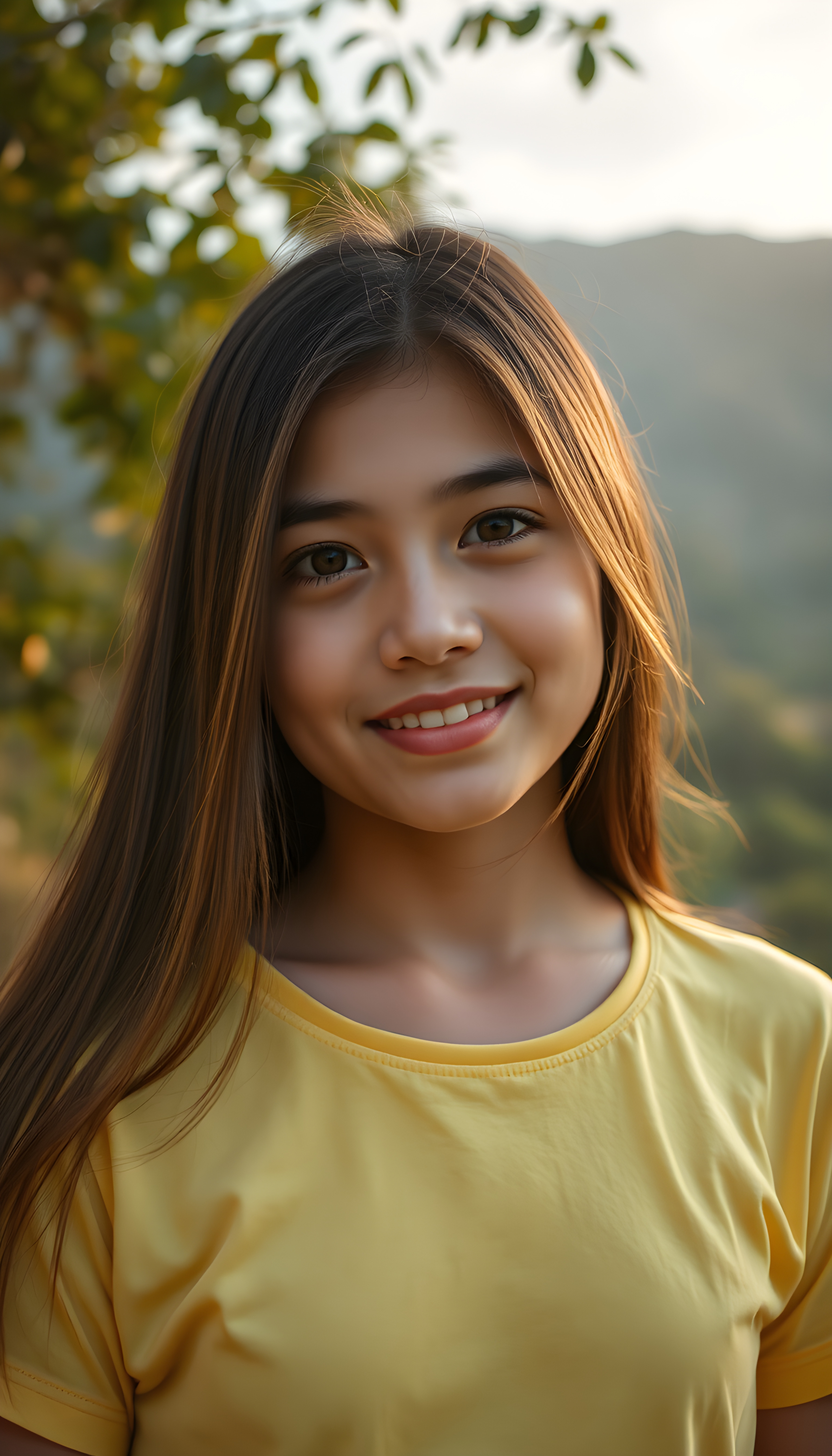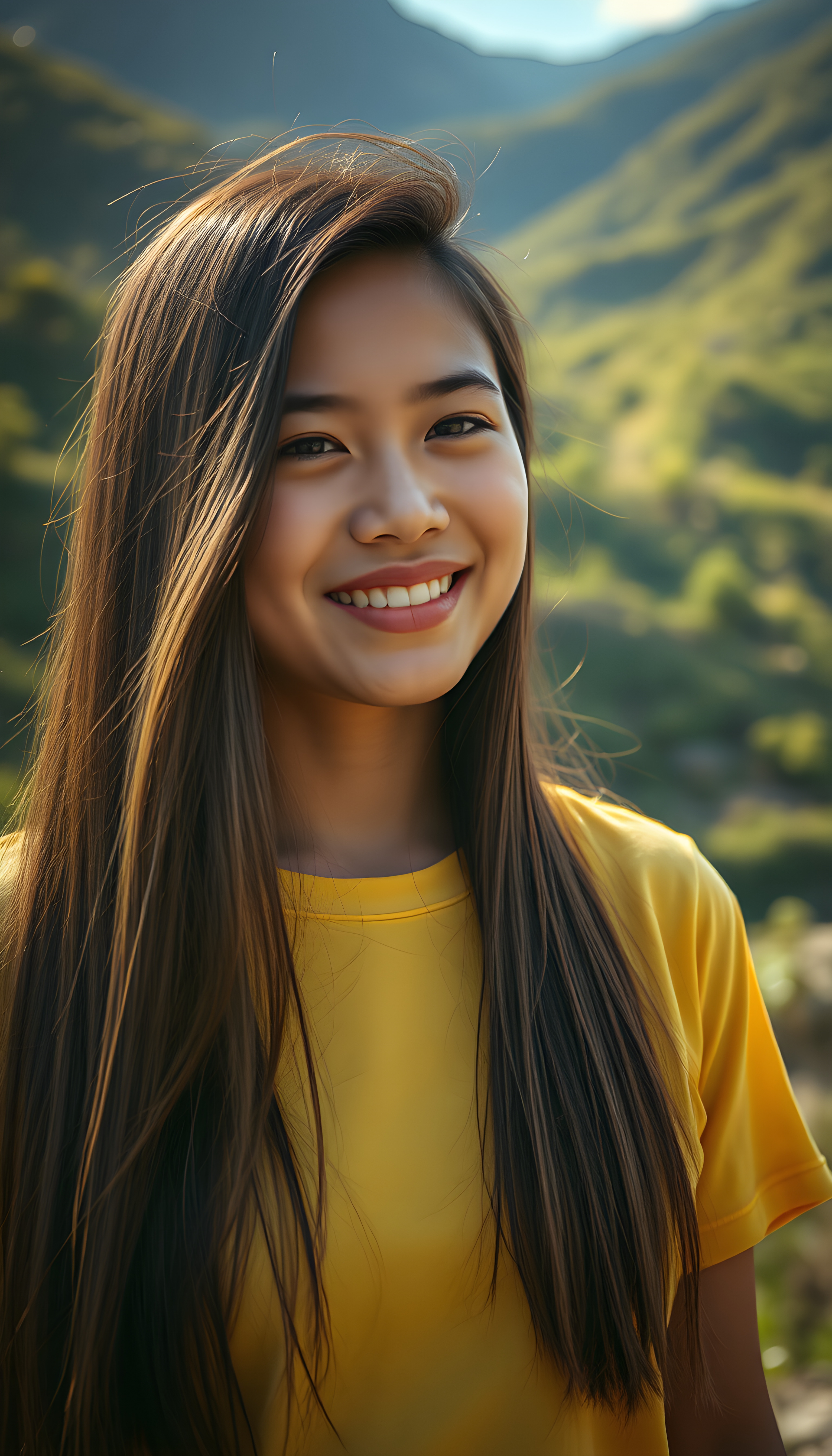 A stunning Latino girl with long, flowing straight brown hair. She wears a yellow T-Shirt. The background showcases a lush, green Andean landscape with mountains in the distance. The lighting is warm and golden, casting a joyful, inviting atmosphere. The style is whimsical and colorful.