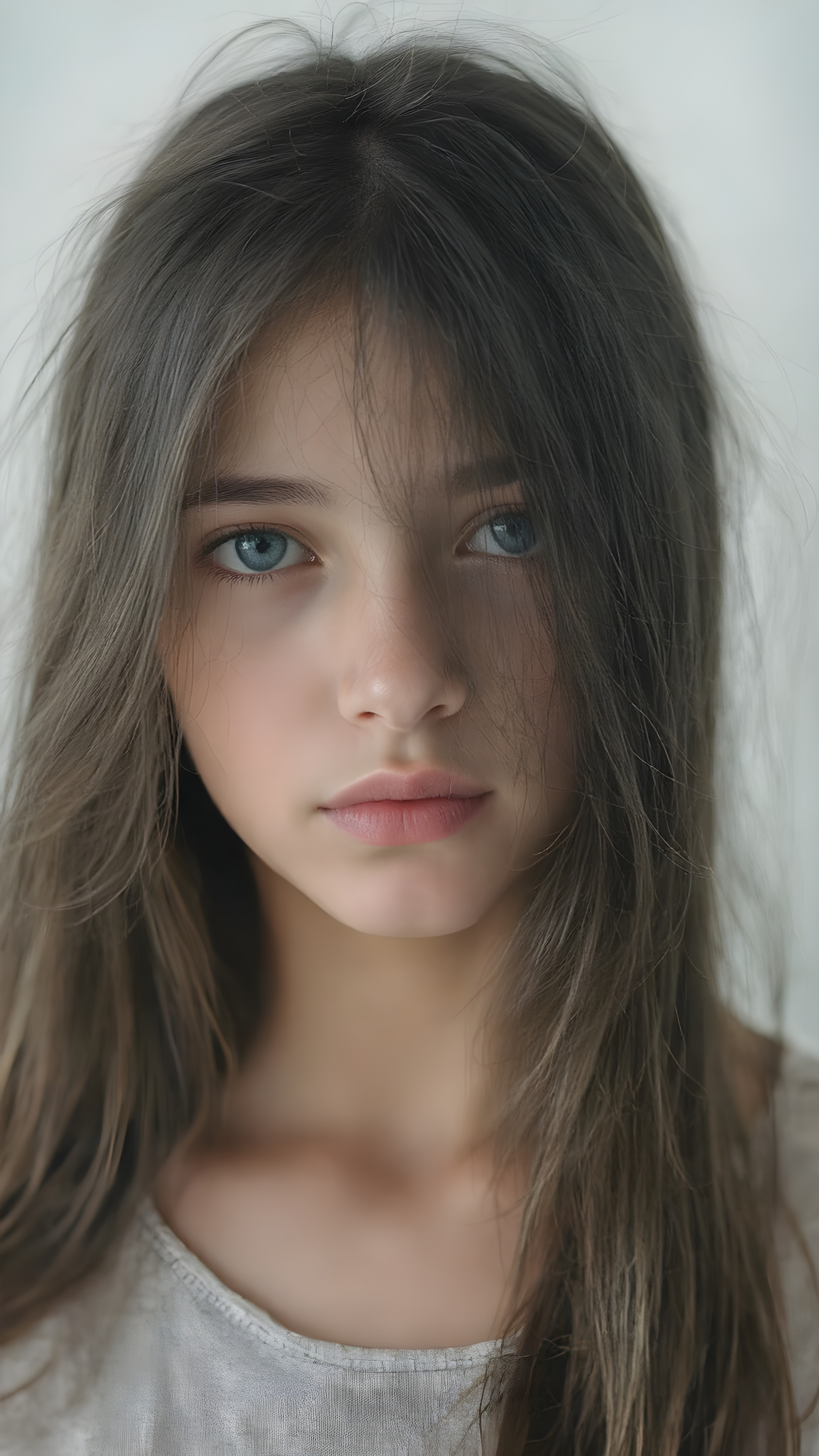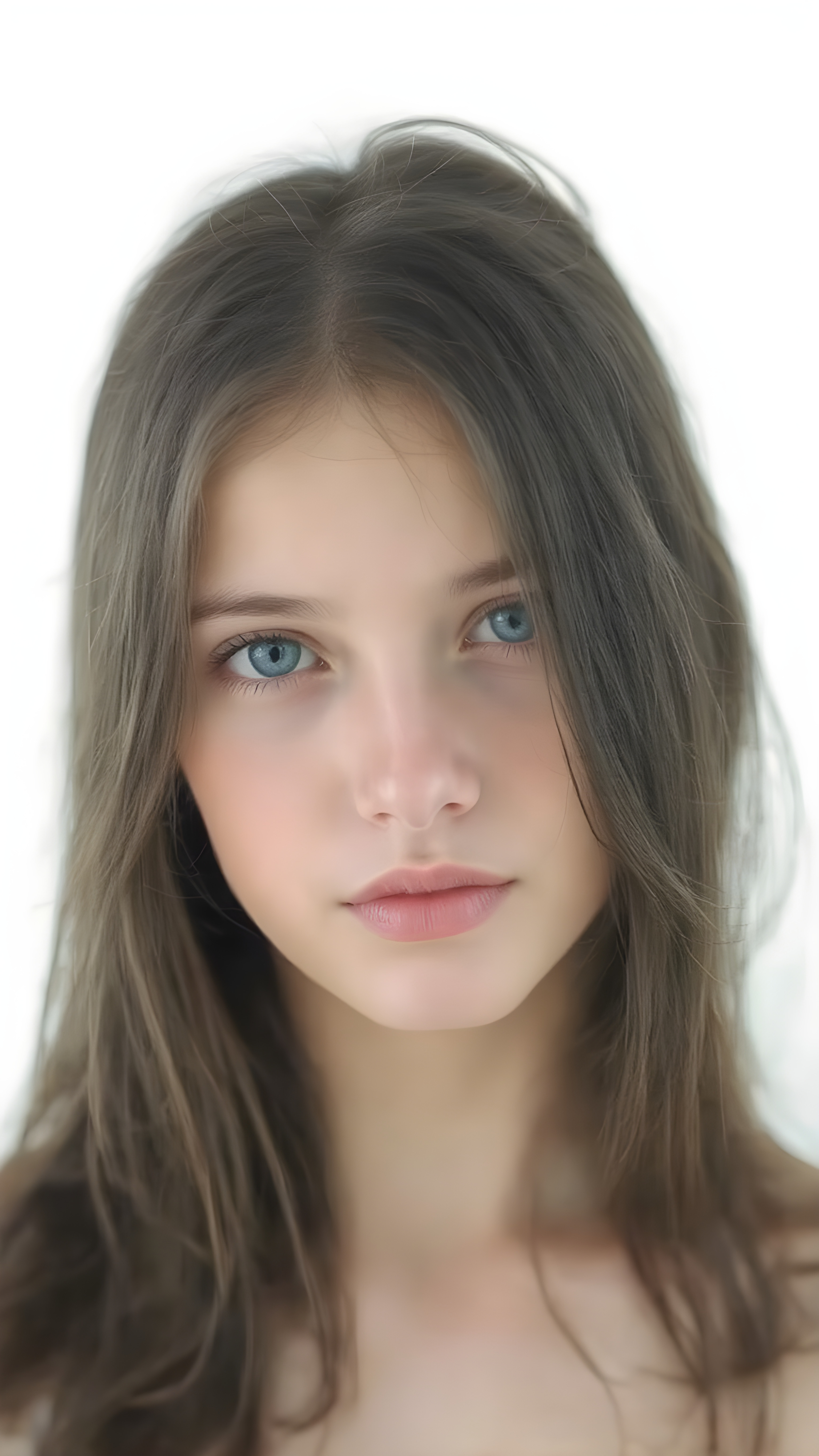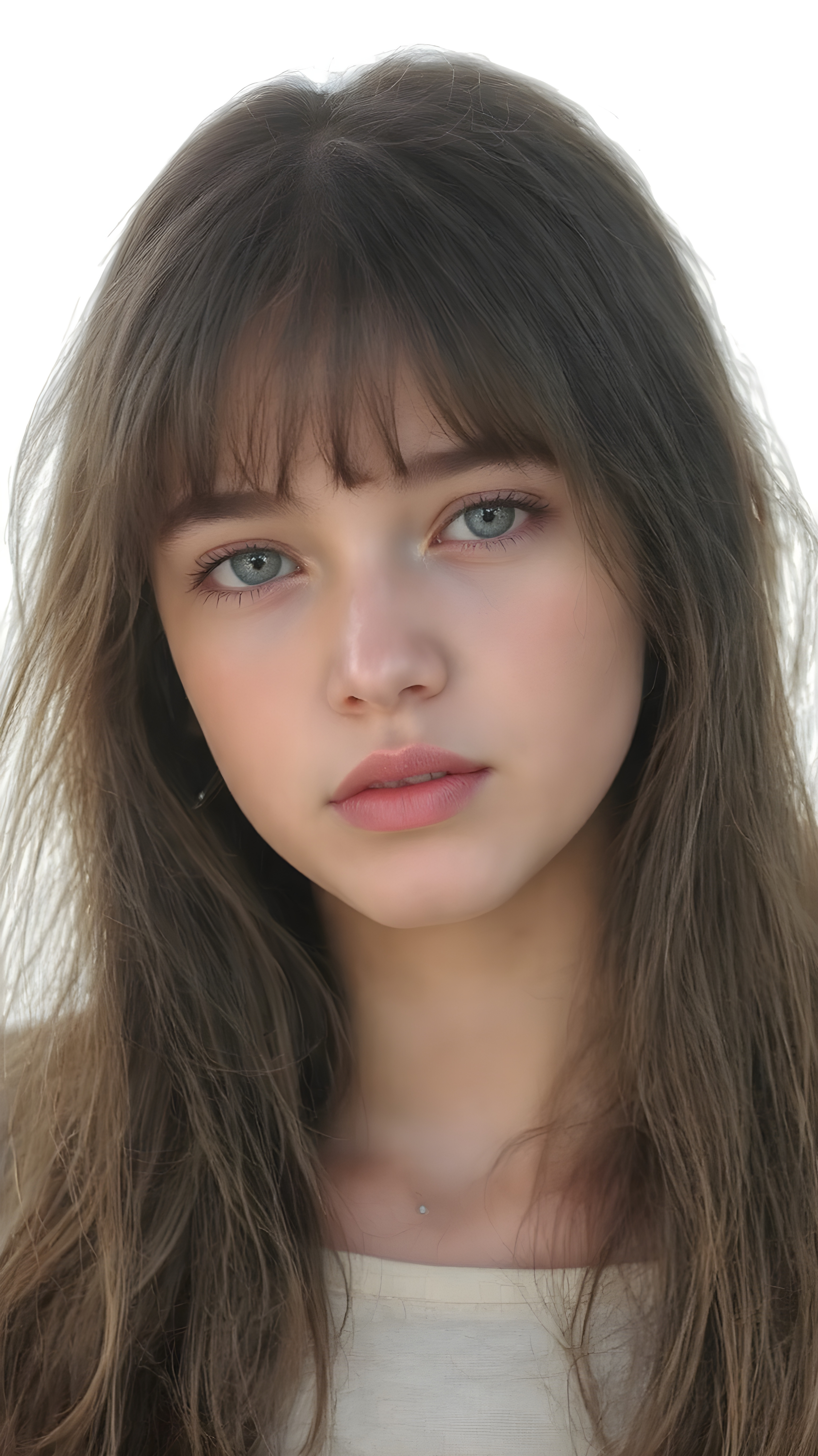 a ((natural teen girl)) realistic upper body portrait shot, her soft hair is obsidian-black and long, she has glancing silver-white eyes and are orbit round, she has pouting lips, she has a soft outlook, she has a fit figure, in a natural way, white backdrop