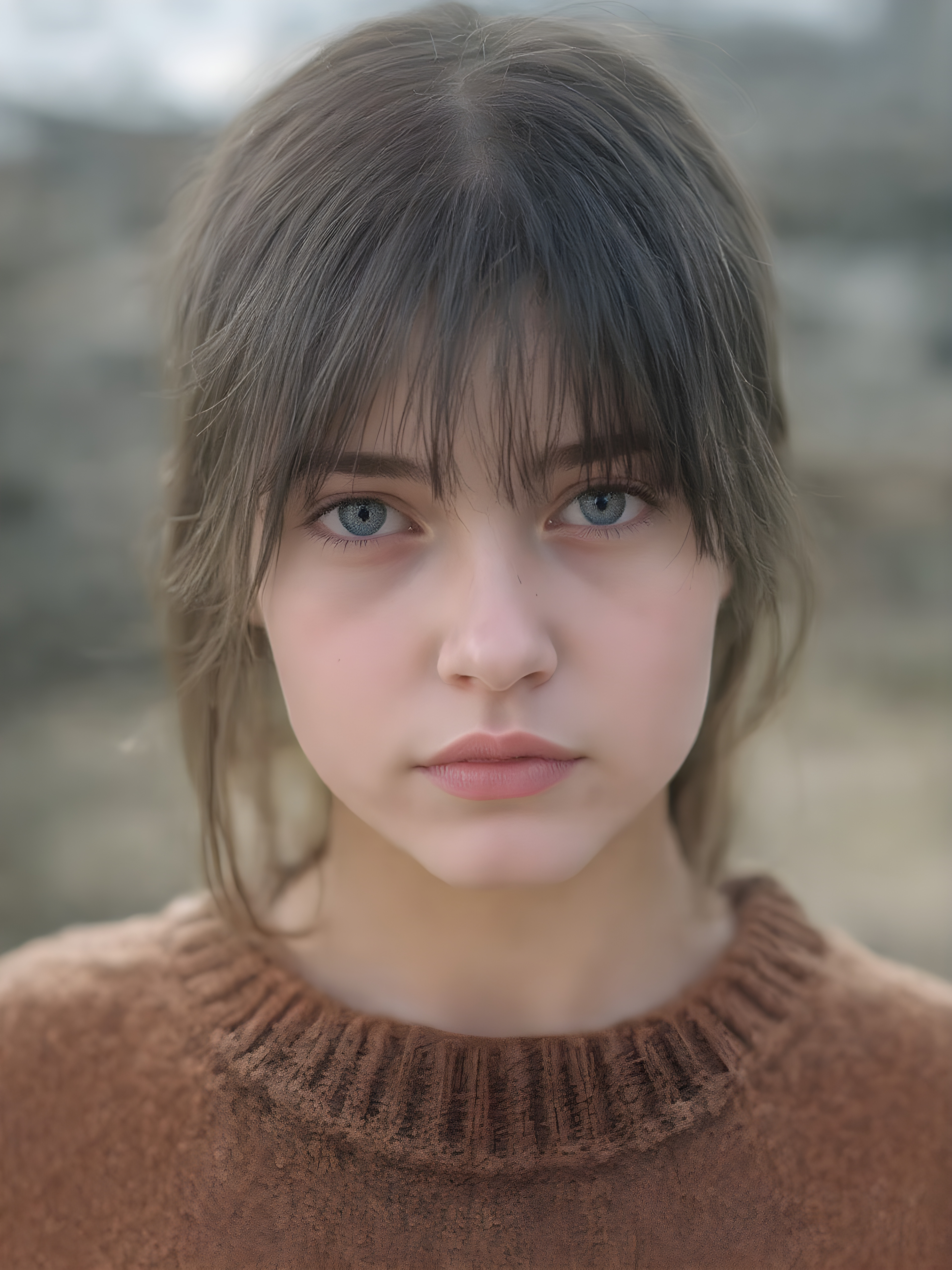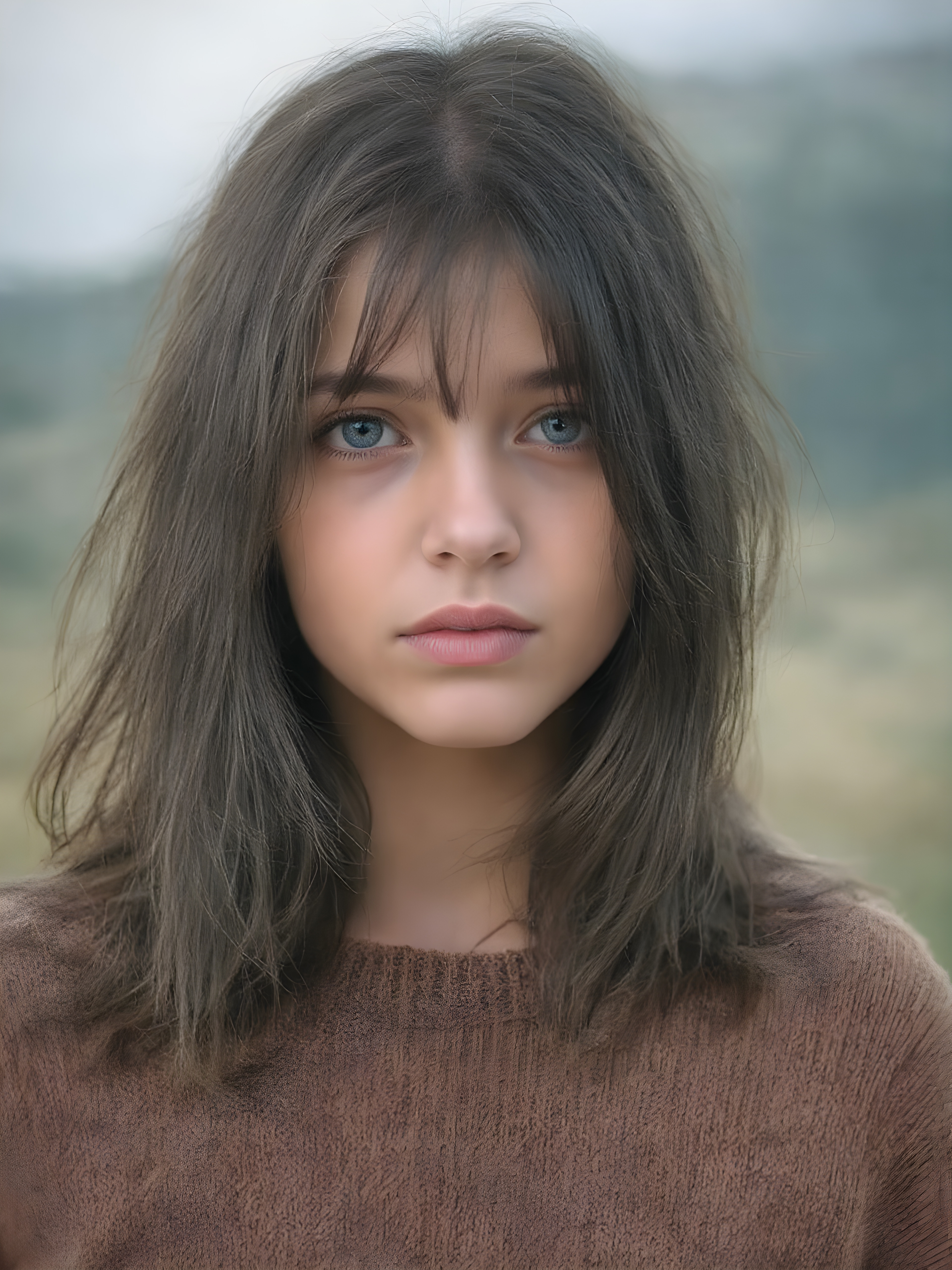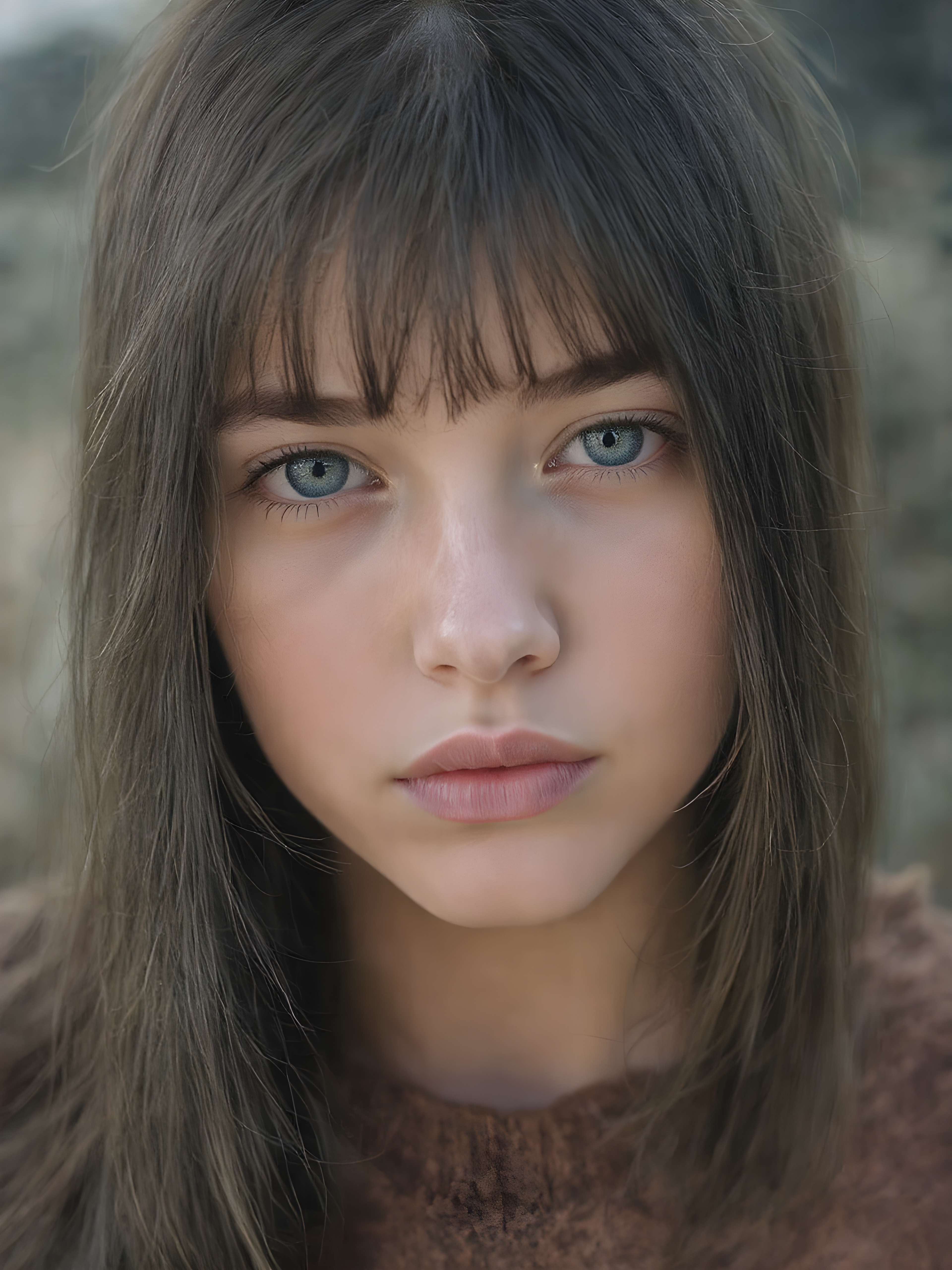 a ((teen girl)) realistic upper body portrait shot, her hair is obsidian-black and with long straight haircut, she has glancing silver-white eyes and are orbit round, she has pouting lips, she has a soft outlook, she has a fit figure, she wears a brown sweater made of fine wool, in a natural way, mood scenery background