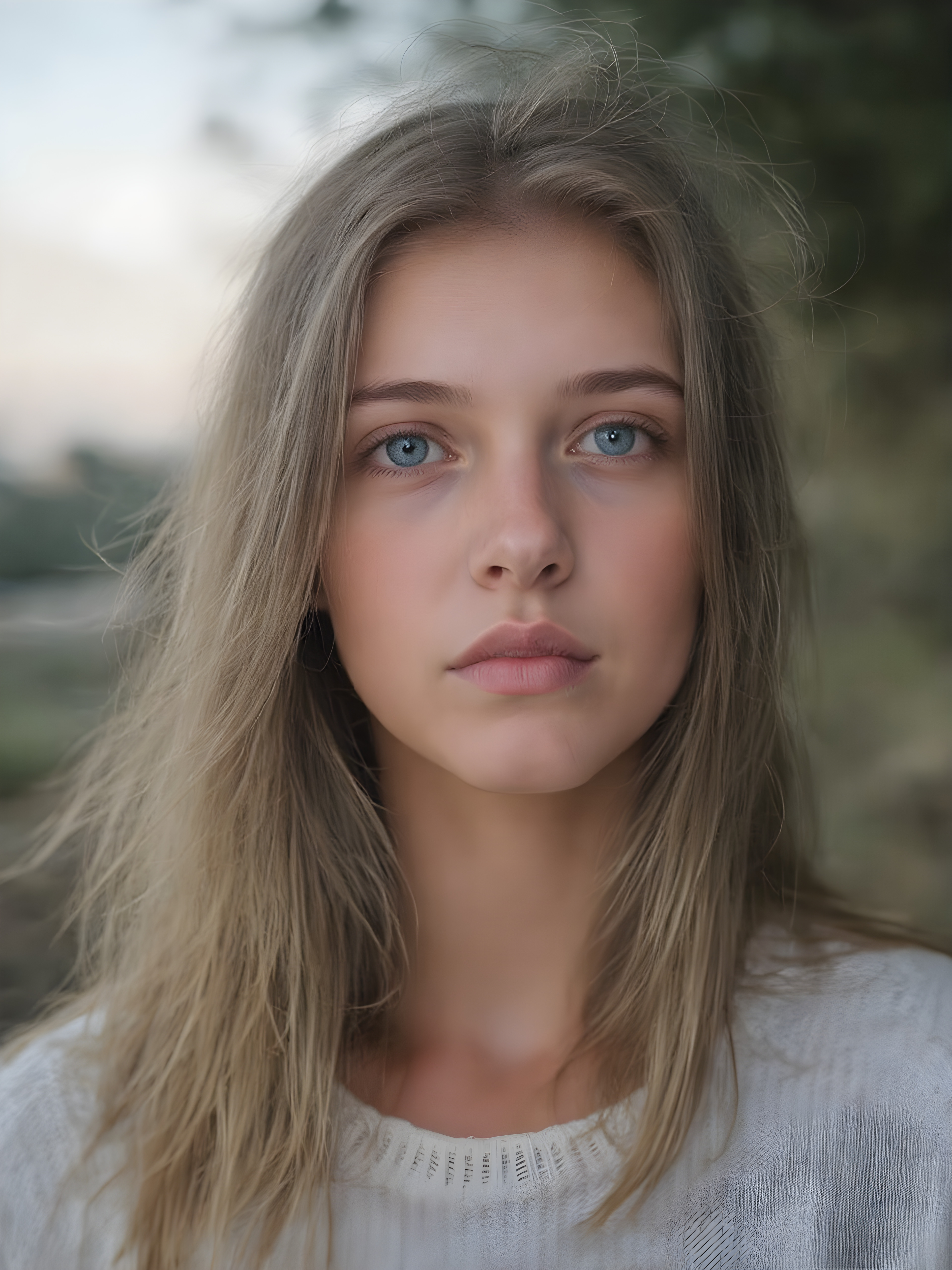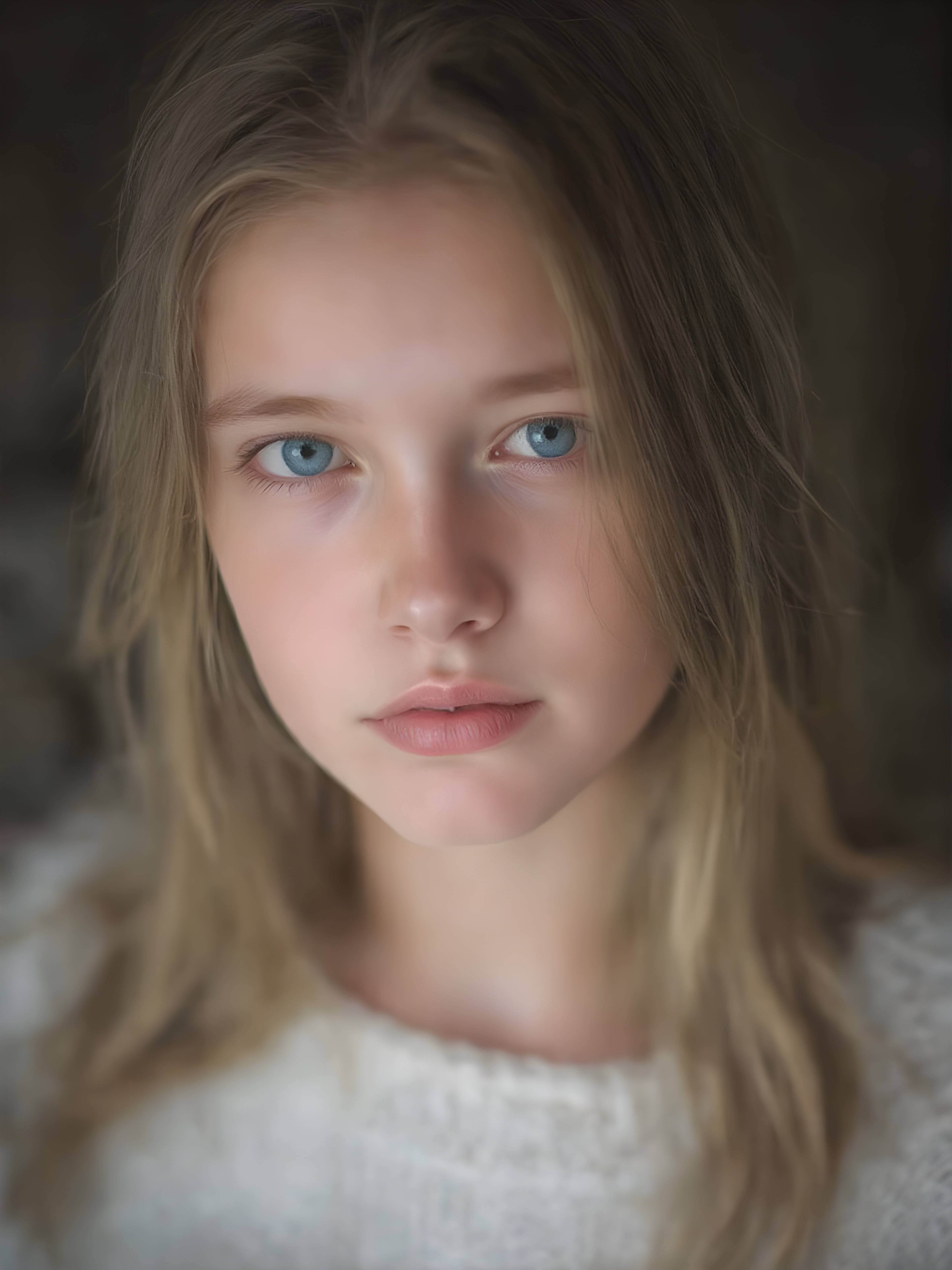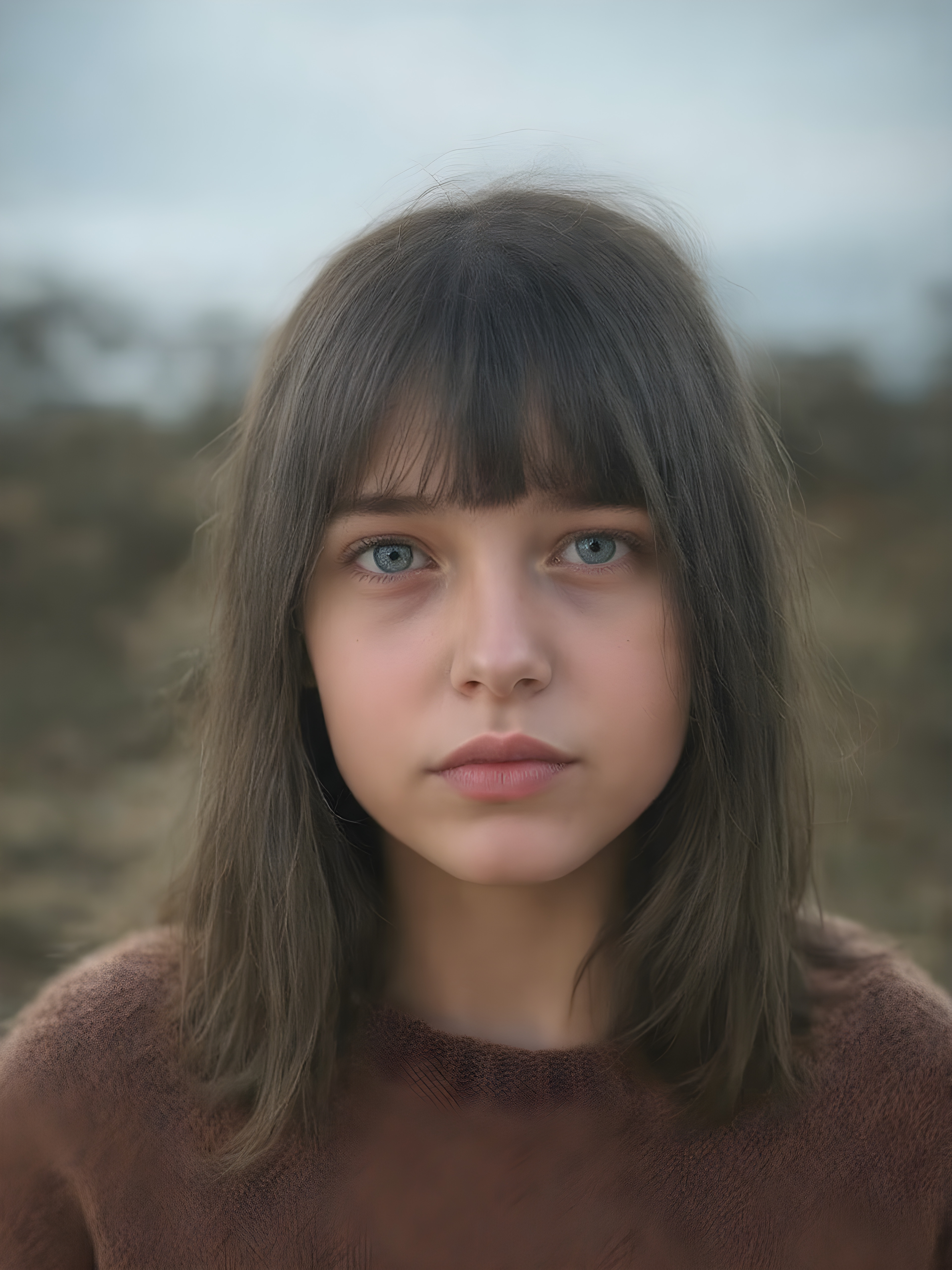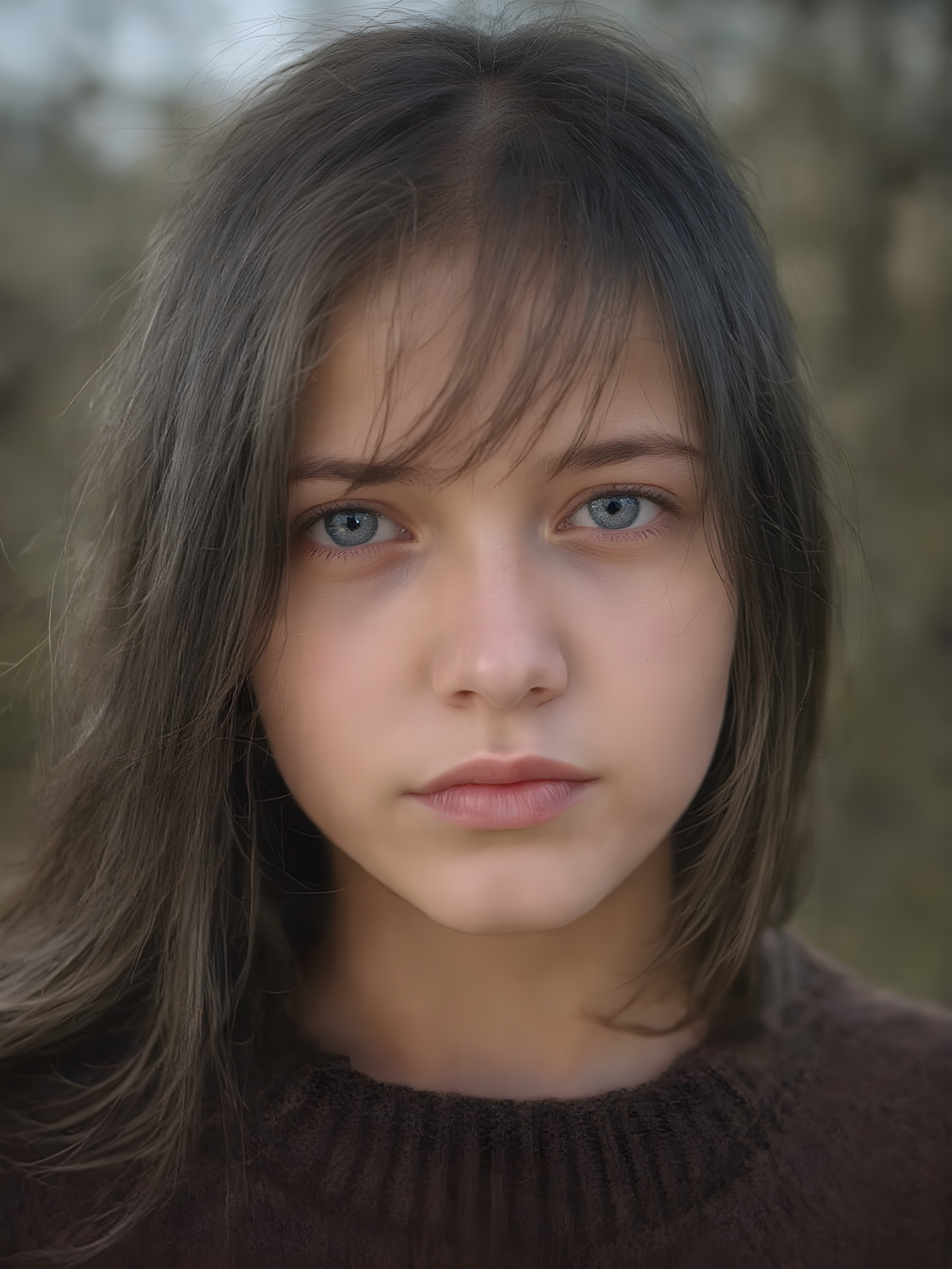 a ((teen girl)) realistic upper body portrait shot, her hair is obsidian-black and with long straight haircut, she has glancing silver-white eyes and are orbit round, she has pouting lips, she has a soft outlook, she has a fit figure, she wears a brown sweater made of fine wool, in a natural way, mood scenery background