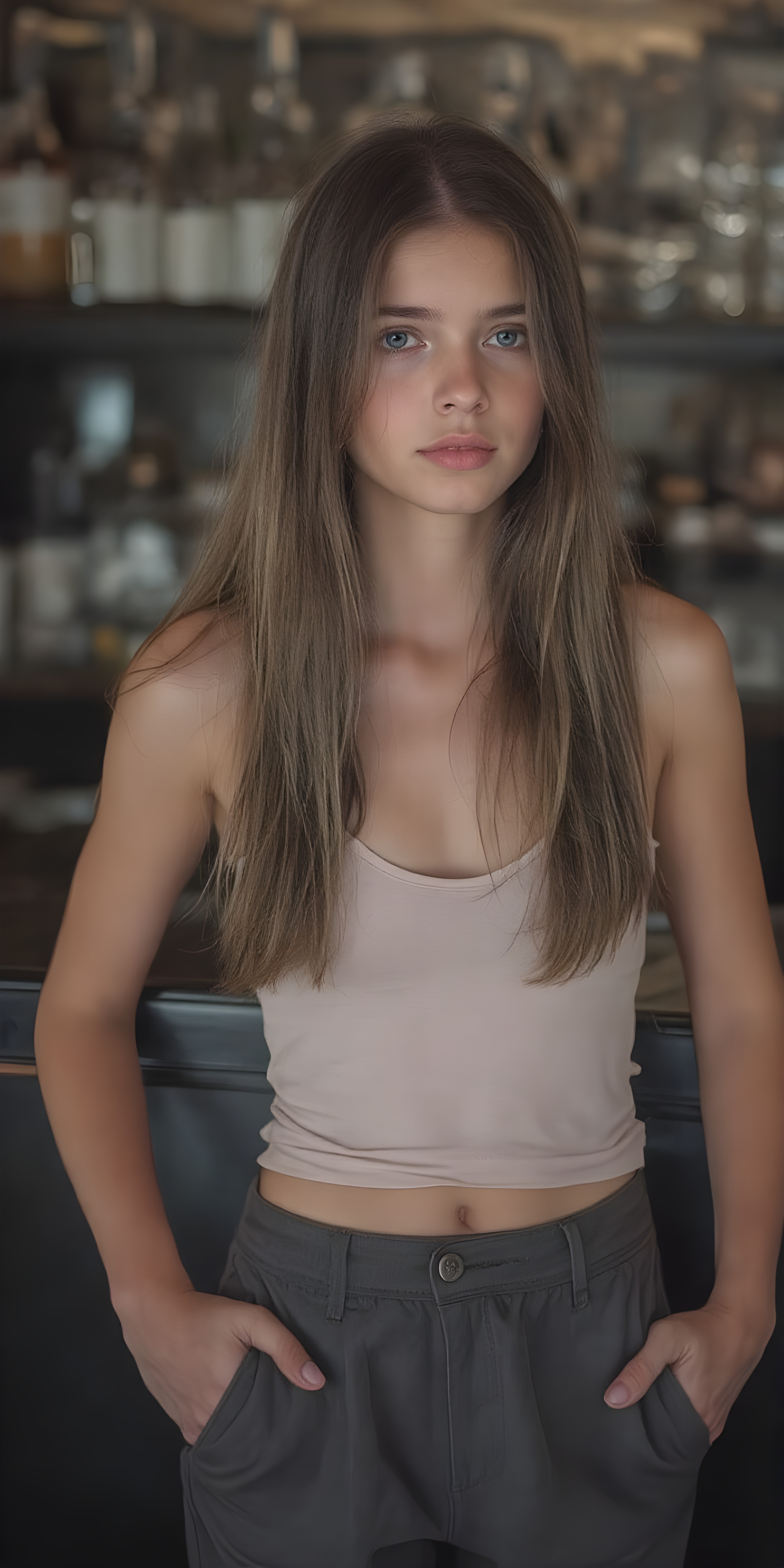 a sleek (((full body image))) of a (((beautiful young teen girl))), (((elegantly thin and petite))), with flowing, (((short, tight tank top and loose, cozy pants))), that perfectly complements her youthful complexion, emphasizing her (((perfectly straight, long, thick, untucked natural brown hair))) (((falling gently over her shoulder))) in a modern, luxurious bar. She’s (((deep in thought, looking pensive and melancholy))) about her future, as if reflecting her (((full, amazing eyes))) into the camera’s eye, exuding an air of youthful realism