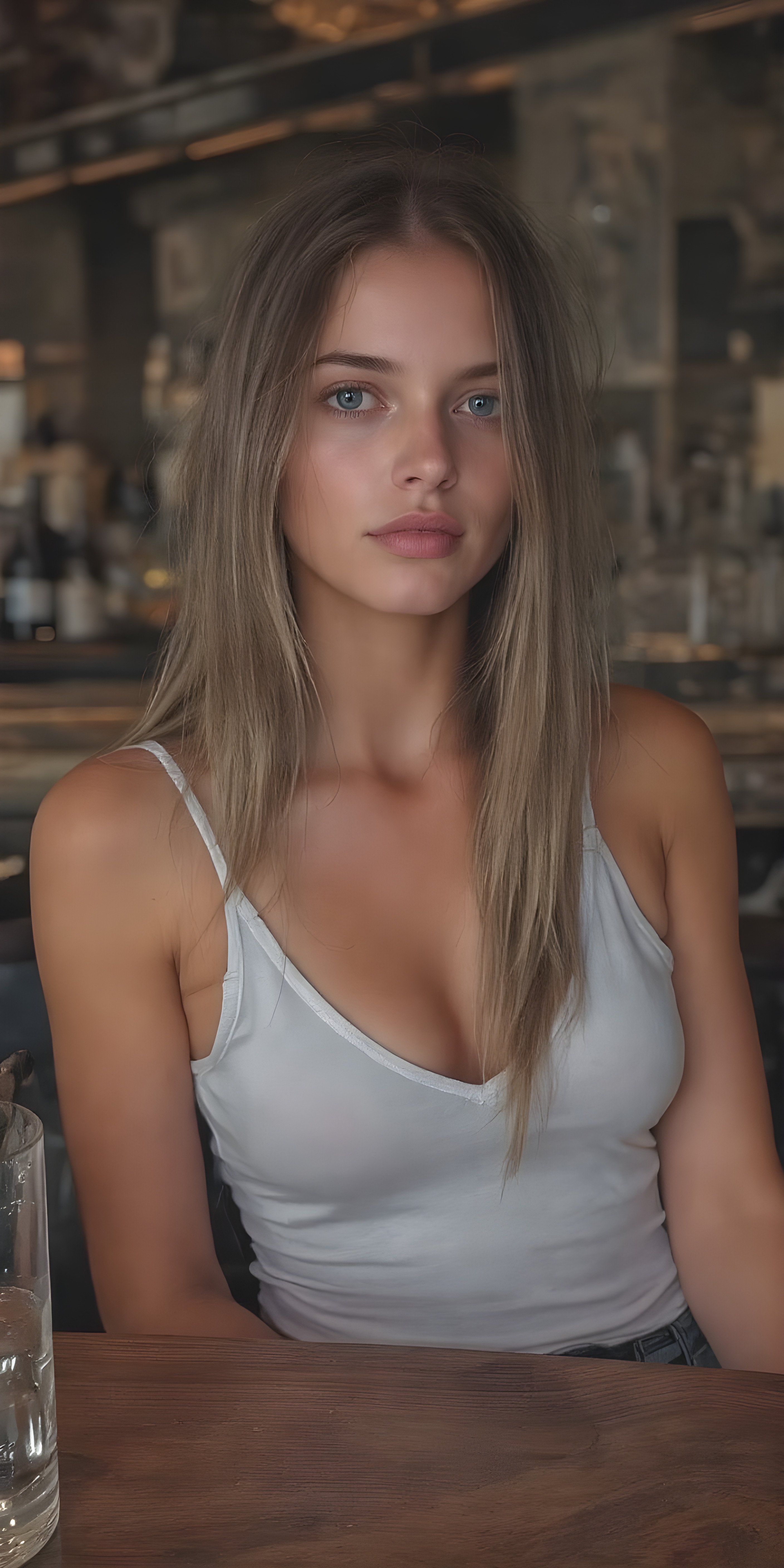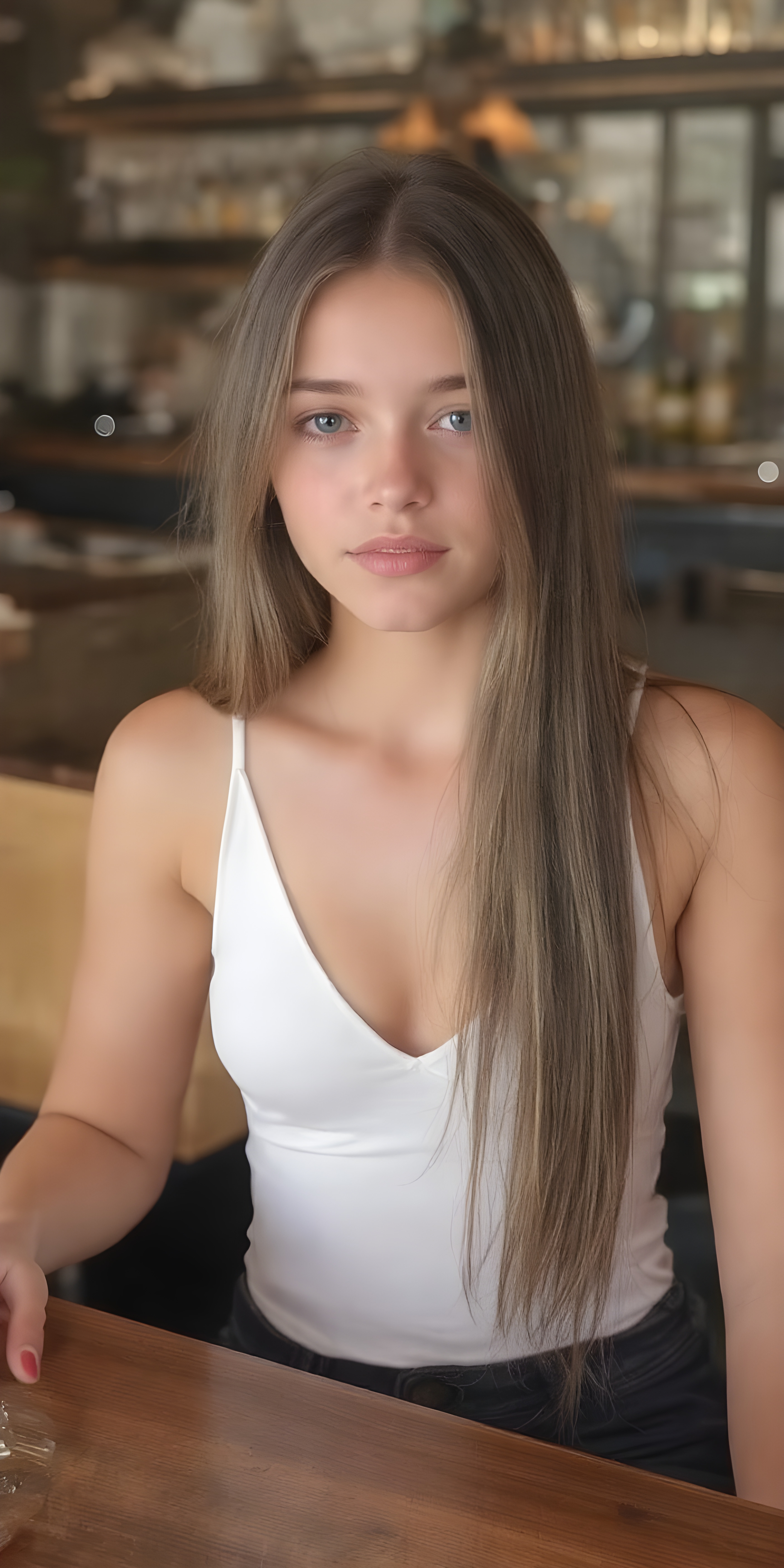 a young, elegantly thin and short dressed young teen girl, tank top, in white, sits at woody table in a modern bar, deep v-neck, busty, her long, straight hair falling gently over her upper body